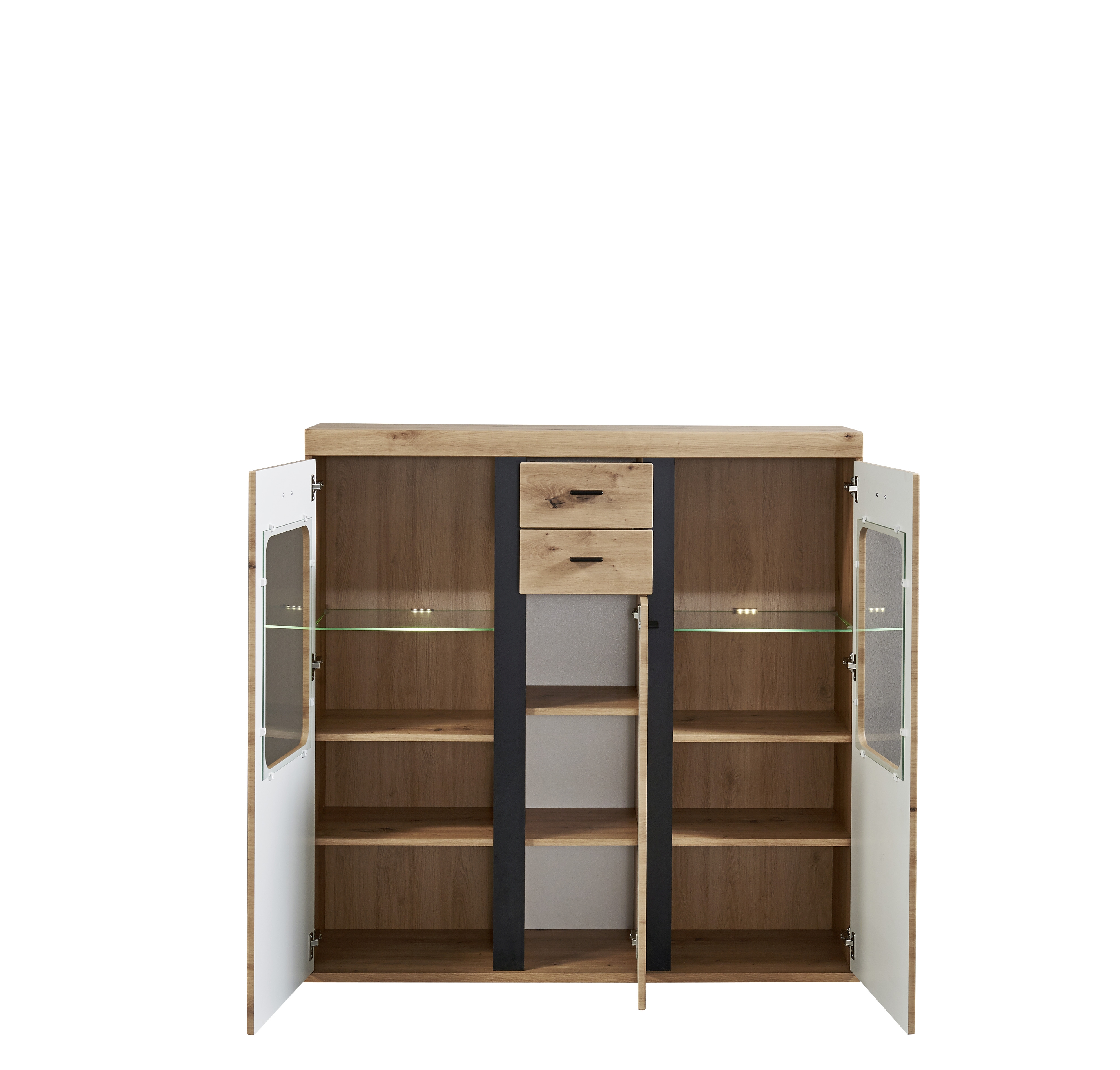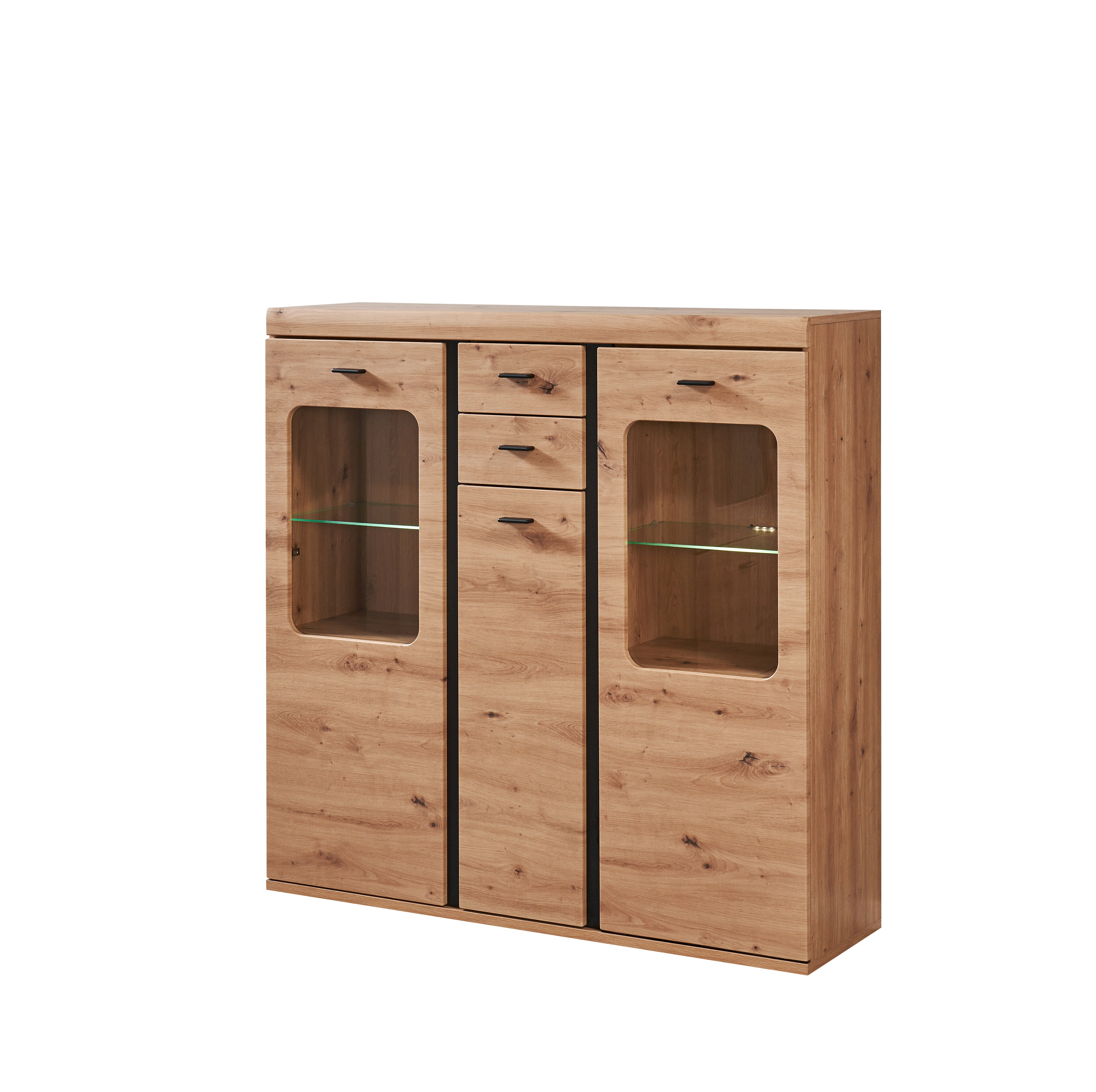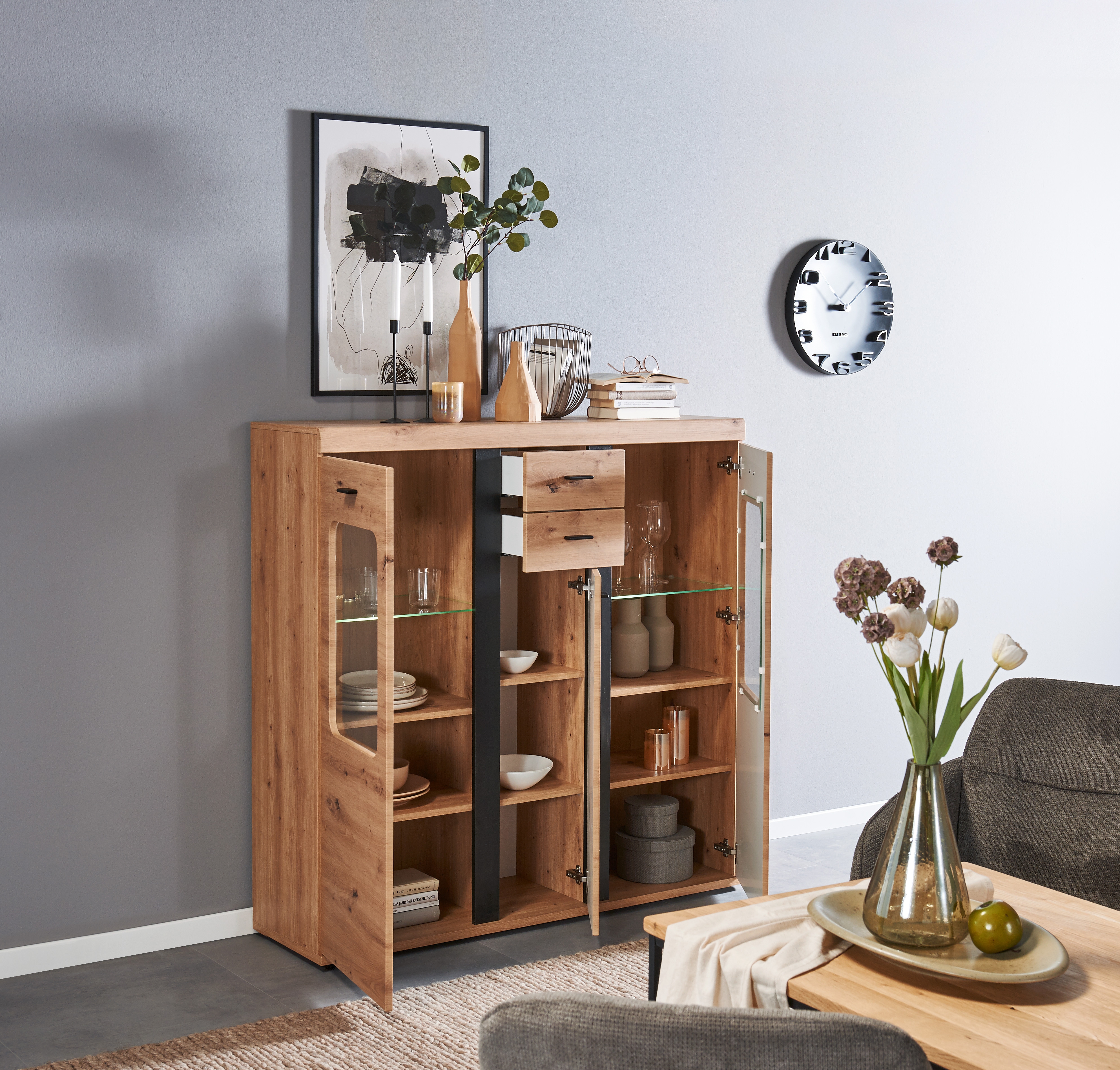 Façade : décor chêne Artisan, MDF (panneau de fibres de bois de densité moyenne) pelliculé avec contrastes ton noir (panneaux de particules mélaminés) / verre