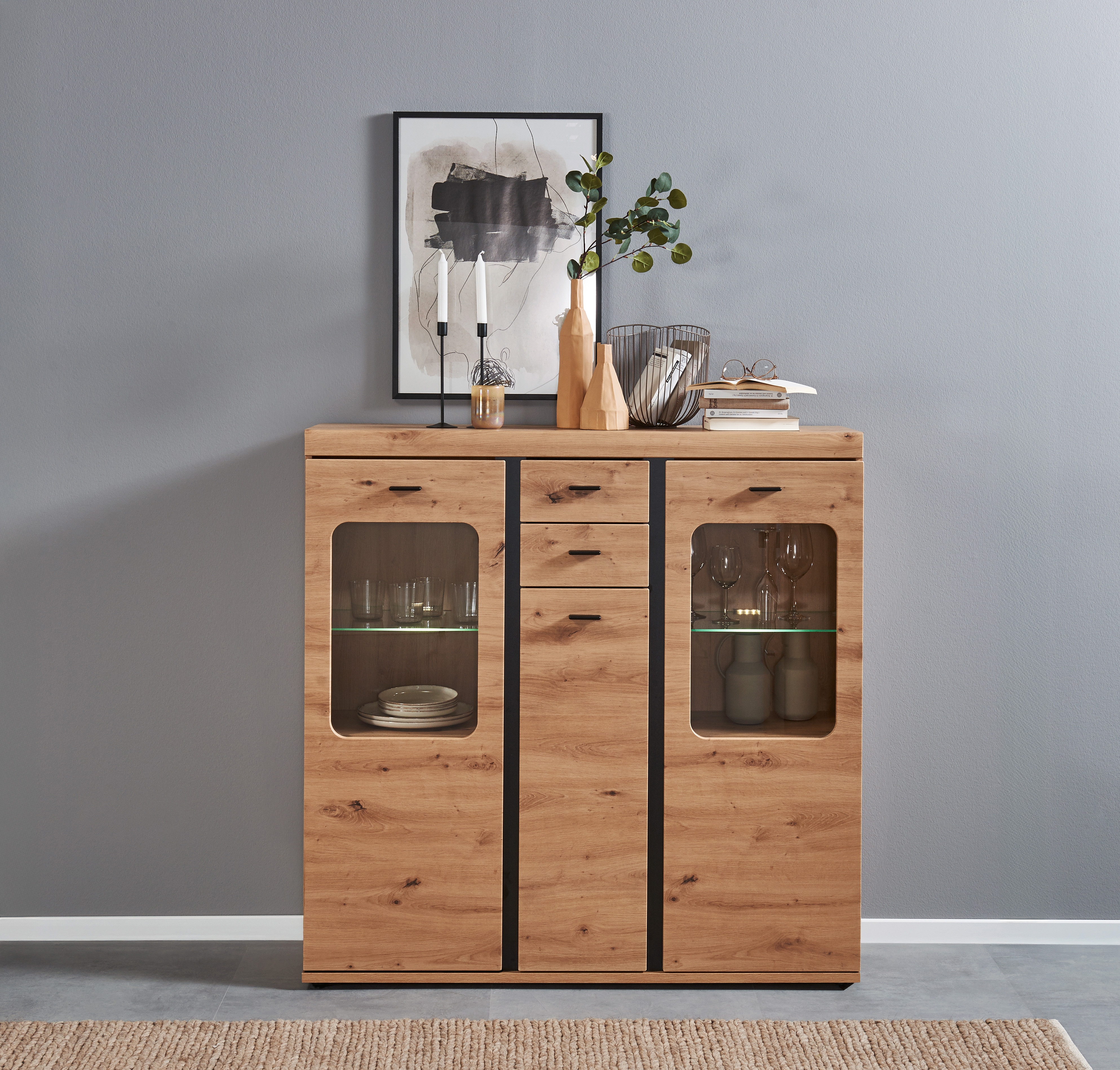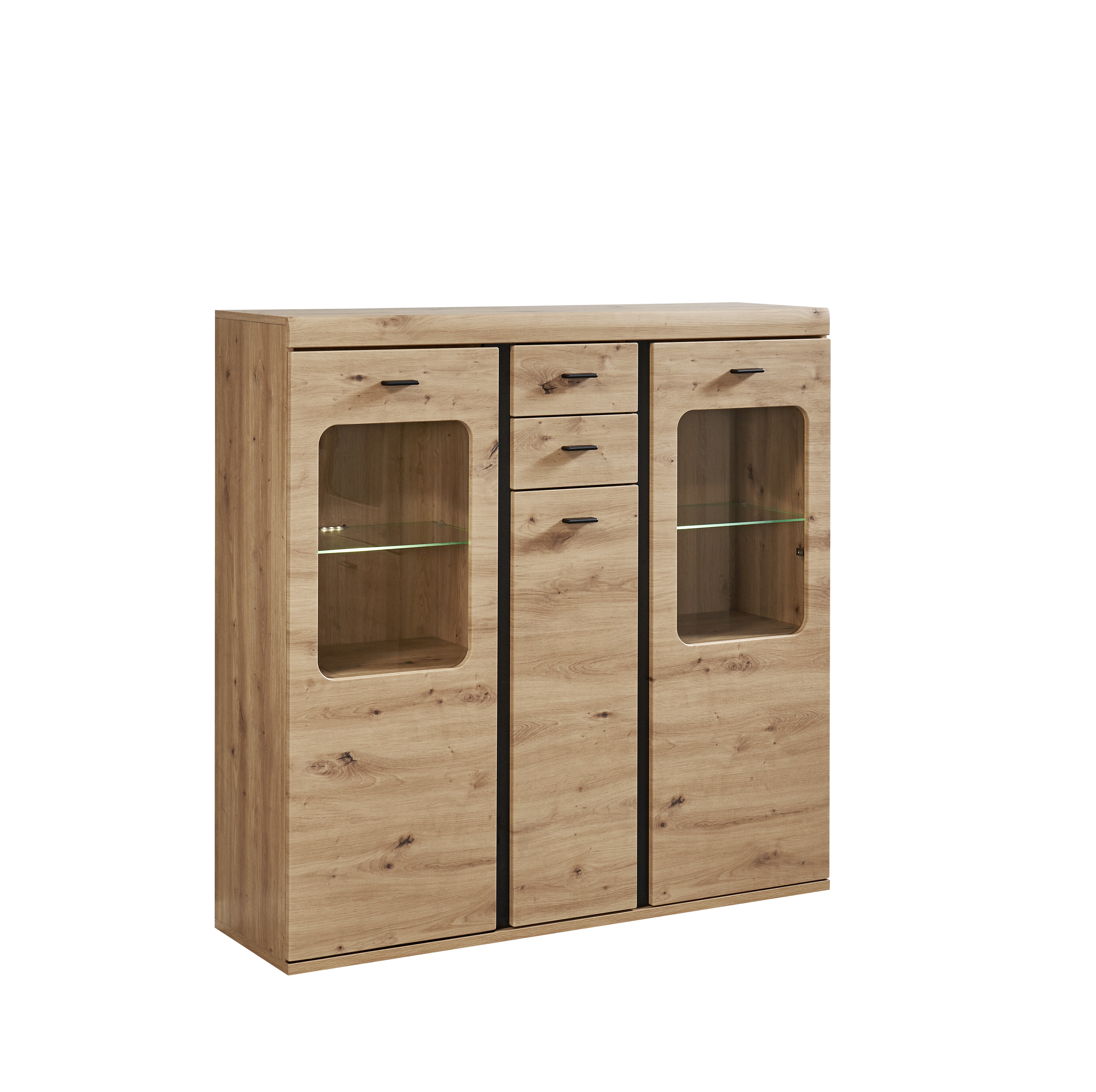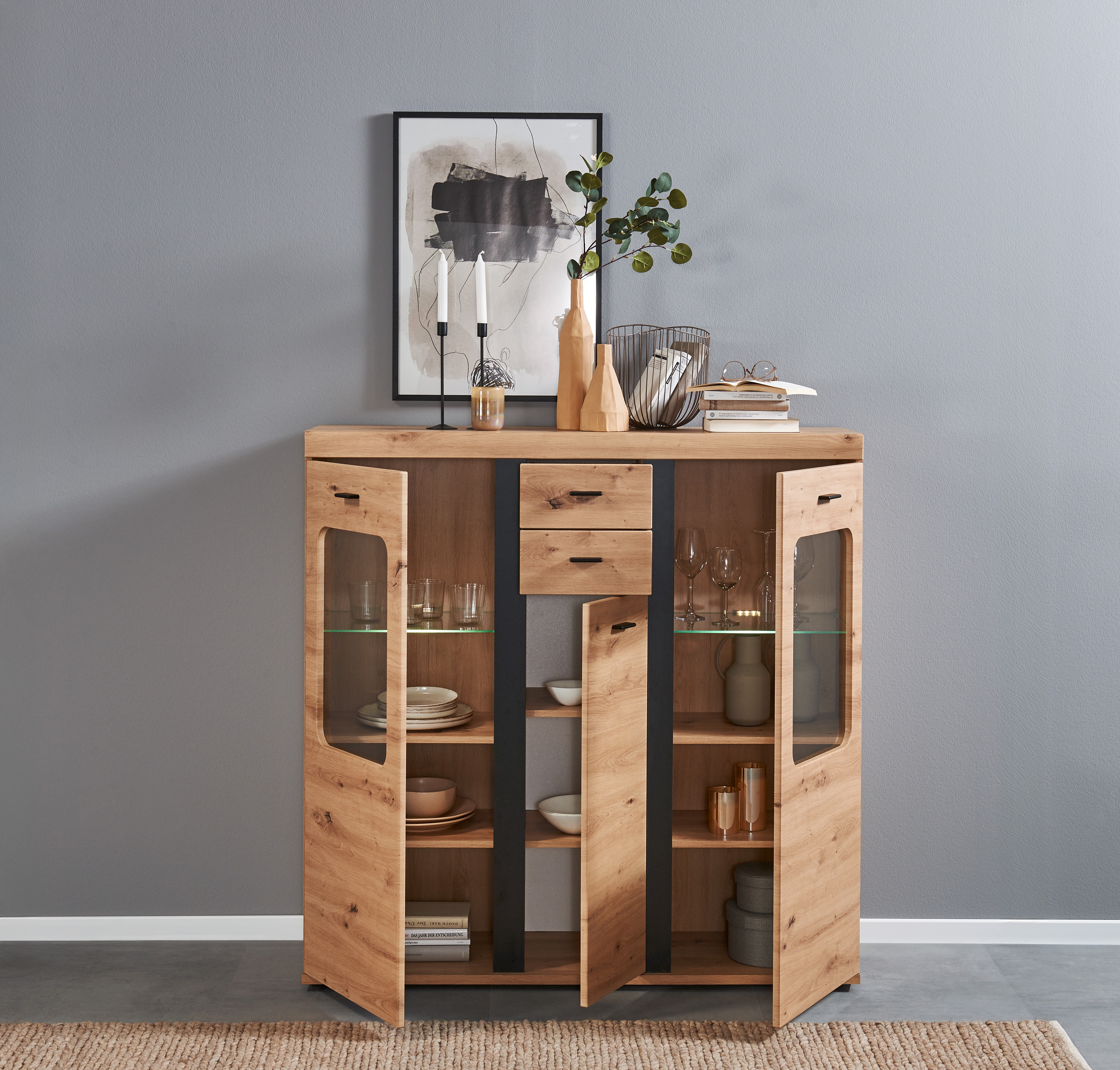 Façade : décor chêne Artisan, MDF (panneau de fibres de bois de densité moyenne) pelliculé avec contrastes ton noir (panneaux de particules mélaminés) / verre