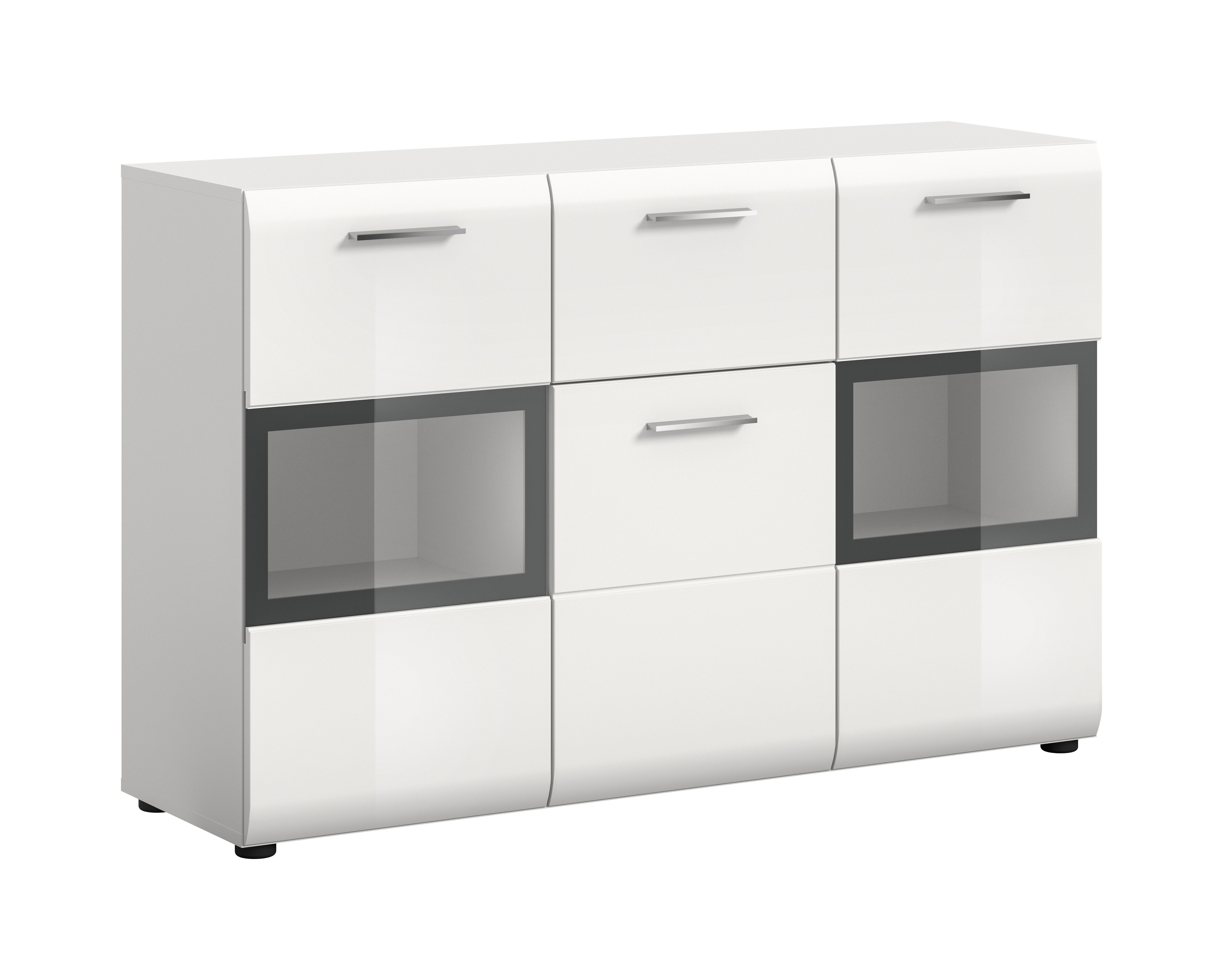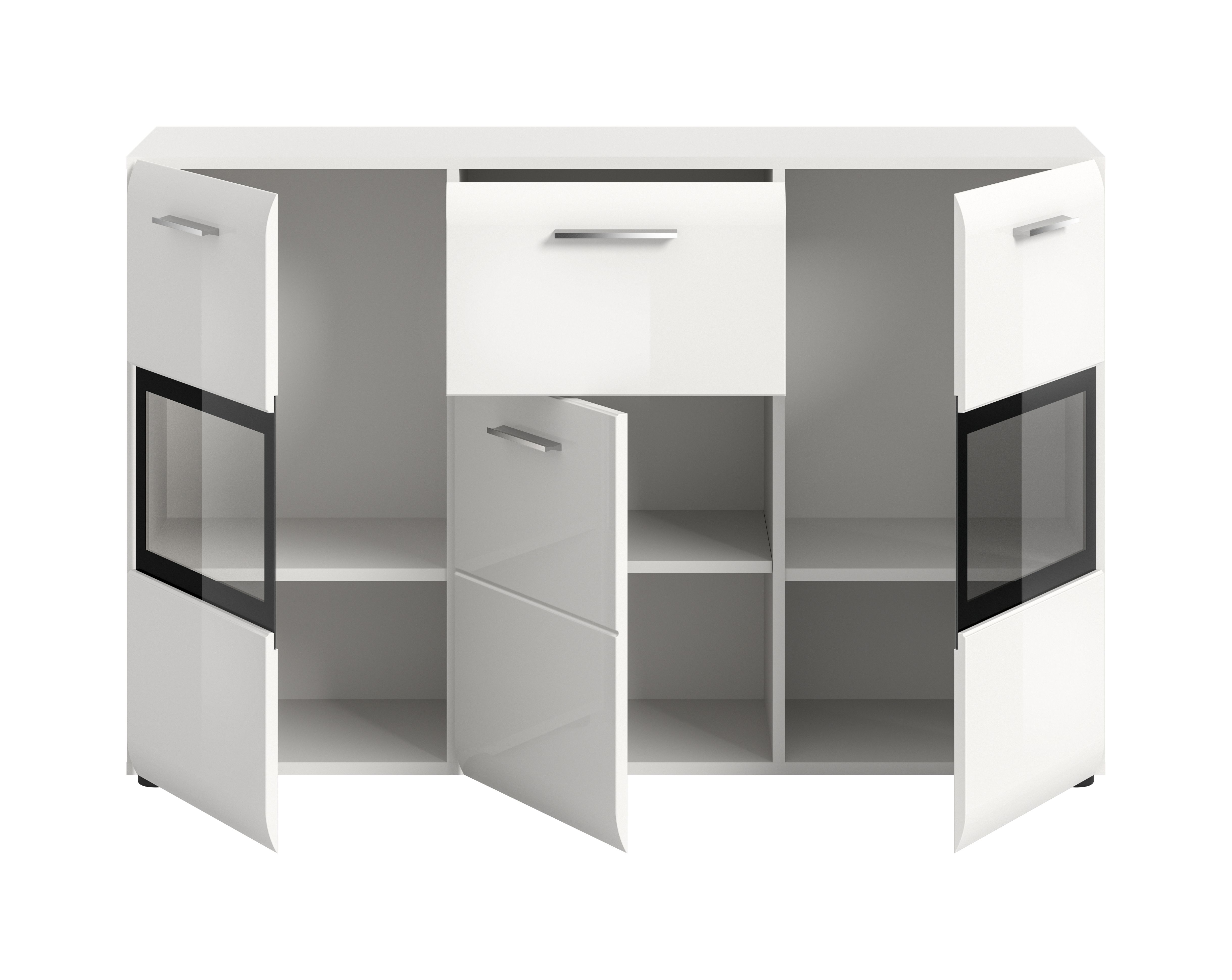 - 1 porte, 2 portes vitrées, 1 tiroir, 1 tablette amovible et réglable en hauteur, 2 tablettes fixes, 6 compartiments
