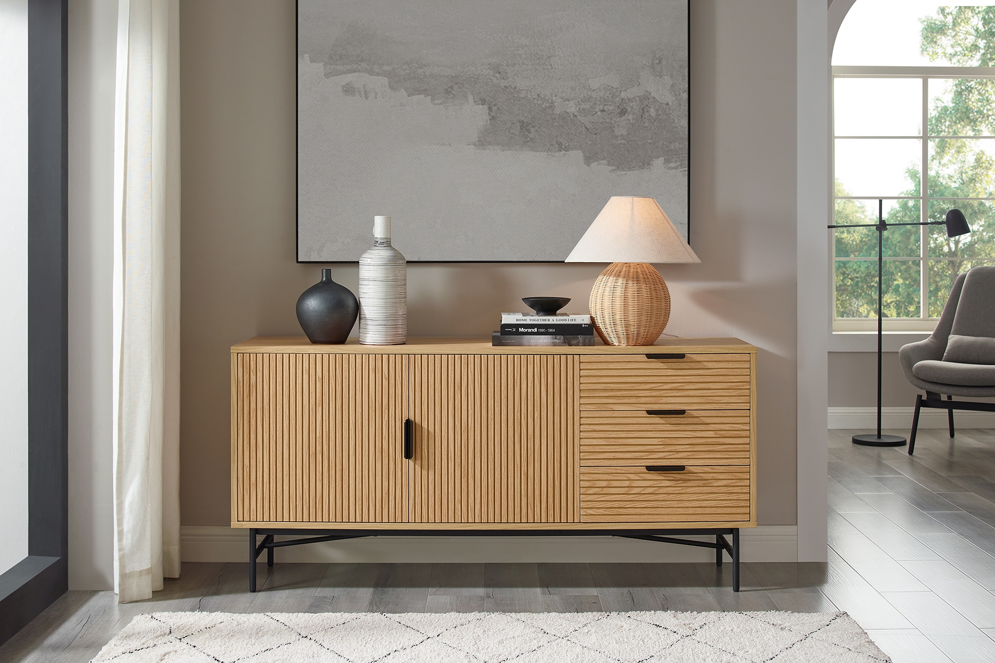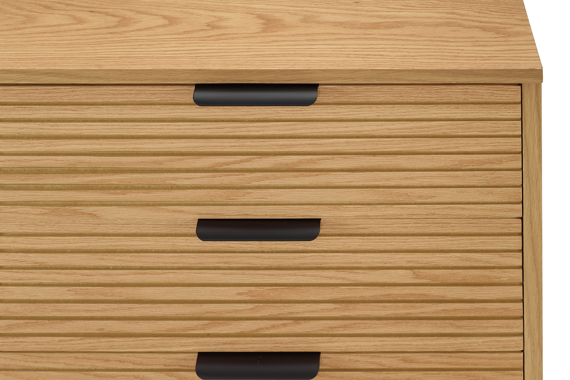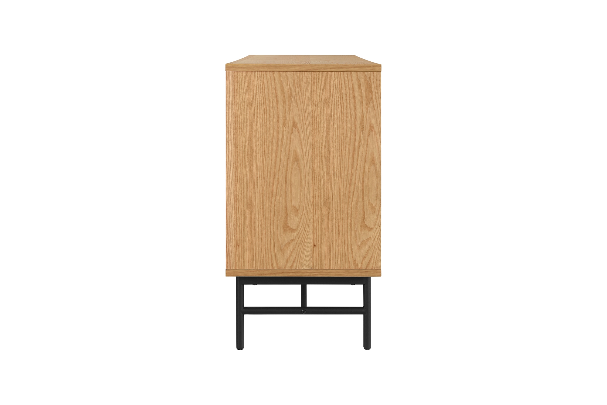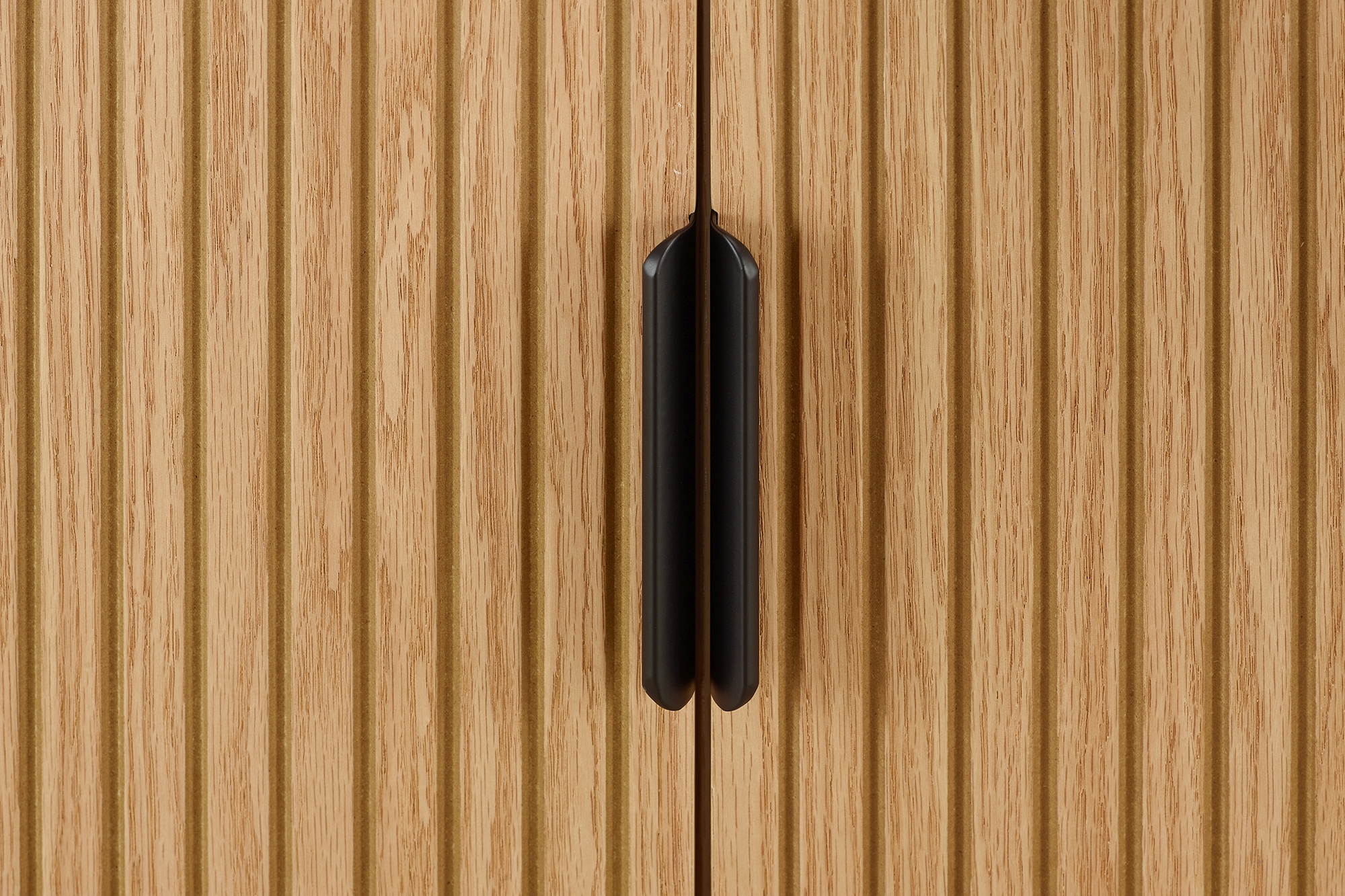 Le placage chêne clair et les pieds hauts laqués ton noir créent un contraste moderne et font entrer le style scandinave ultra tendance dans votre intérieur. Un vernis polyuréthane résistant aux rayures est appliqué sur le caisson du meuble : ceci le rend particulièrement résistant et robuste pour pouvoir en profiter longtemps. La structure avec des pieds fins confère au meuble un aspect léger et aérien et un look tendance digne d’un loft. Le placage en chêne apporte un charme supplémentaire à l’ensemble. Le bahut dispose de 2 portes et 3 tiroirs offrant un espace de stockage supplémentaire à l’abri des regards… pour que le rangement devienne un jeu d’enfant !