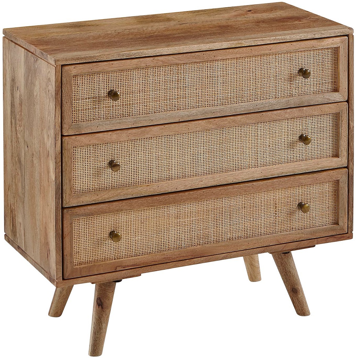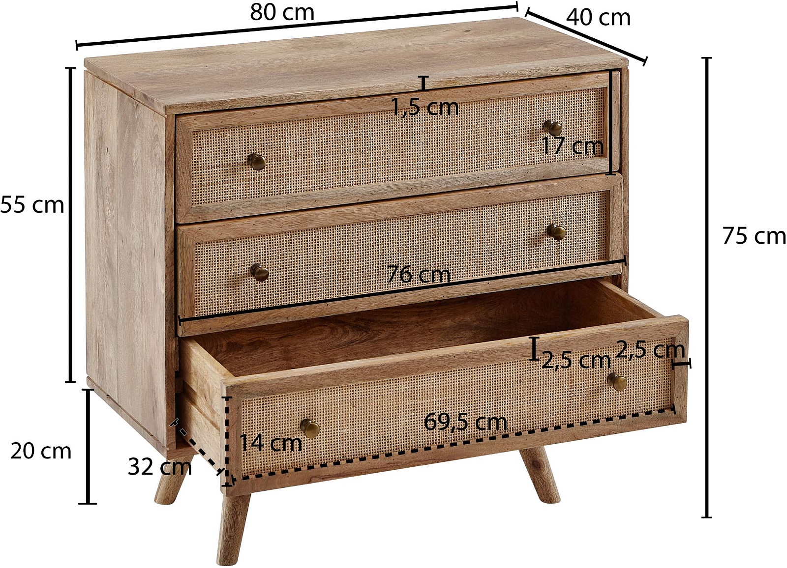 COMPOSITION ✔ Le caisson est fabriqué en bois de manguier massif revêtu d'un vernis transparent protecteur. Les façades des tiroirs sont décorées de cannage. Les poignées sont en fer laqué.