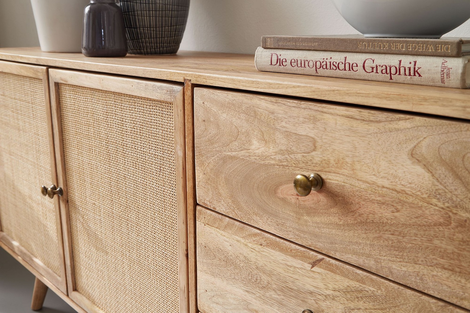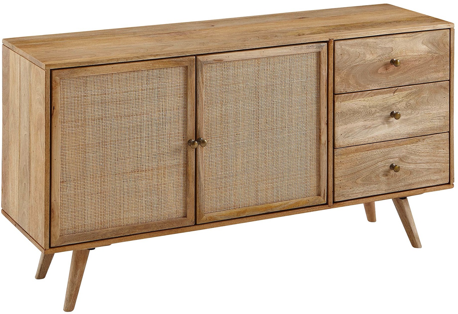 COMPOSITION ✔ Le caisson est fabriqué en bois de manguier massif revêtu d'un vernis transparent protecteur. Les façades des portes sont décorées de cannage. Les poignées sont en fer laqué.