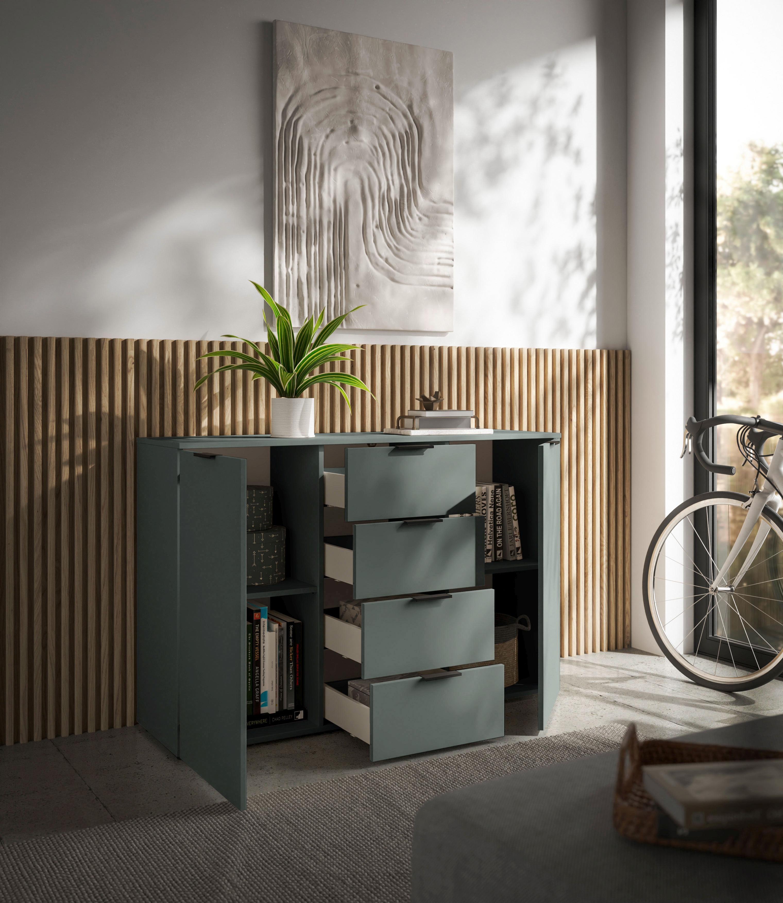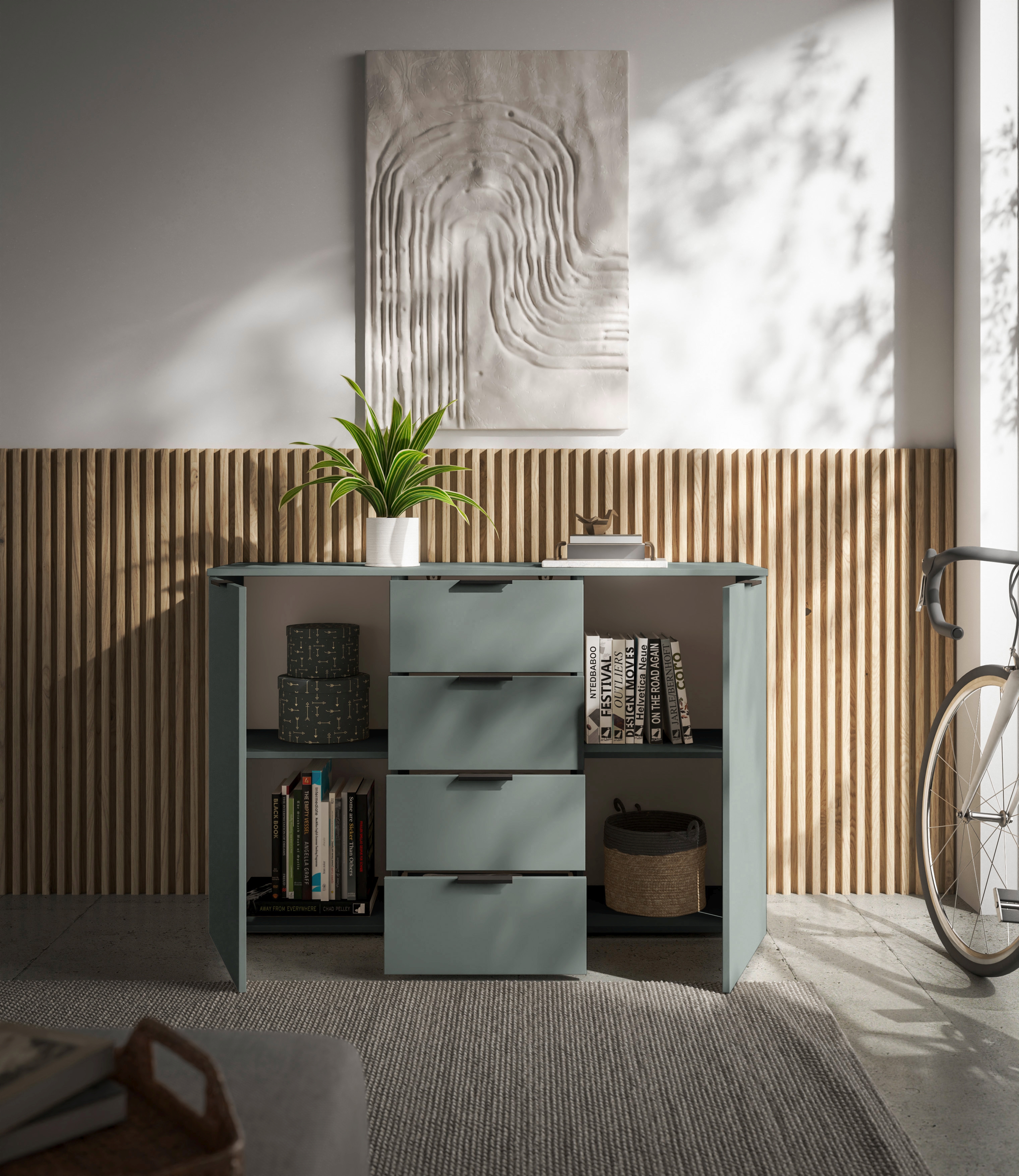 Caisson : ton sauge, panneau de particules surfacé et mélaminé (PPSM)