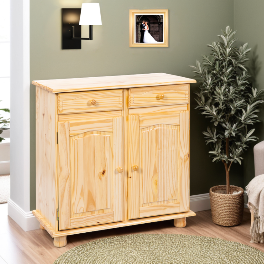 La surface en pin massif (pin Tadea) est scellée avec un vernis transparent à faible teneur en COV (composés volatils organiques) en substances nocives. Cela rend le bois facile d’entretien, hydrofuge et particulièrement durable. Chaque commode est fabriquée à partir de bois massif soigneusement sélectionné et traité selon des critères de qualité stricts. Le résultat : un meuble de qualité, durable et produit selon les normes environnementales européennes.