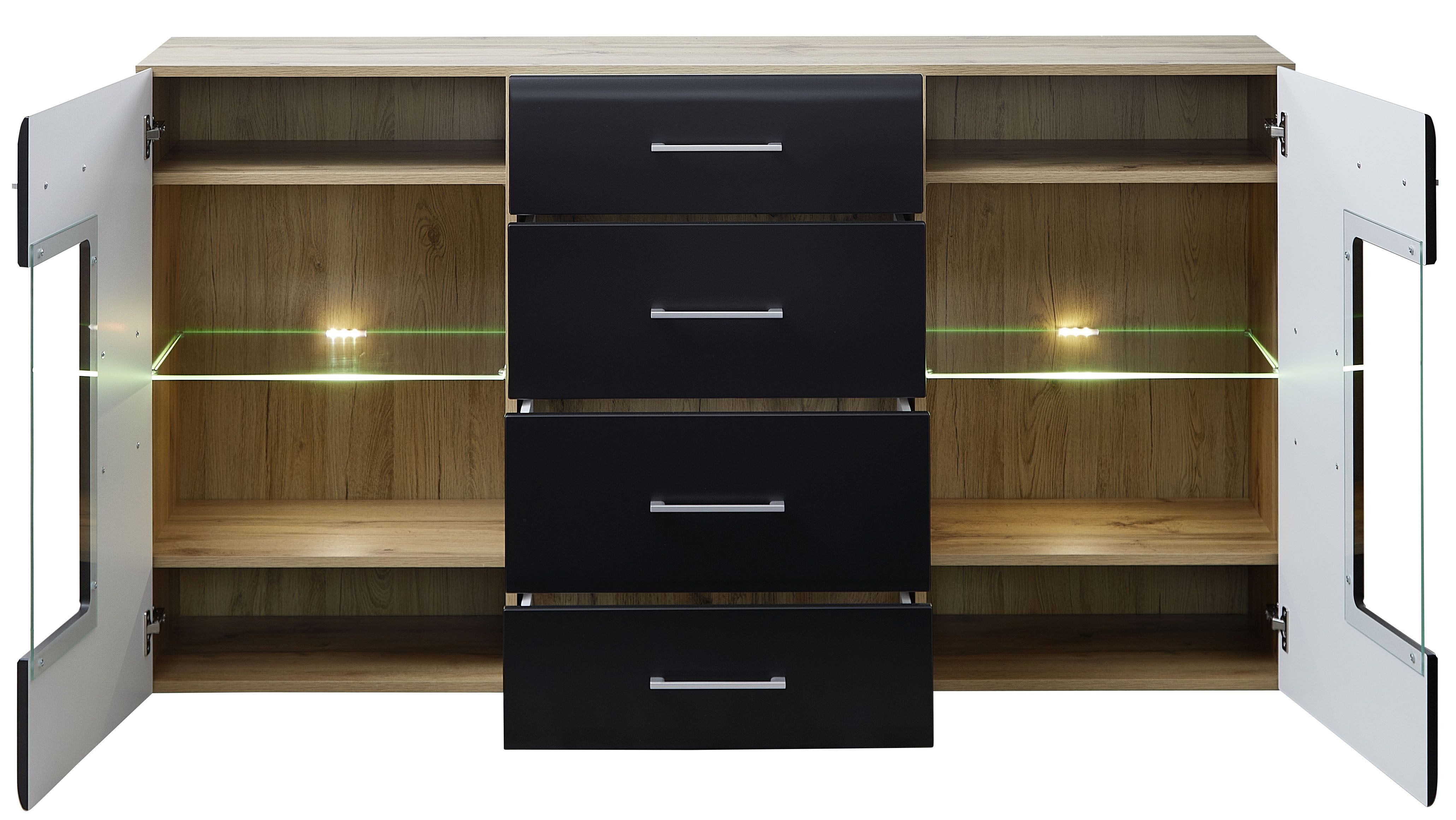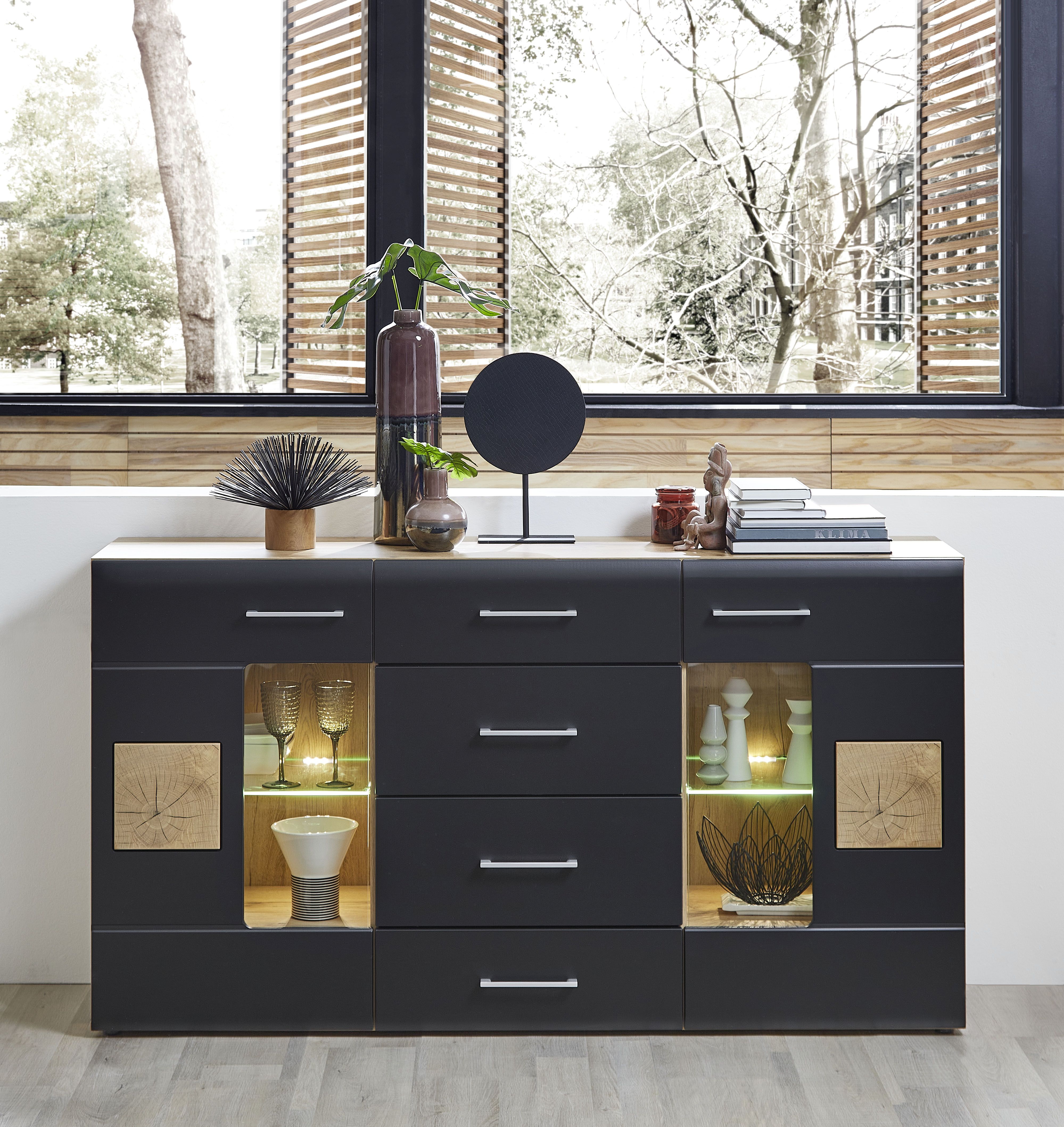 Façade : MDF Perfect Touch stratifié laqué noir super mat avec contrastes en bois de bout / verre transparent