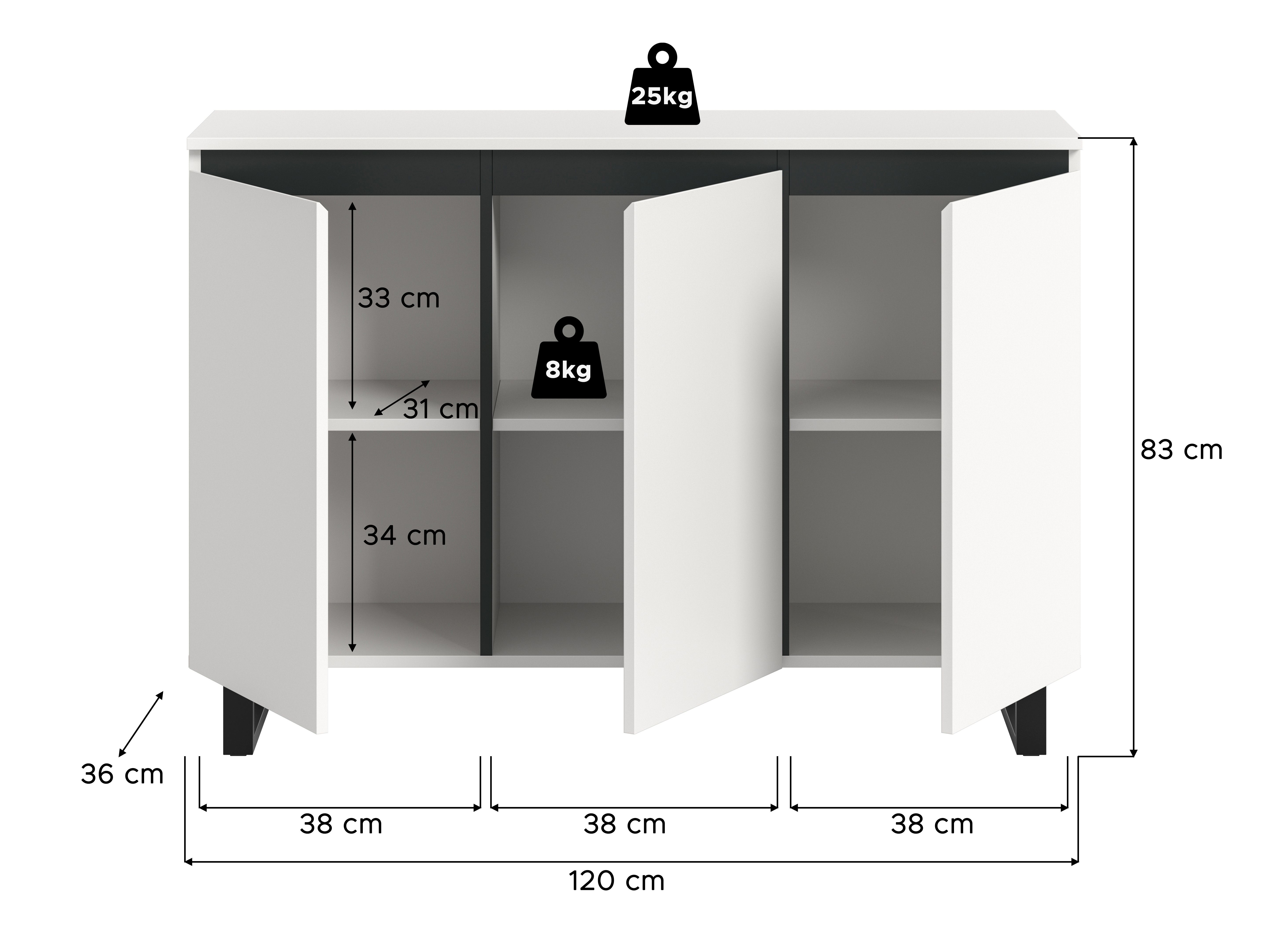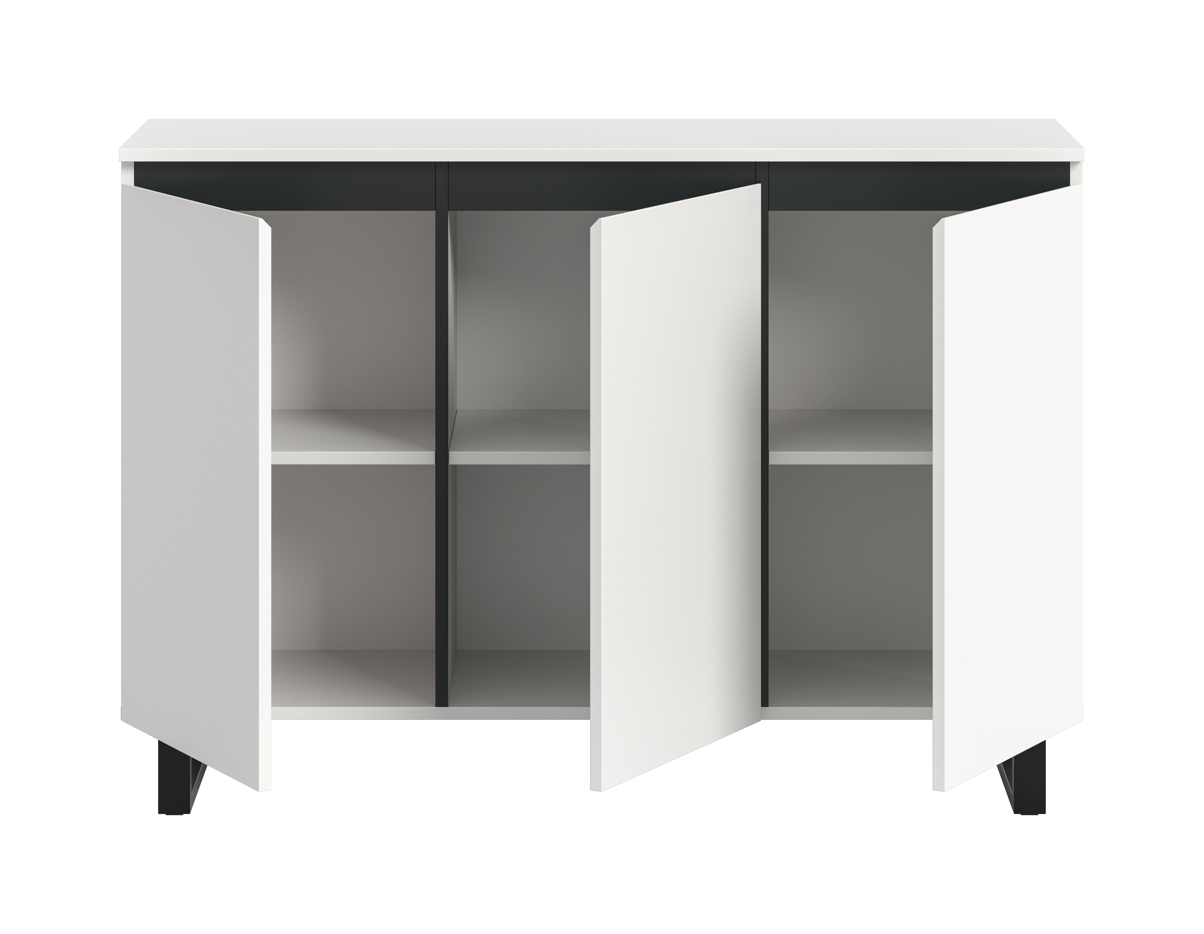 Ce bahut en décor blanc (dimensions : L/H/P : 120 x 84 x 36 cm) offre un vaste espace de rangement avec trois portes, trois tablettes amovibles réglables en hauteur et six compartiments : la solution idéale pour vos pièces de vie. Sa surface soigneusement travaillée et facile d’entretien lui confère un look moderne et élégant. Ce meuble est parfait pour faire régner l’ordre tout en apportant une touche stylée à votre intérieur. Sa construction robuste garantit stabilité et longévité. Facile à combiner avec d’autres meubles, ce bahut constitue un complément idéal pour le salon, la salle à manger ou l’entrée. Créez un intérieur pratique et harmonieux grâce à ce bahut élégant.