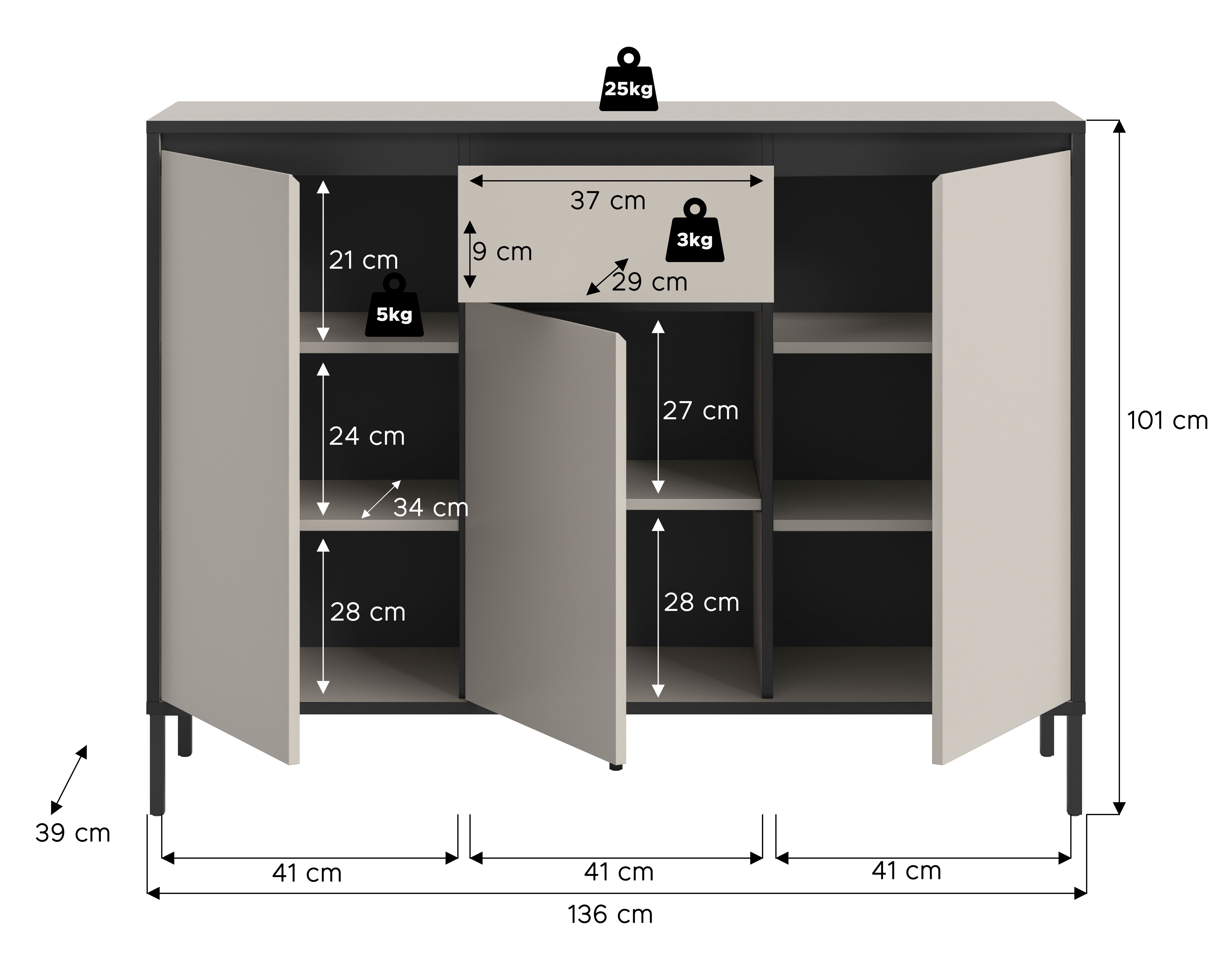 Ce bahut spacieux en décor cachemire (dimensions : L/H/P : 136 x 101 x 38 cm) est équipé de trois portes, de cinq tablettes amovibles réglables en hauteur, de huit compartiments et d’un tiroir à sortie totale. Sa surface soigneusement travaillée et facile d’entretien lui confère une allure moderne et élégante. Ce meuble offre un bel espace de rangement pour vos accessoires, vêtements ou autres objets, tout en contribuant à une organisation ordonnée et stylée de votre intérieur. Sa construction robuste garantit stabilité et longévité. Facile à combiner avec différents meubles, il constitue un complément pratique pour différentes pièces de la maison.