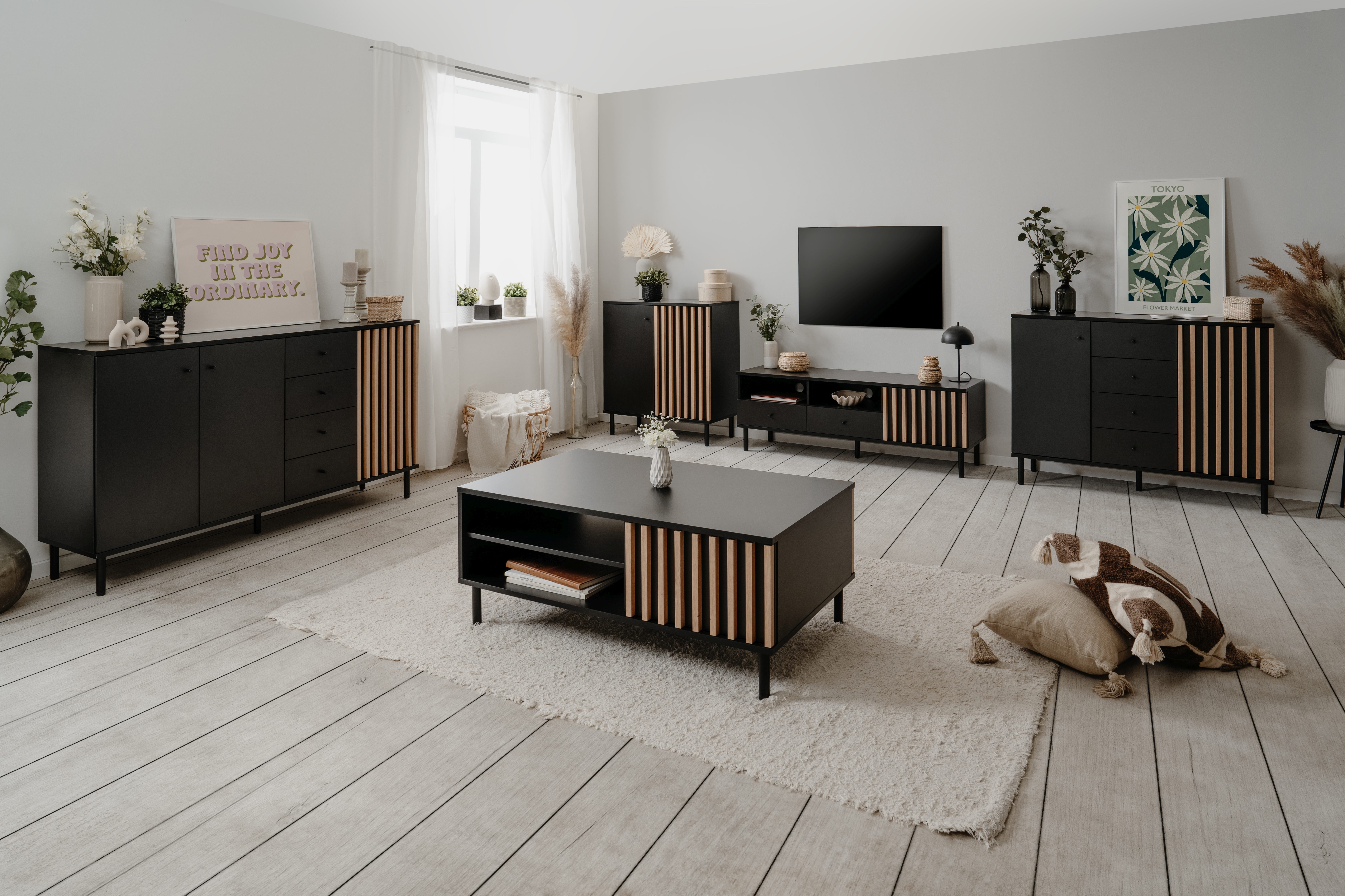 Façade : ton noir (avec traitement anti-traces de doigts) et lamelles décor chêne Artisan (aspect 3D)