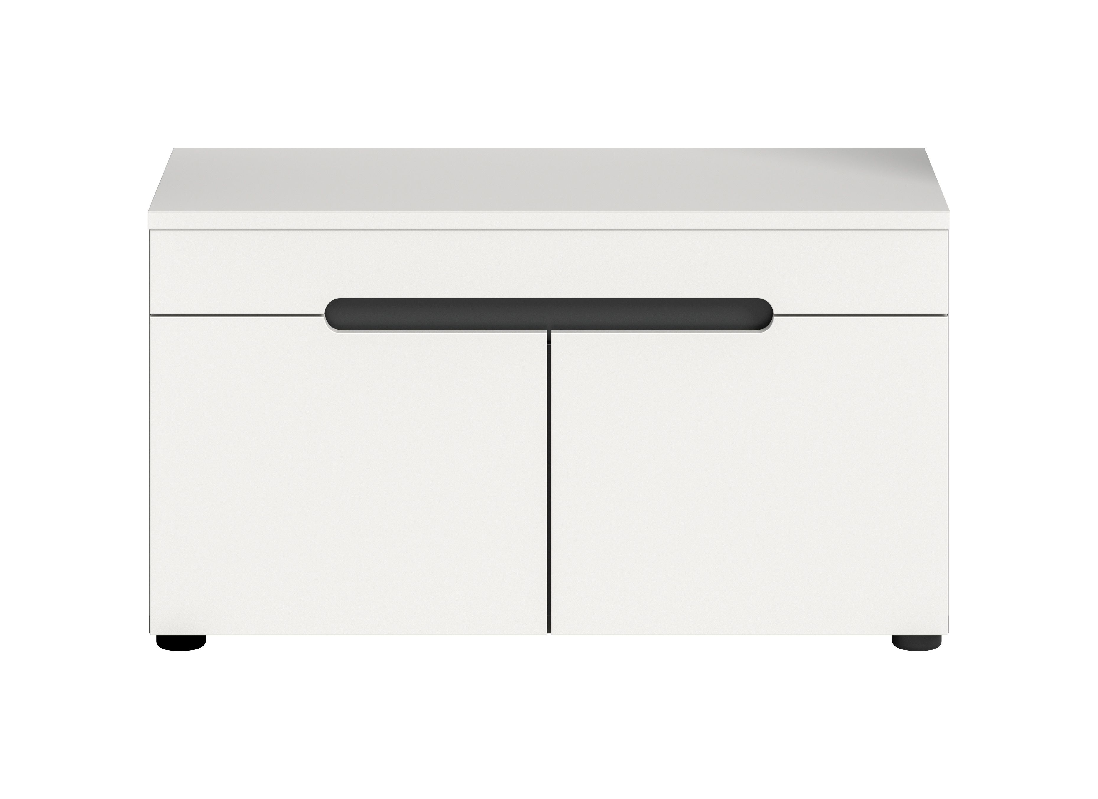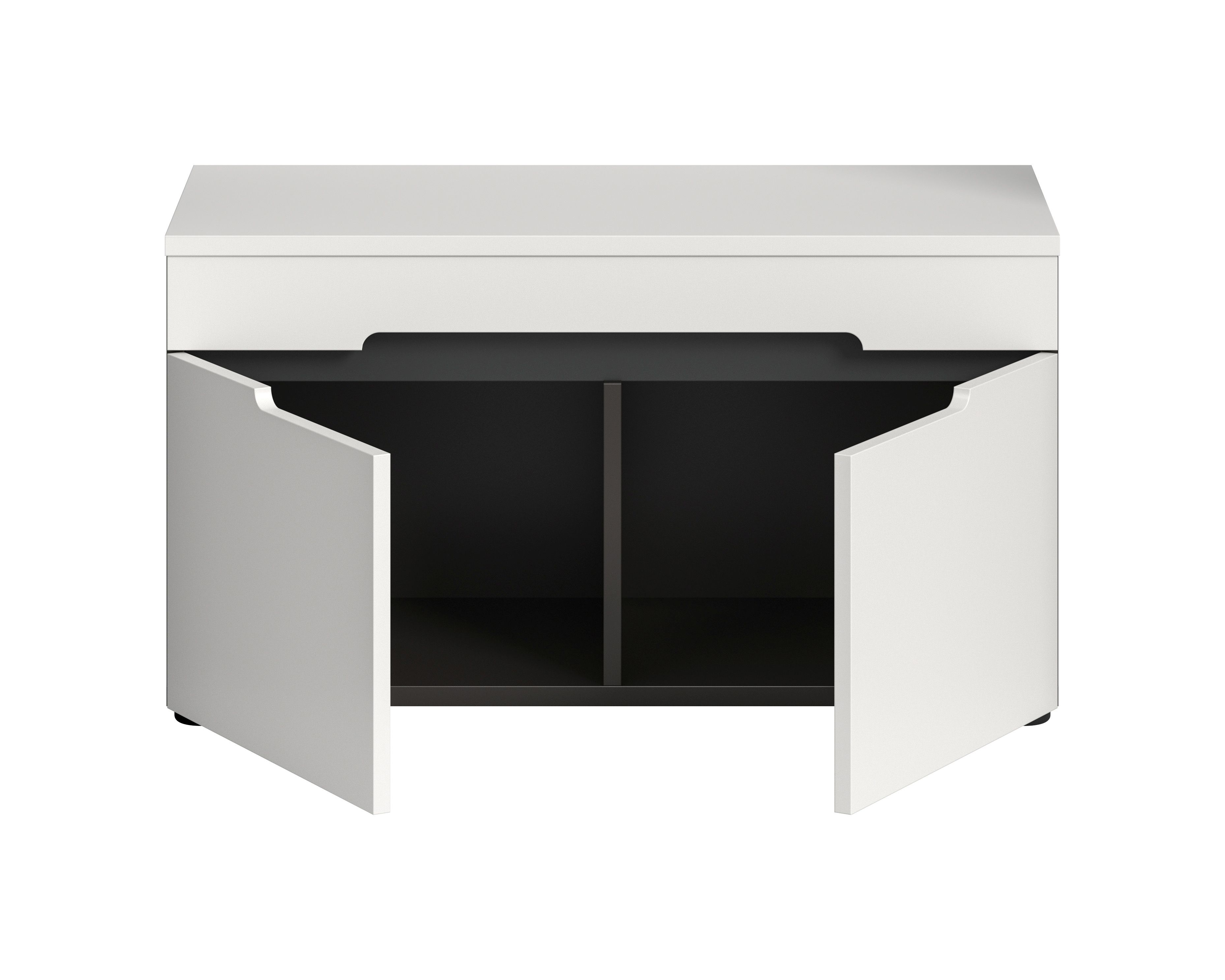- Banc à chaussures au design tendance et attrayant décor bois ton gris basalte et ton blanc pour une ambiance tendance dans le couloir ou l’entrée.