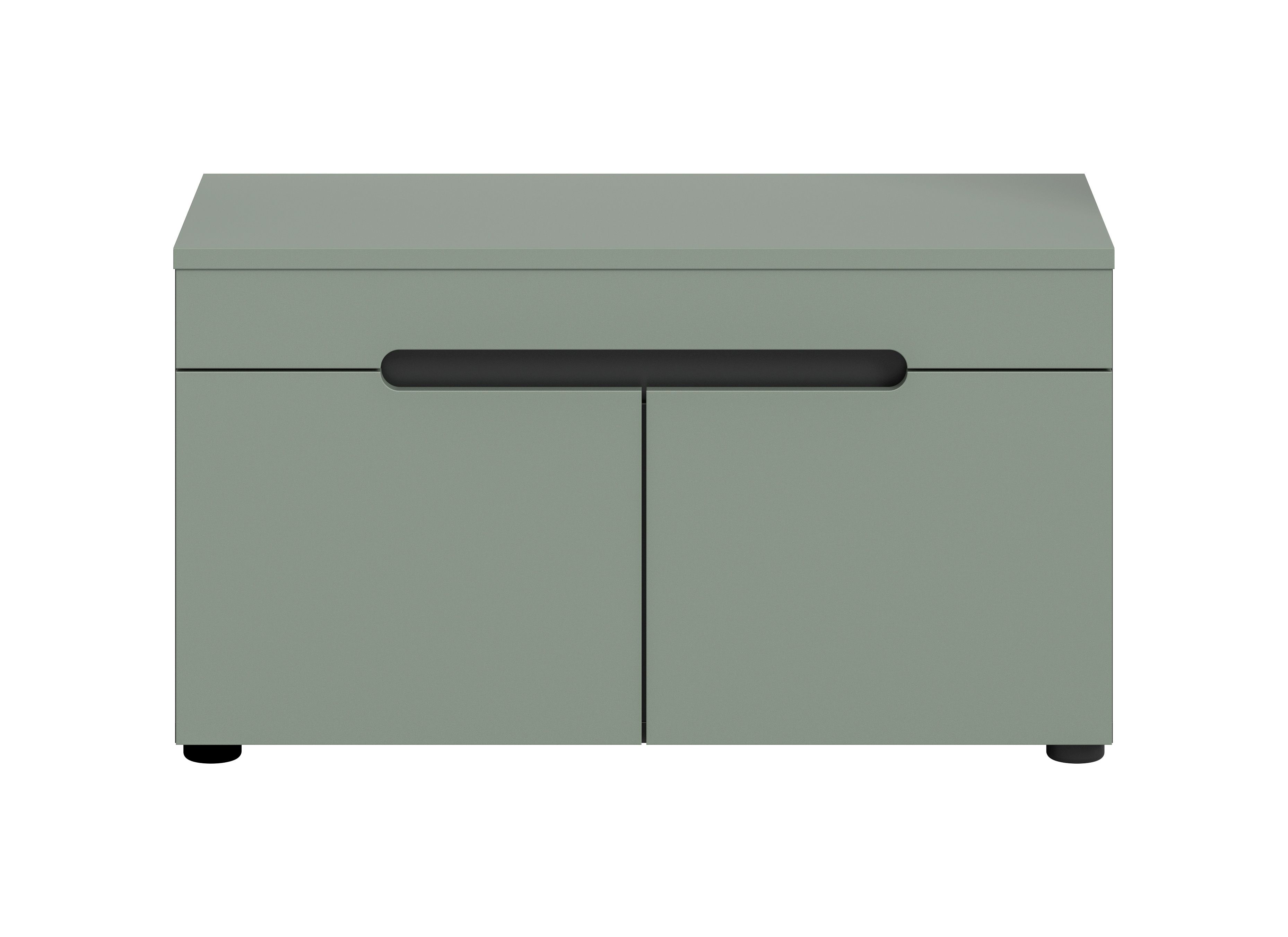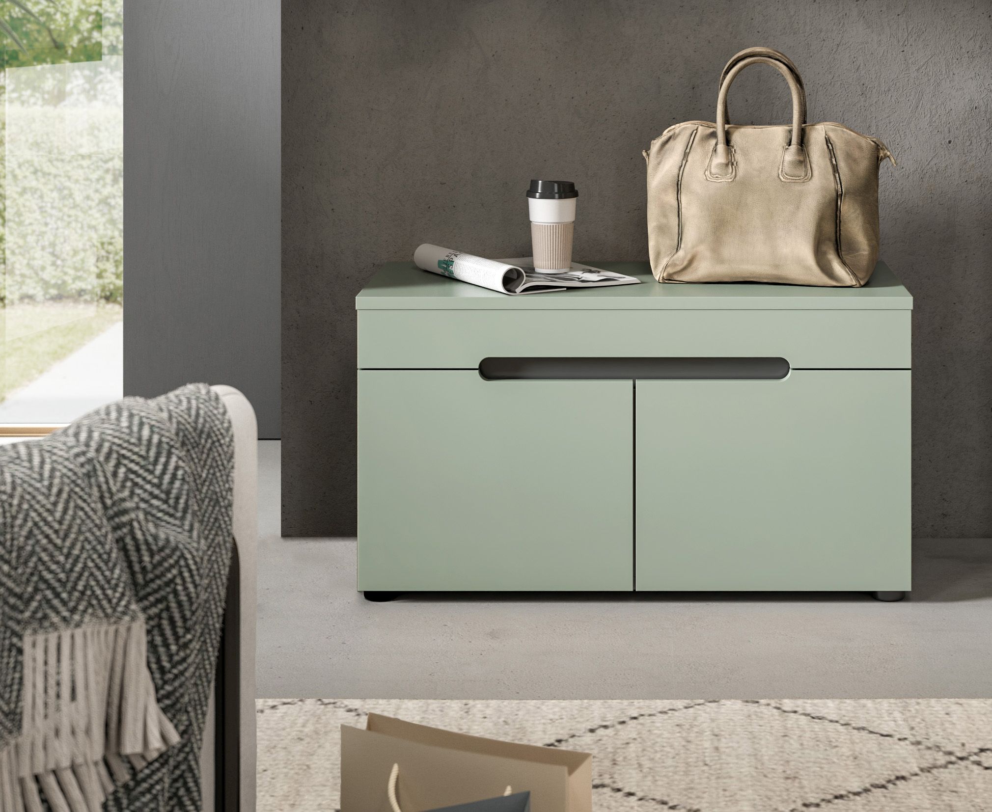 - Banc à chaussures au design tendance et attrayant décor bois ton gris basalte et ton smoke green pour une ambiance tendance dans le couloir ou l’entrée.