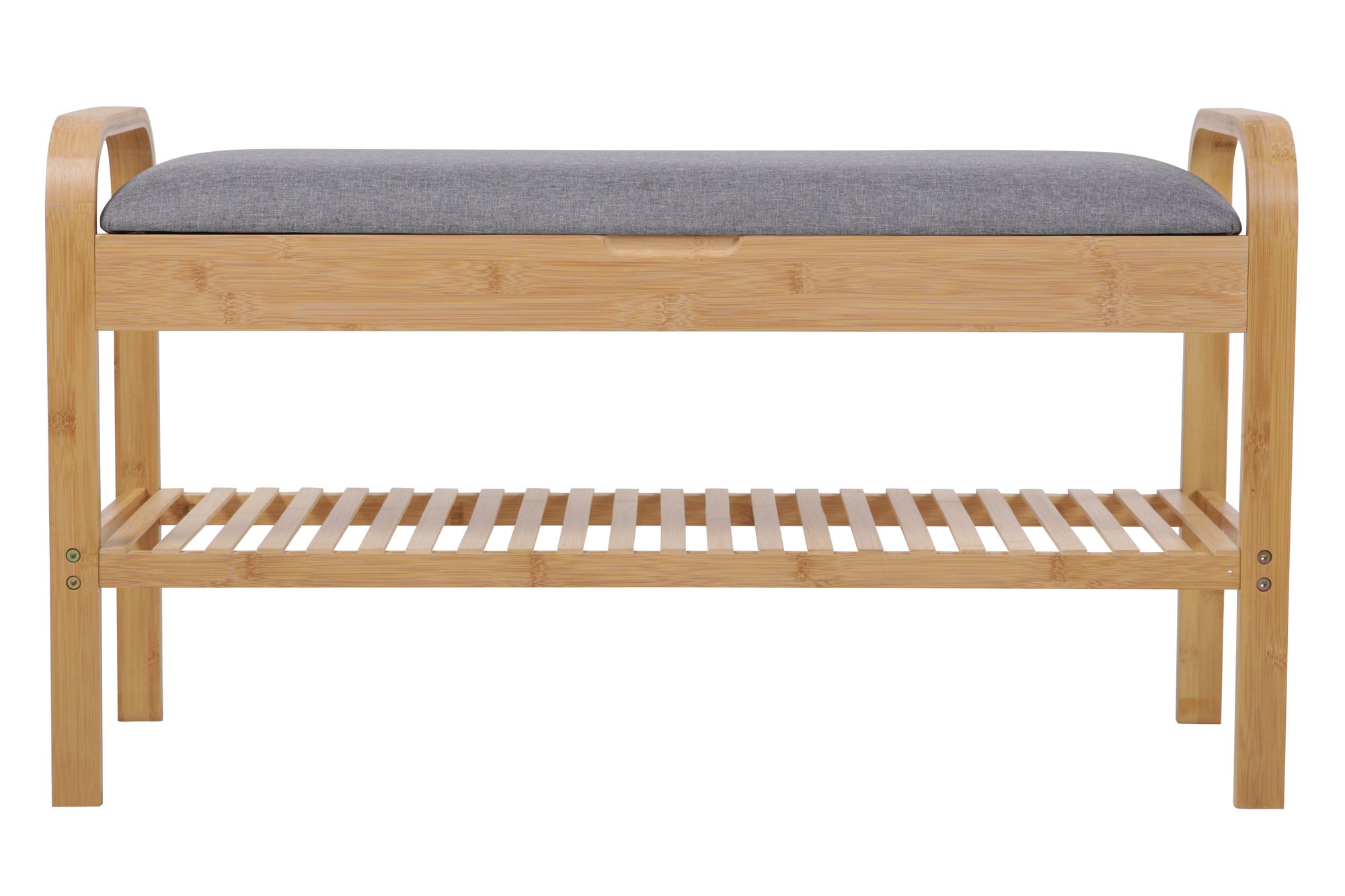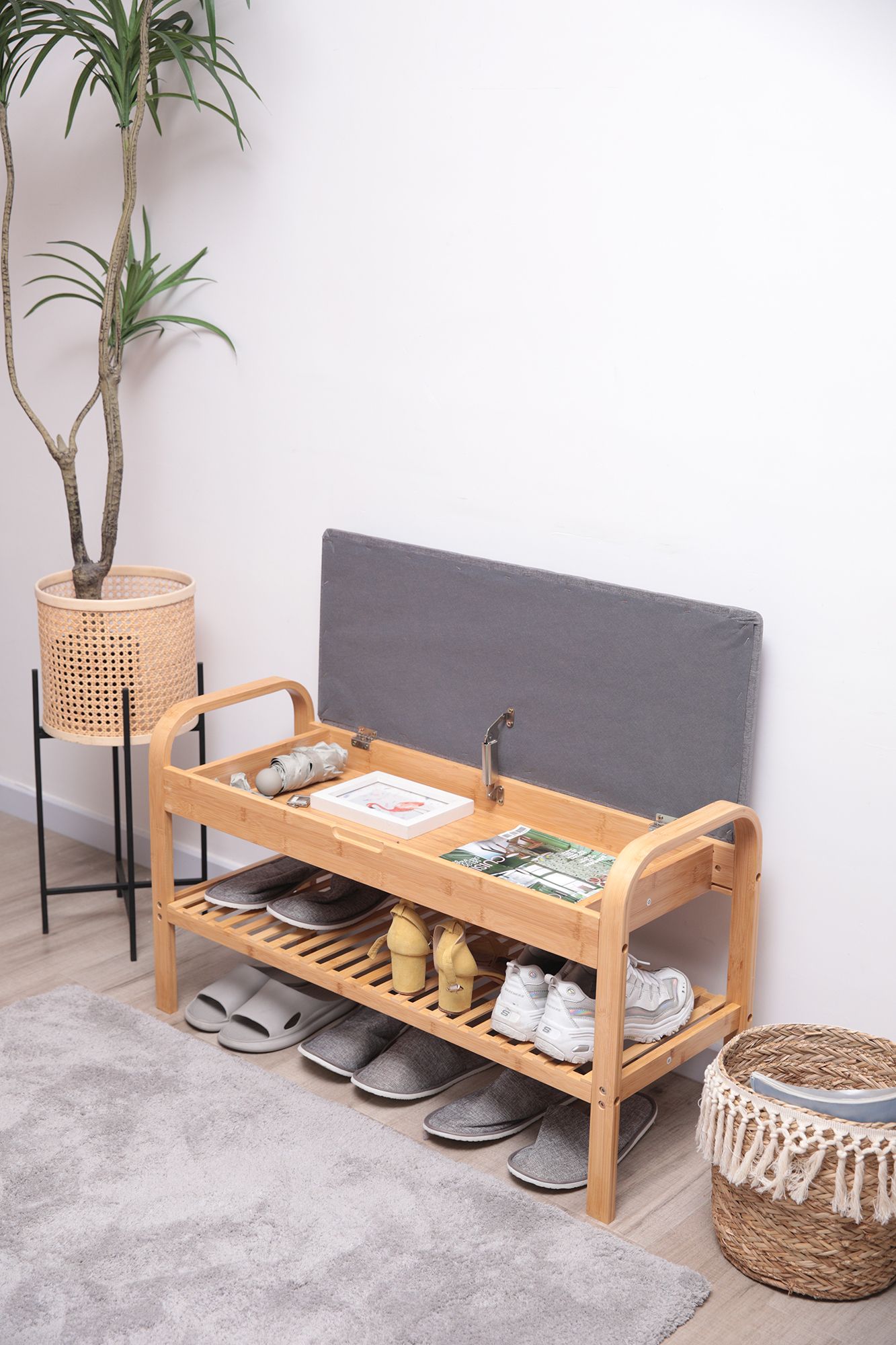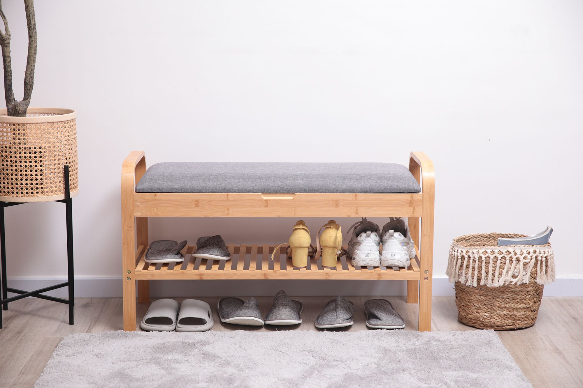 Banc à chaussures stylé avec une surface d'assise pratique : ce banc de vestiaire associe confort et espace de rangement de façon moderne. La structure est fabriquée en bois de bambou robuste et durable, un matériau idéal pour une utilisation quotidienne. Grâce au coussin d'assise moelleux, le meuble d'entrée ne permet pas seulement de ranger jusqu'à 5 paires de chaussures, il se transforme également en un banc à l'assise confortable. De plus, un espace de rangement masqué se cache sous l'assise rembourrée rabattable. Le design en bambou naturel et tissu gris sobre s'intègre facilement dans tout type d'entrée.