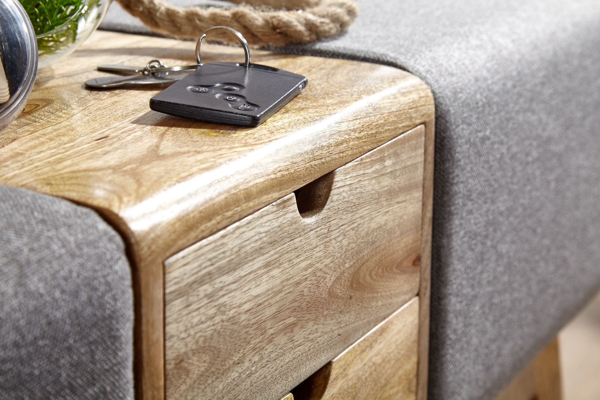 - Tiroirs et pieds : bois de manguier massif (avec couche de vernis transparent)