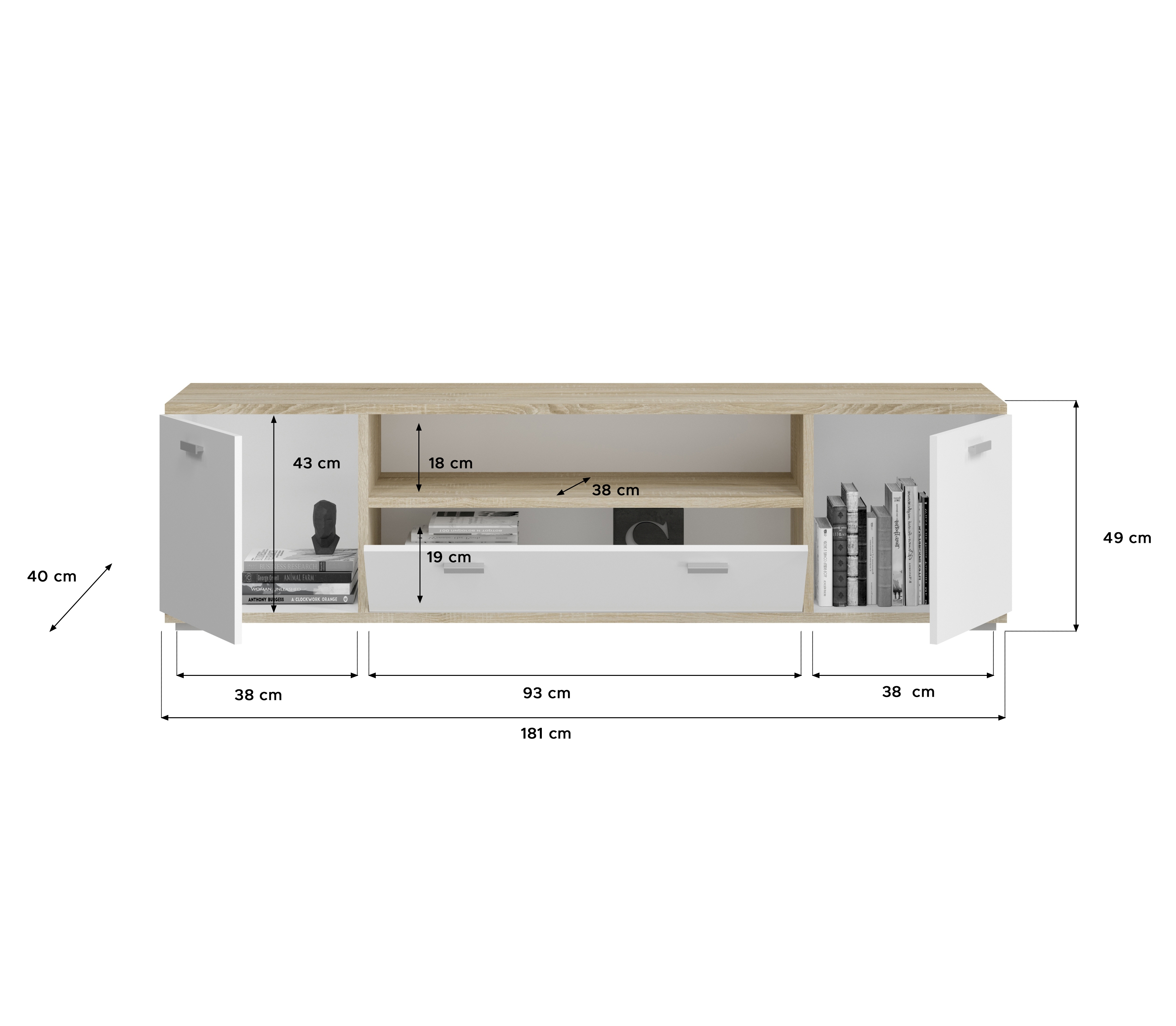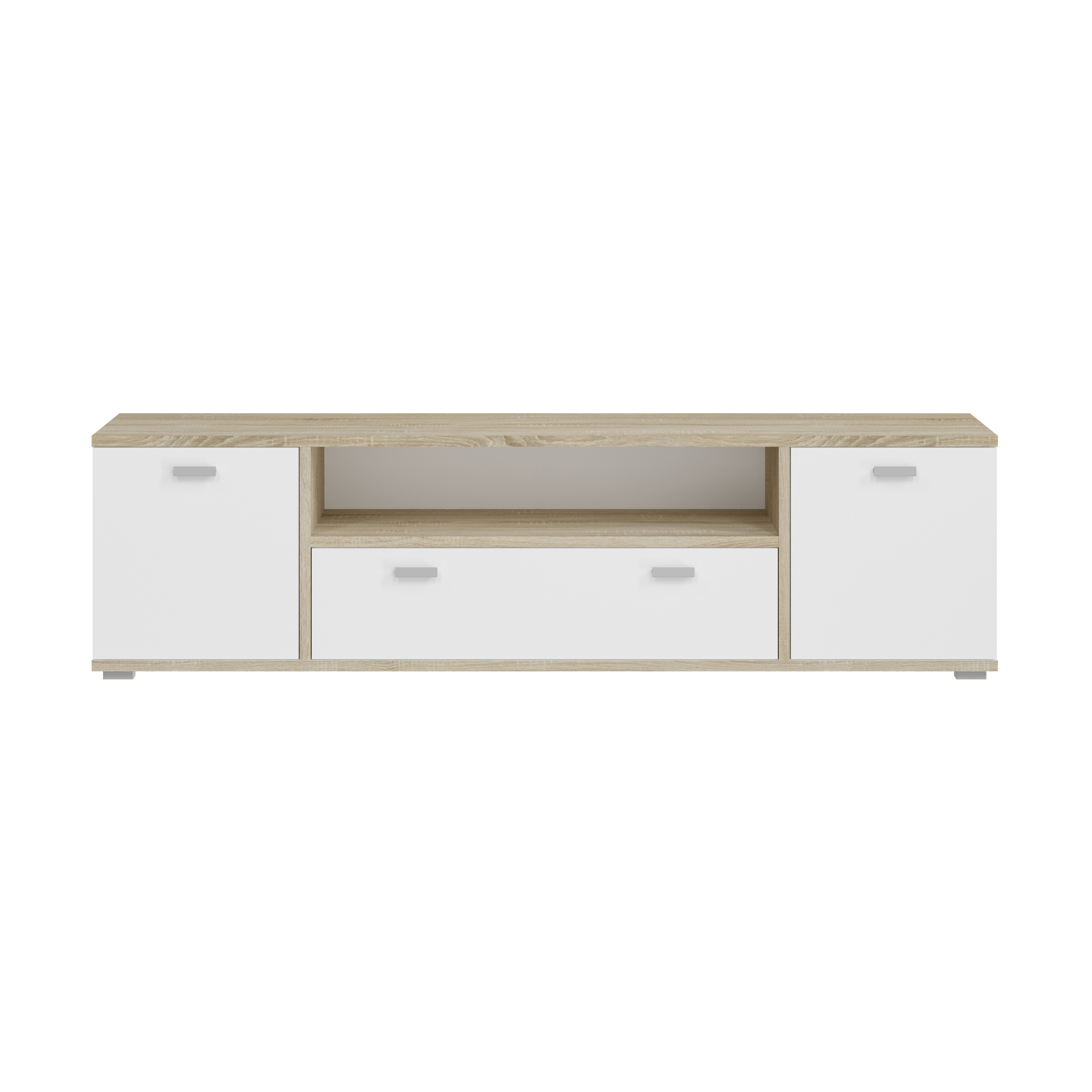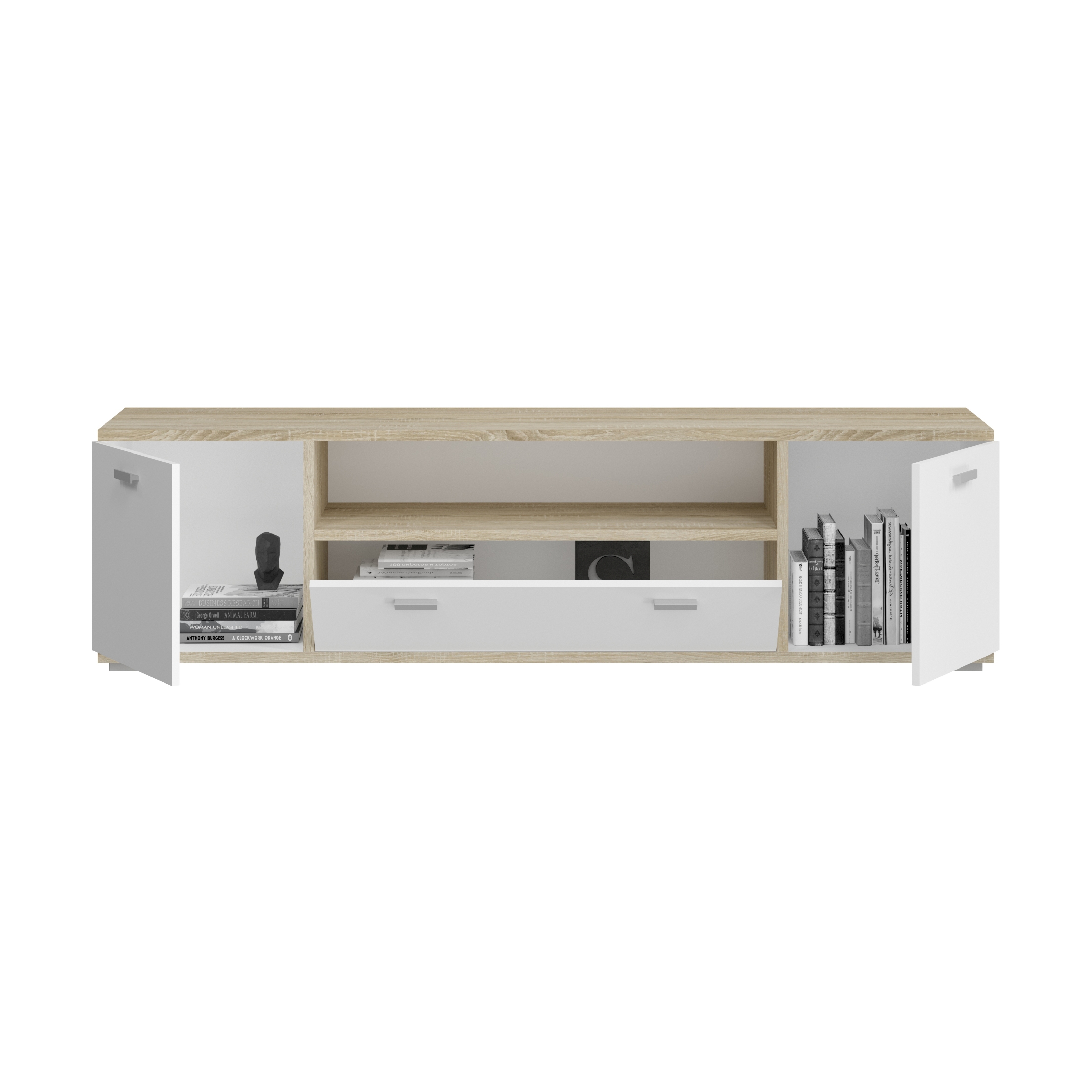 - Design/style : banc TV tendance dans un contraste attrayant ton blanc et décor chêne Sonoma clair ; il est proposé dans un design actuel et polyvalent pour tout type de pièce.
