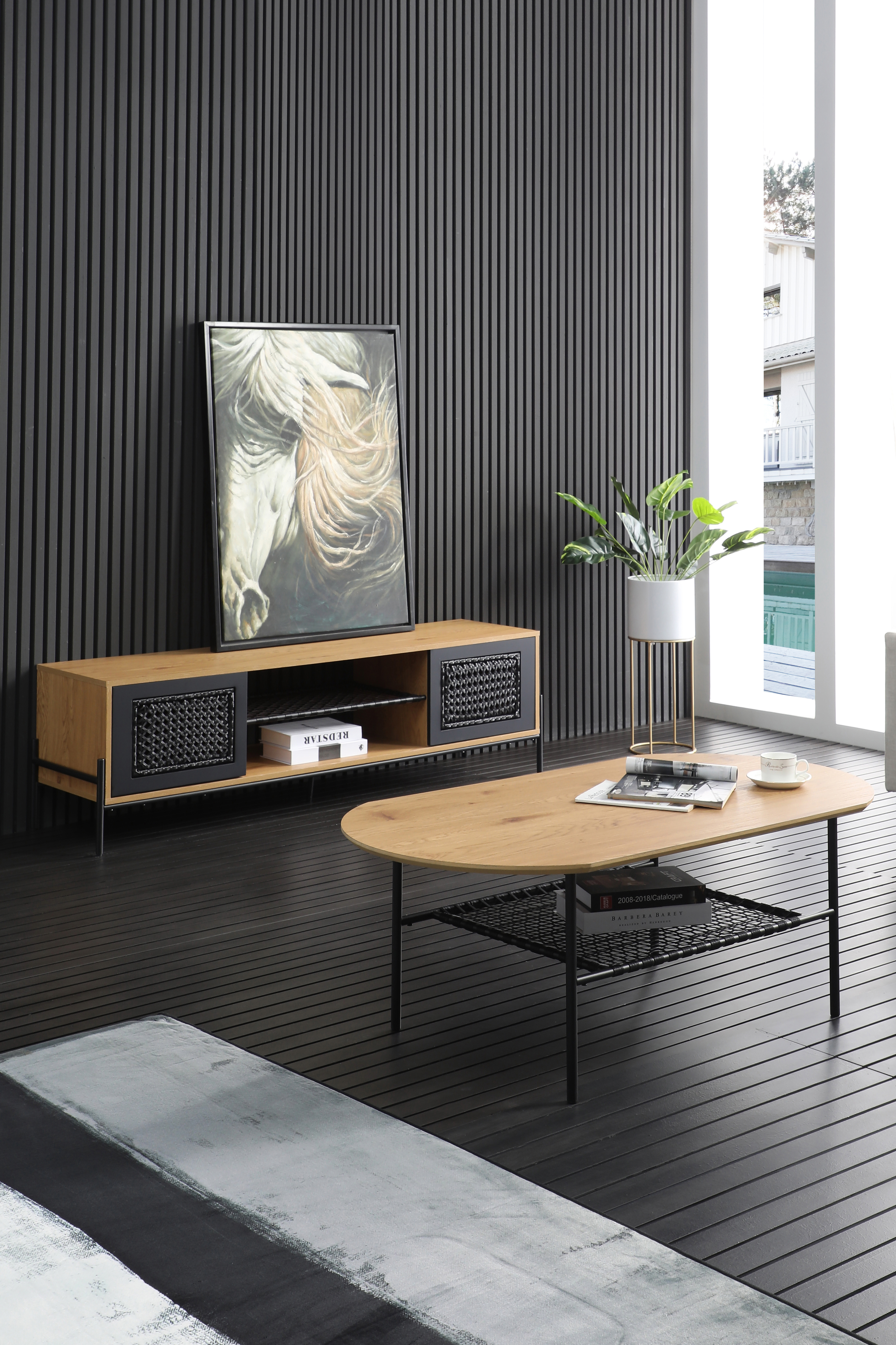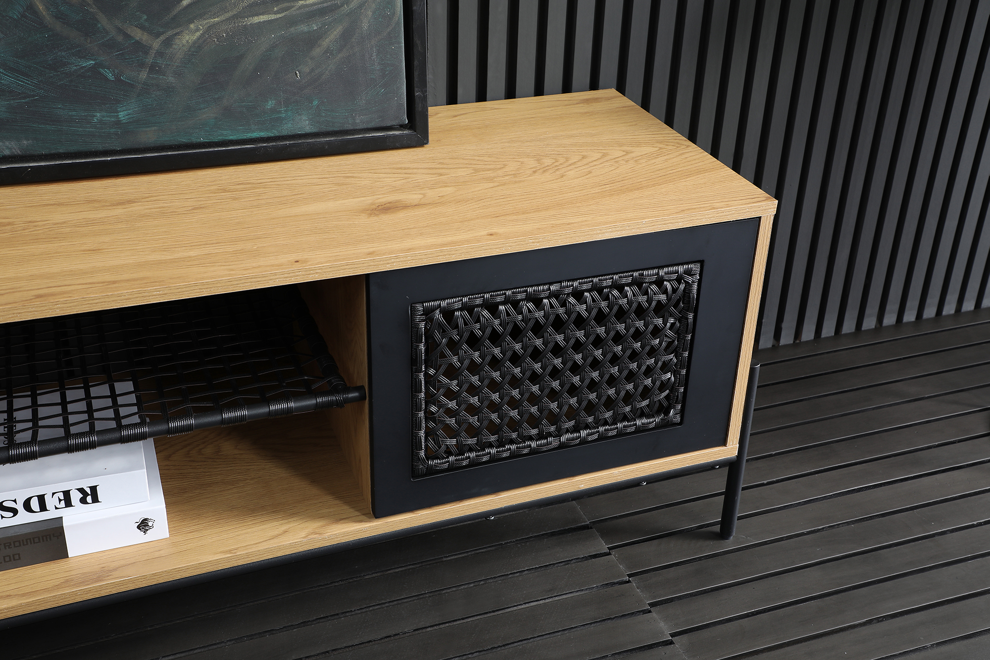 La rencontre entre design rétro et élégance froide et intemporelle ! Ce banc TV séduit par son design exceptionnel. La surface de couleur naturelle en bois MDF contraste avec les deux portes noires en mélamine avec des inserts en poly rotin qui permettent de twister ce meuble de manière intéressante. Un véritable accroche-regard qui offre en plus un espace de rangement pour toutes sortes de choses. Deux casiers ouverts, séparés par une tablette en poly rotin, offrent un espace supplémentaire pour les objets de décoration ou les livres. Grâce à son design intemporel, ce banc TV s'intègre parfaitement dans toutes les pièces et tous les styles d'intérieurs. La large surface de rangement offre suffisamment de place pour les fleurs, les photos ou l'équipement hi-fi.