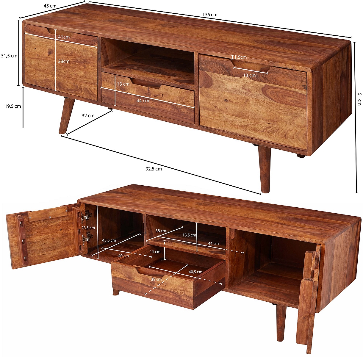 - MASSIF ✔ Invitez un petit bout de nature dans votre salon ! Le meuble TV en bois de sheesham de style maison de campagne rustique dégagera un charme très particulier dans votre maison. Le grain naturel du bois contribue à une ambiance intérieure agréable. Il ne vous reste qu’à allumer la télévision et profiter de votre soirée !