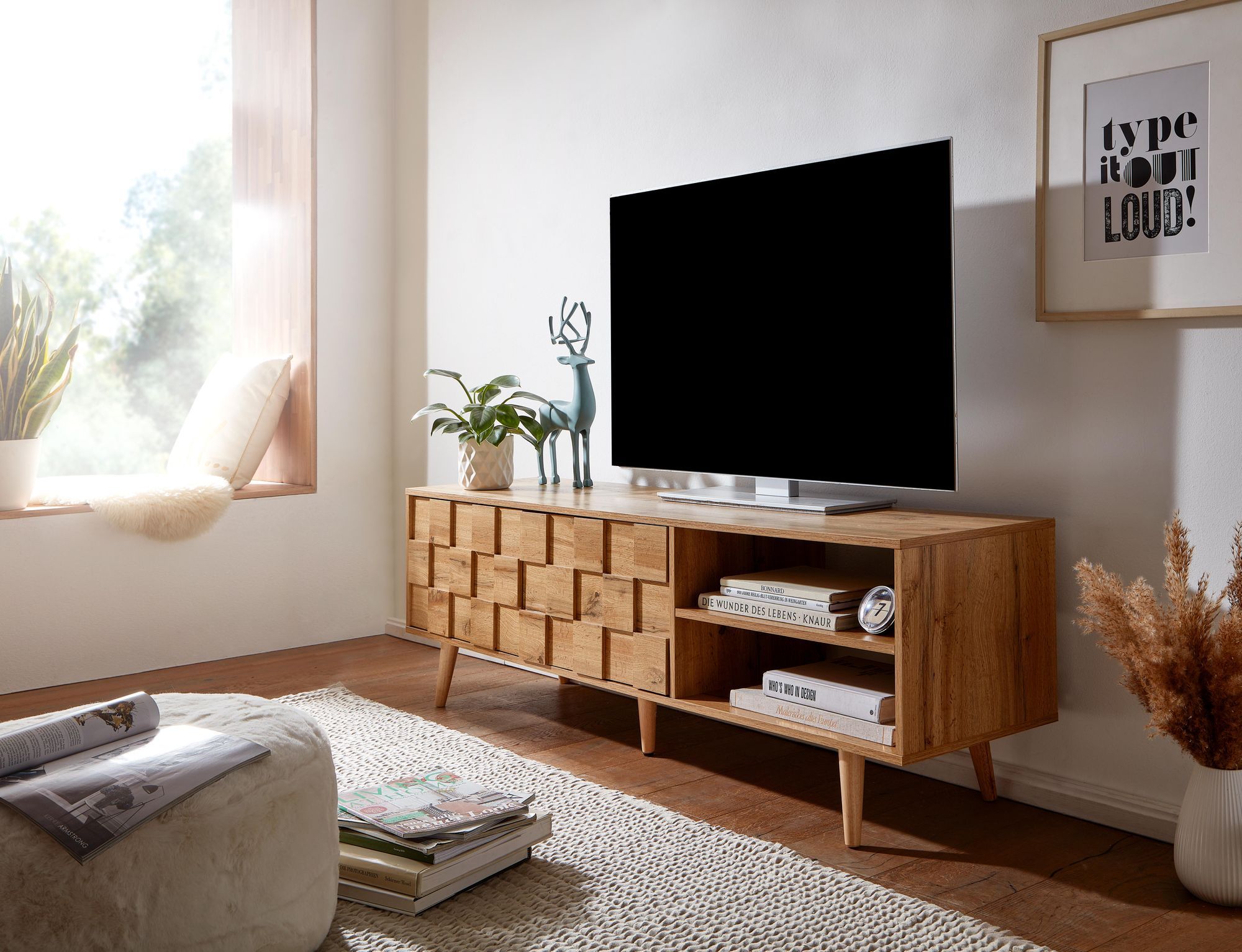 SOIRÉE TÉLÉ STYLÉE ✔ Un simple coup d'œil à ce meuble TV convivial montre à quel point la fonctionnalité et l'élégance peuvent se combiner à merveille. Le grand plateau offre beaucoup de place pour le téléviseur tandis que les deux casiers ouverts et les casiers derrière les deux portes proposent un espace de rangement supplémentaire. Le décor chêne, associé aux motifs de carreaux des façades de portes, confère au banc TV une note élégante et moderne.
