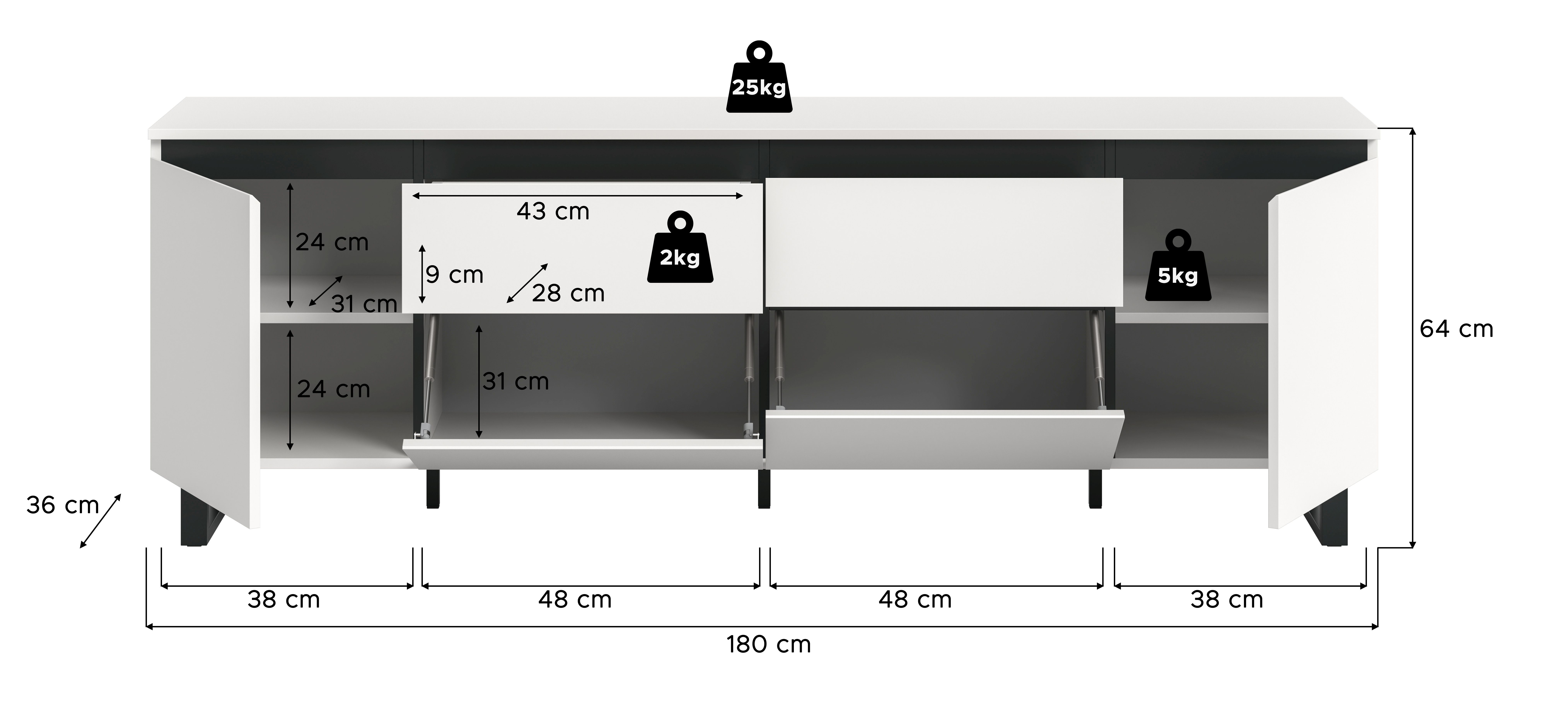 - 2 portes, 2 tablettes amovibles réglables en hauteur, 6 compartiments, 2 abattants, 2 tiroirs