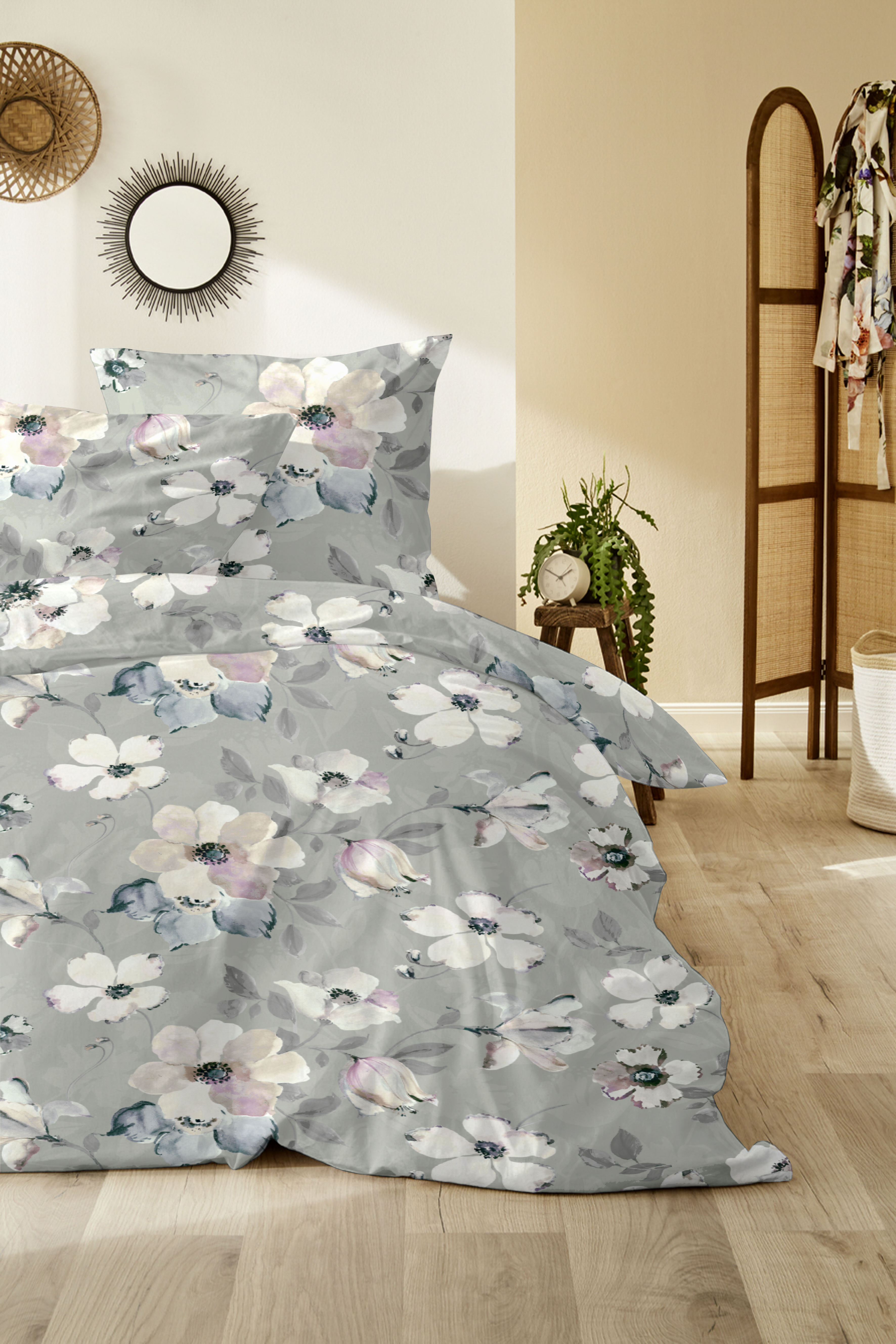 Farbe: grau, taupe, weiß mit floralem Muster