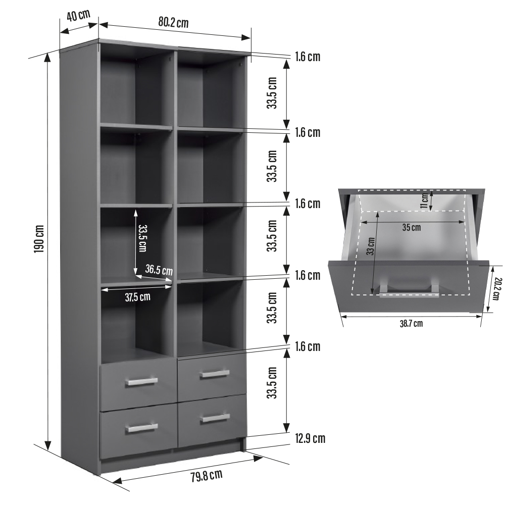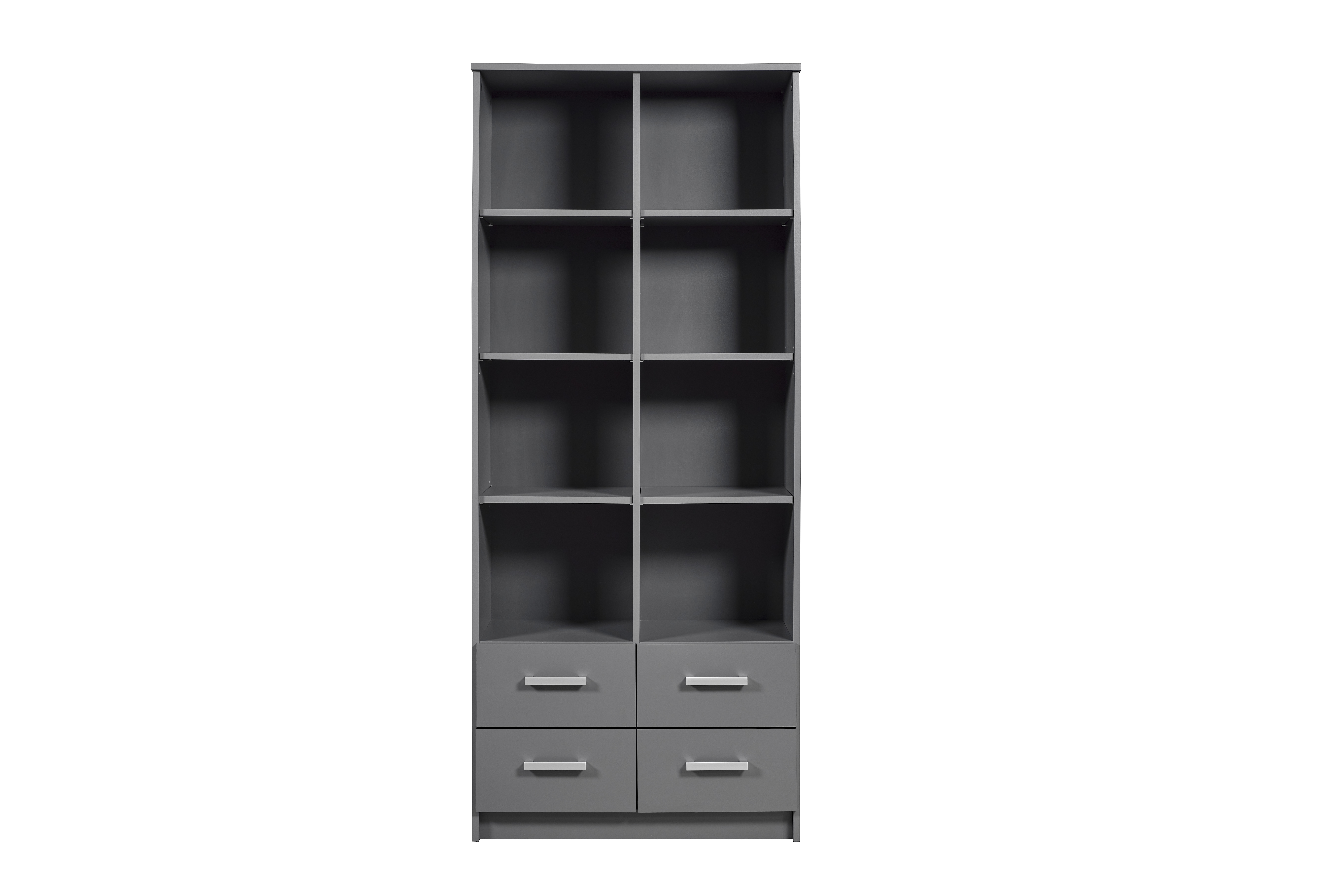 Cette étagère polyvalente, également utilisable comme bibliothèque, offre 8 niches et 4 tiroirs montés sur rails coulissants : un modèle parfait pour ranger facilement vos fournitures de bureau, livres ou objets décoratifs.