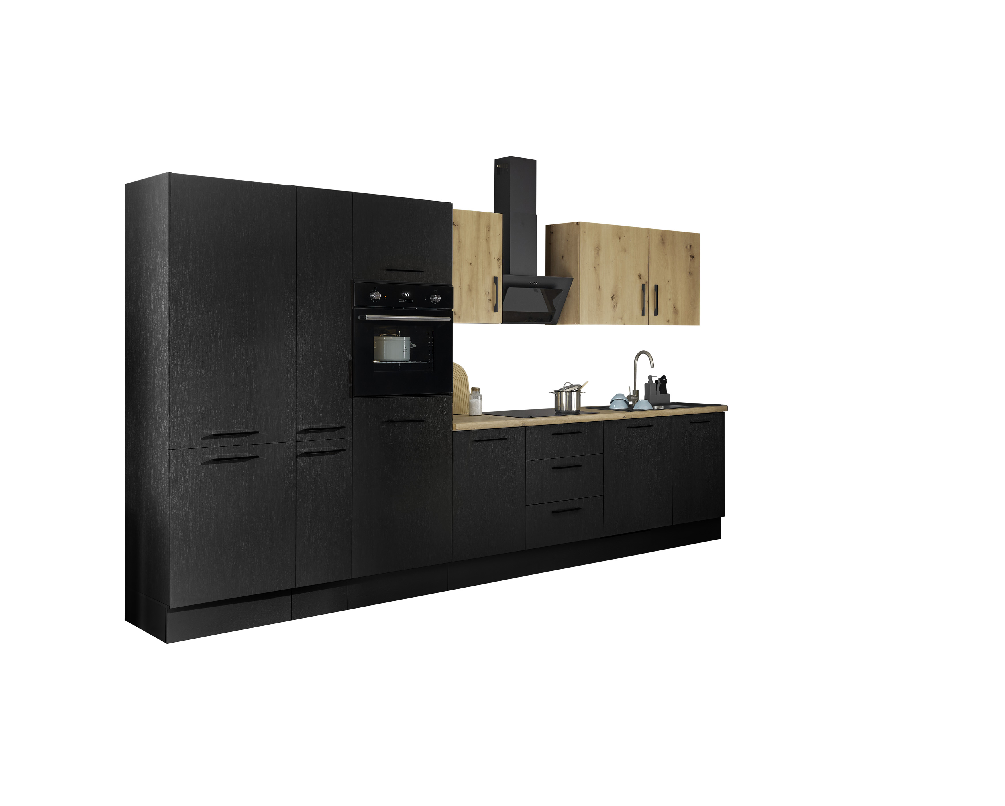 Façade et caisson : imprimé bois (woodprint) ton noir et panneau de particules surfacé mélaminé (PPSM) décor chêne Artisan