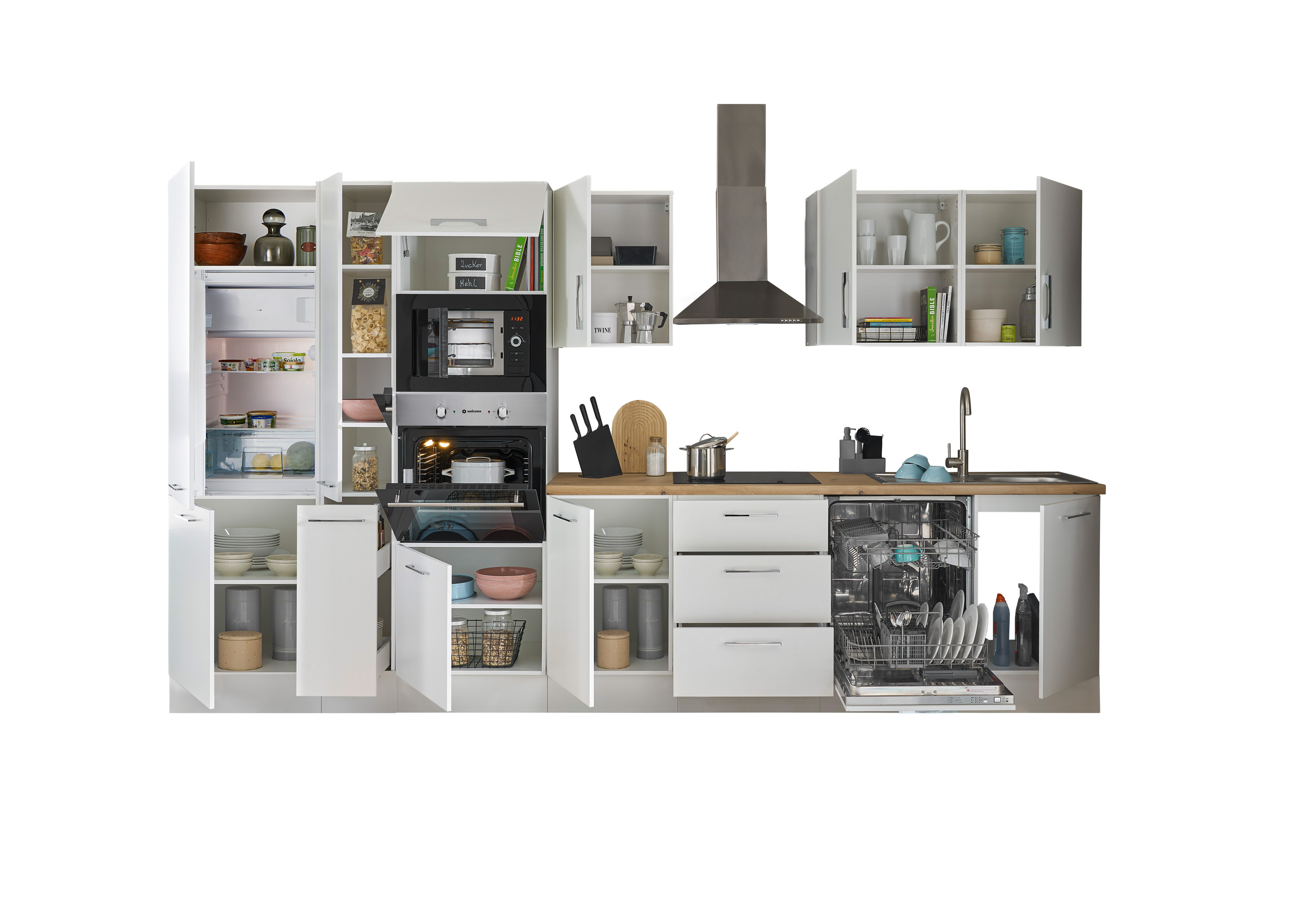 Bloc cuisine avec électroménager CORNWALL (bloc cuisine-four-lave-vaisselle-réfrigérateur-micro-ondes-armoire coulissante) I