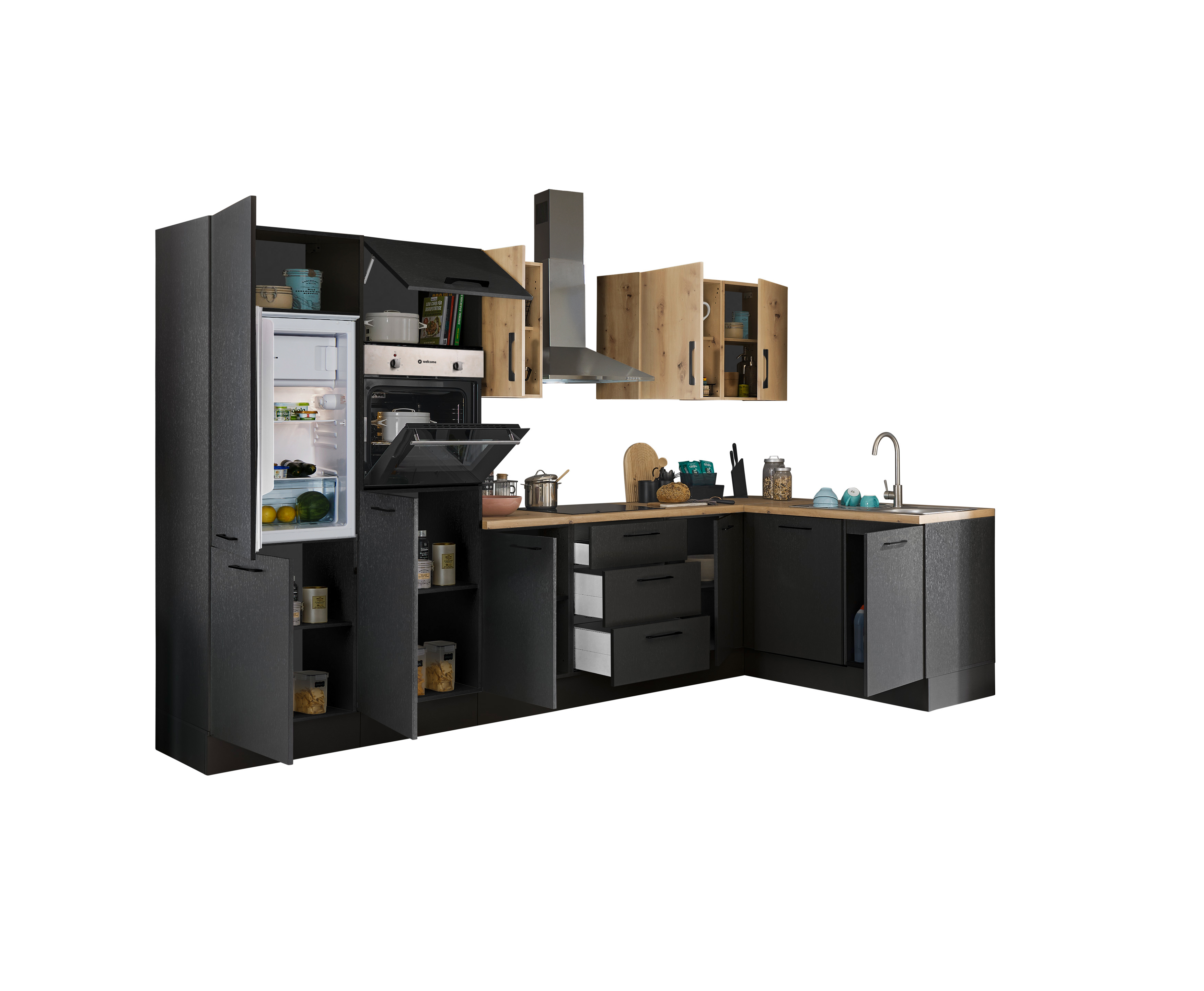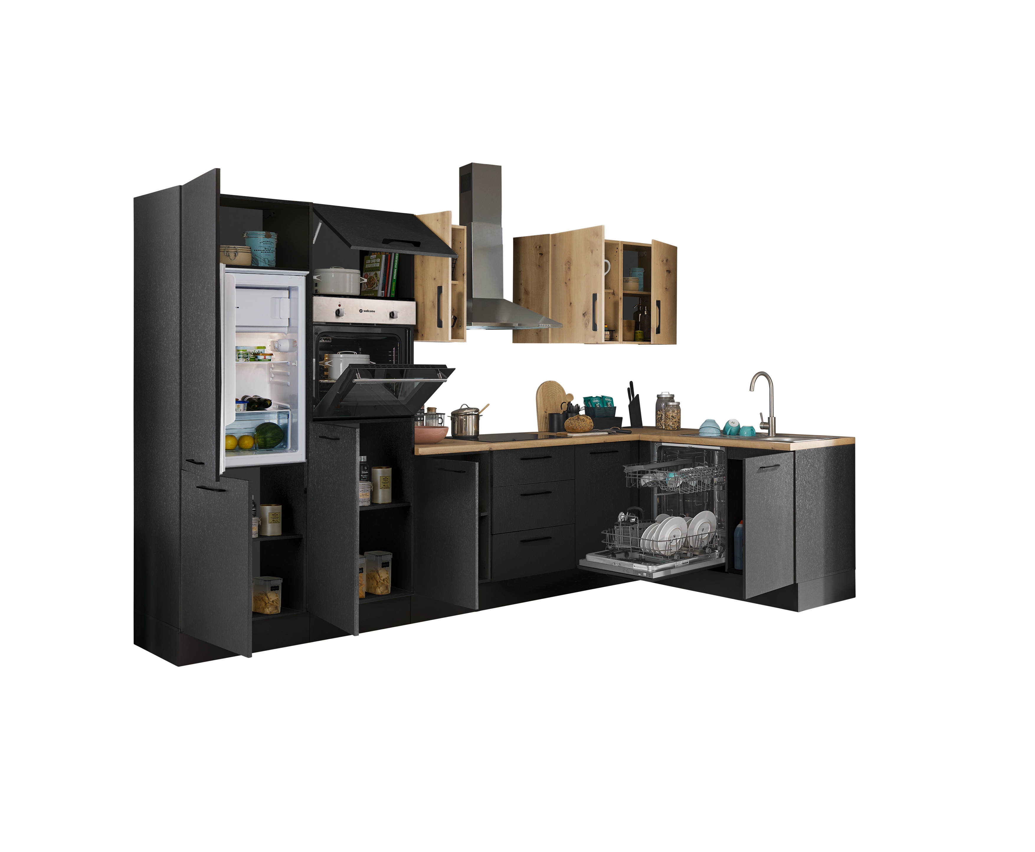 Façade et caisson : imprimé bois (woodprint) ton noir et panneau de particules surfacé mélaminé (PPSM) décor chêne Artisan