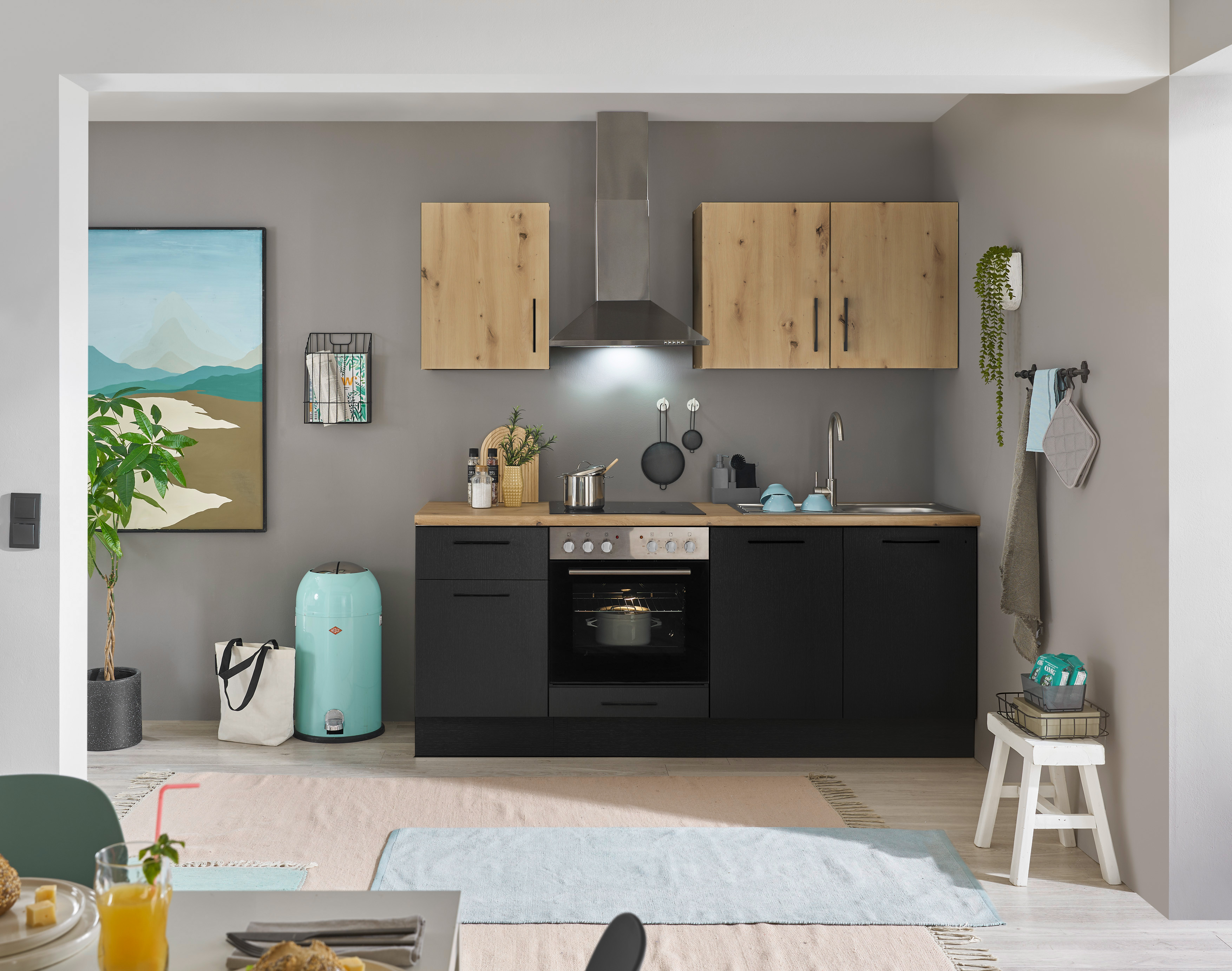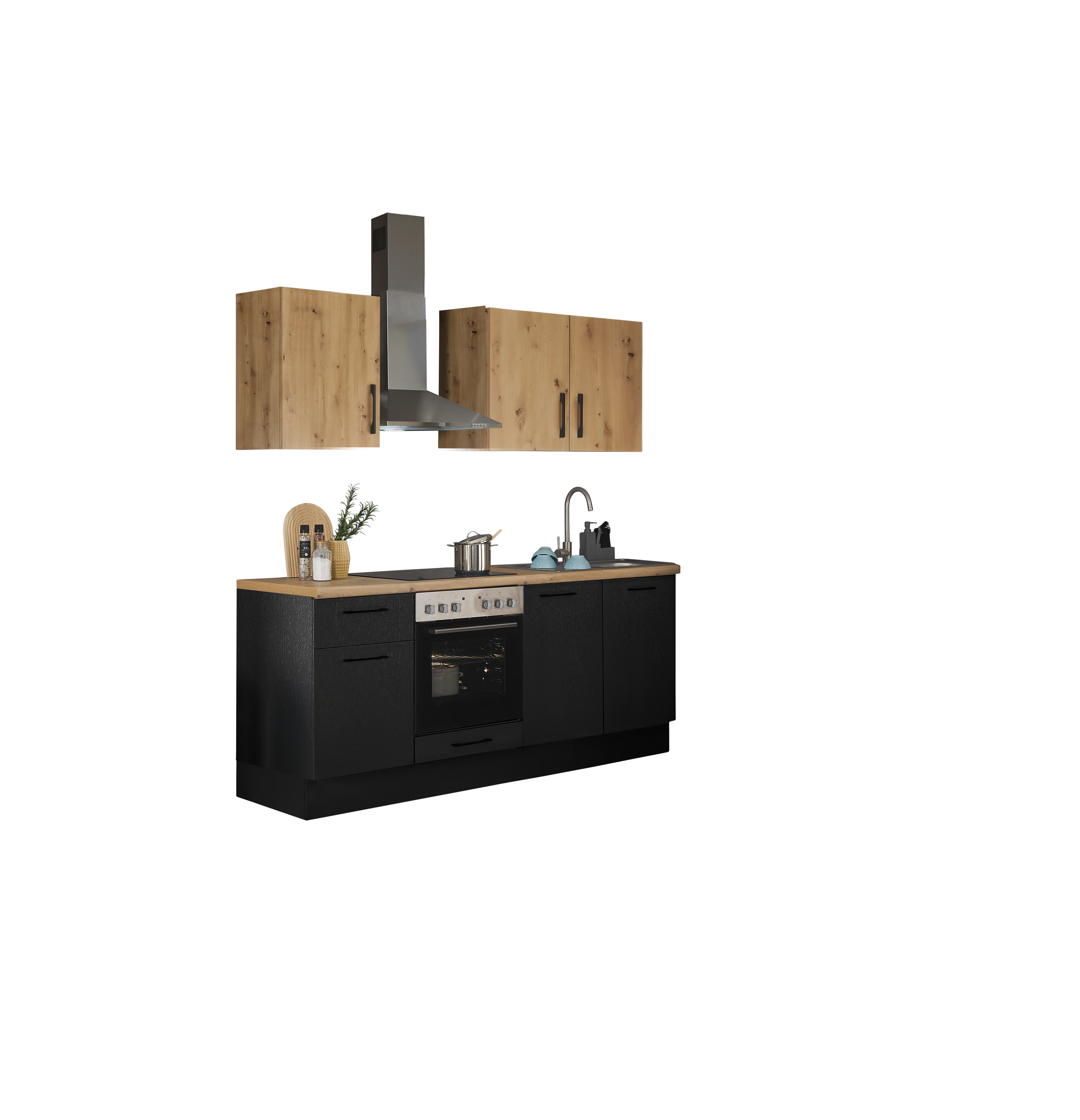 Façade et caisson : imprimé bois (woodprint) ton noir et panneau de particules surfacé mélaminé (PPSM) décor chêne Artisan