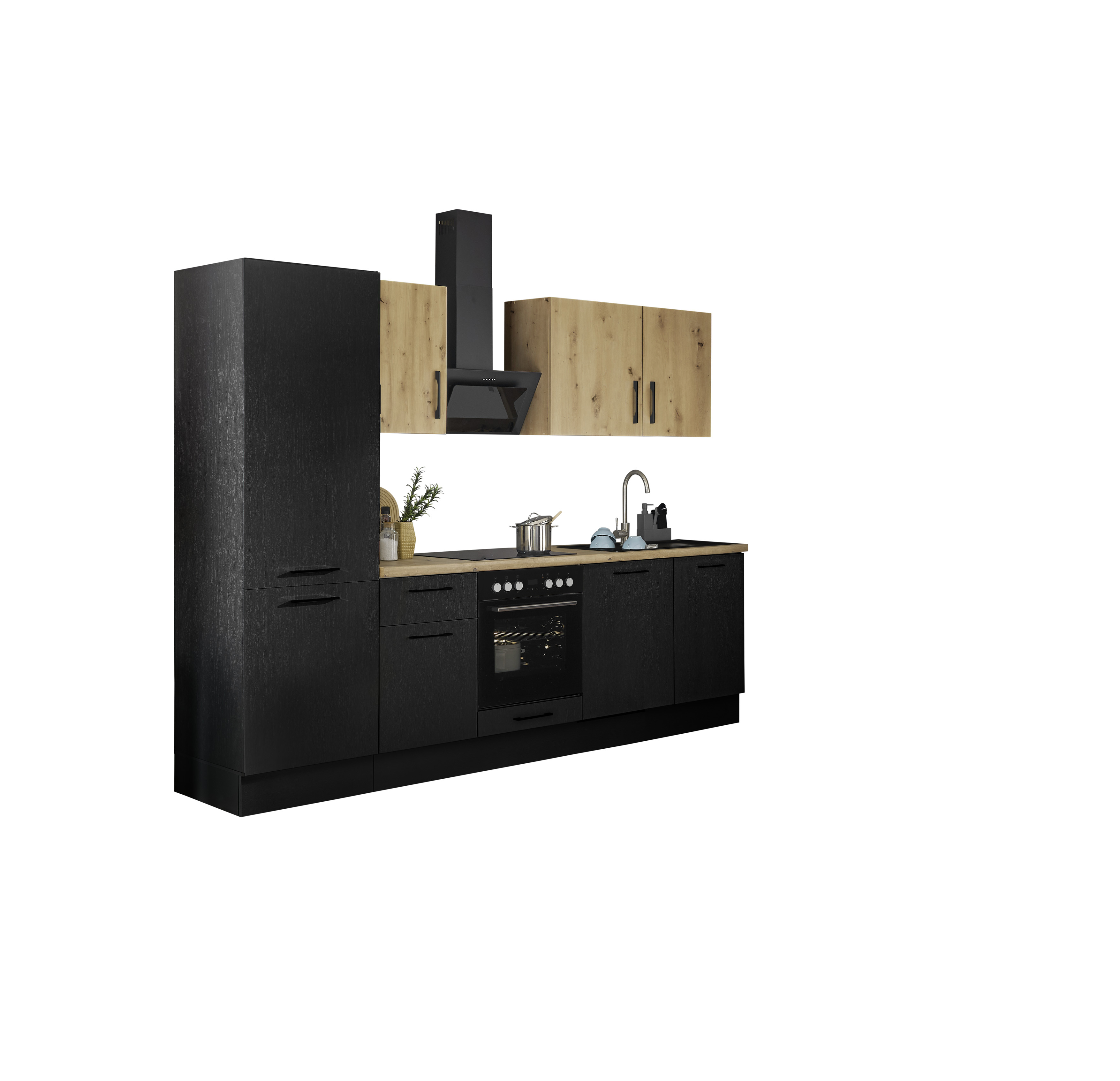 Façade et caisson : imprimé bois (woodprint) ton noir et panneau de particules surfacé mélaminé (PPSM) décor chêne Artisan