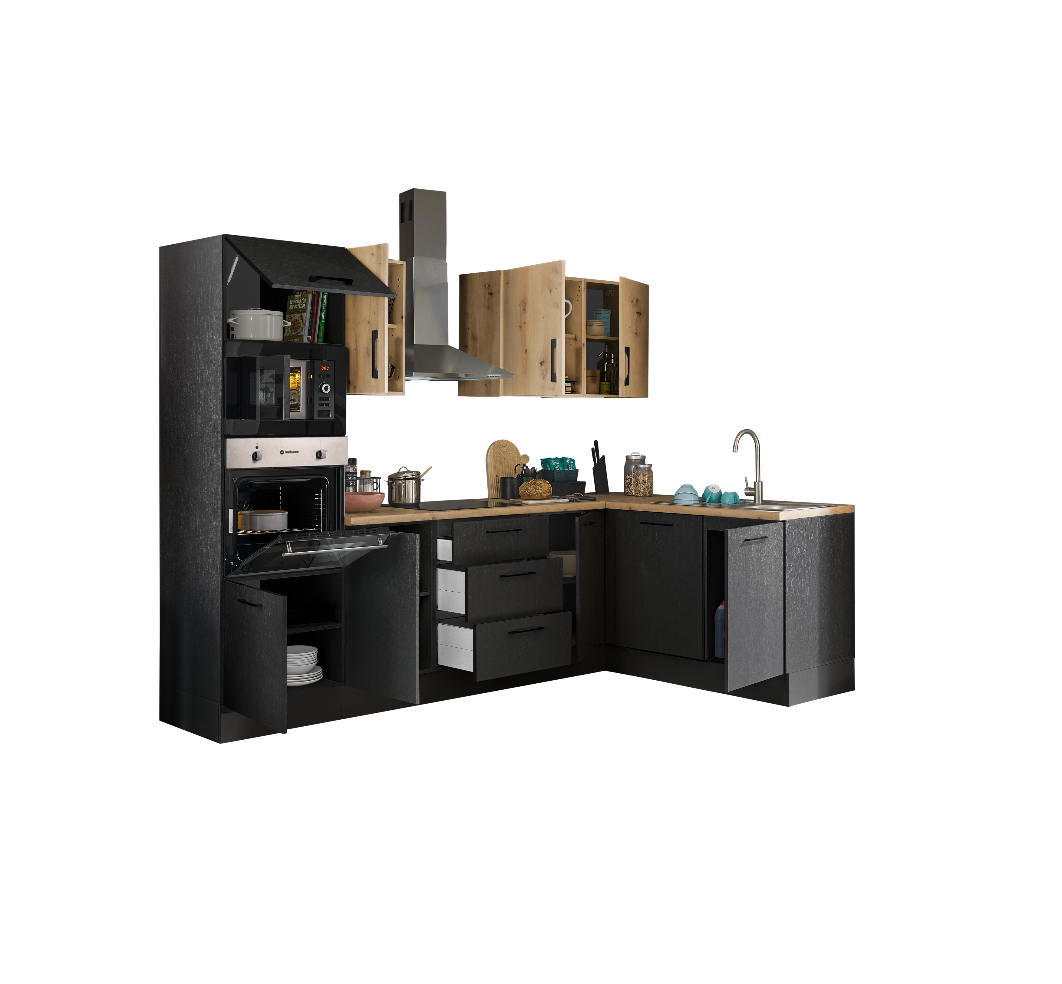 Bloc cuisine avec électroménager CORNWALL (cuisine d'angle-four-lave-vaisselle-micro-ondes) V