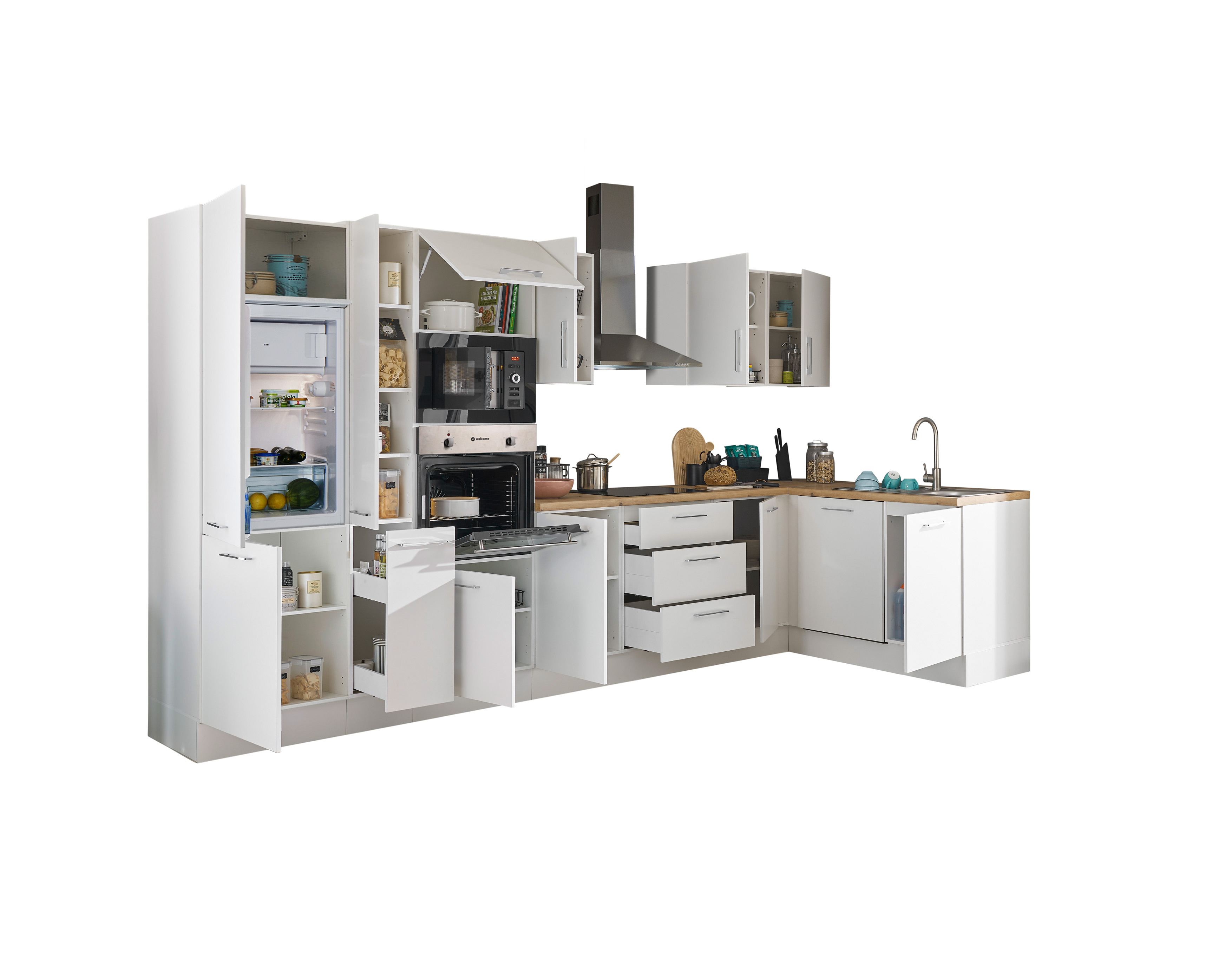 Bloc cuisine avec électroménager CORNWALL (cuisine d'angle-four-lave-vaisselle-réfrigérateur-micro-ondes-armoire coulissante) I