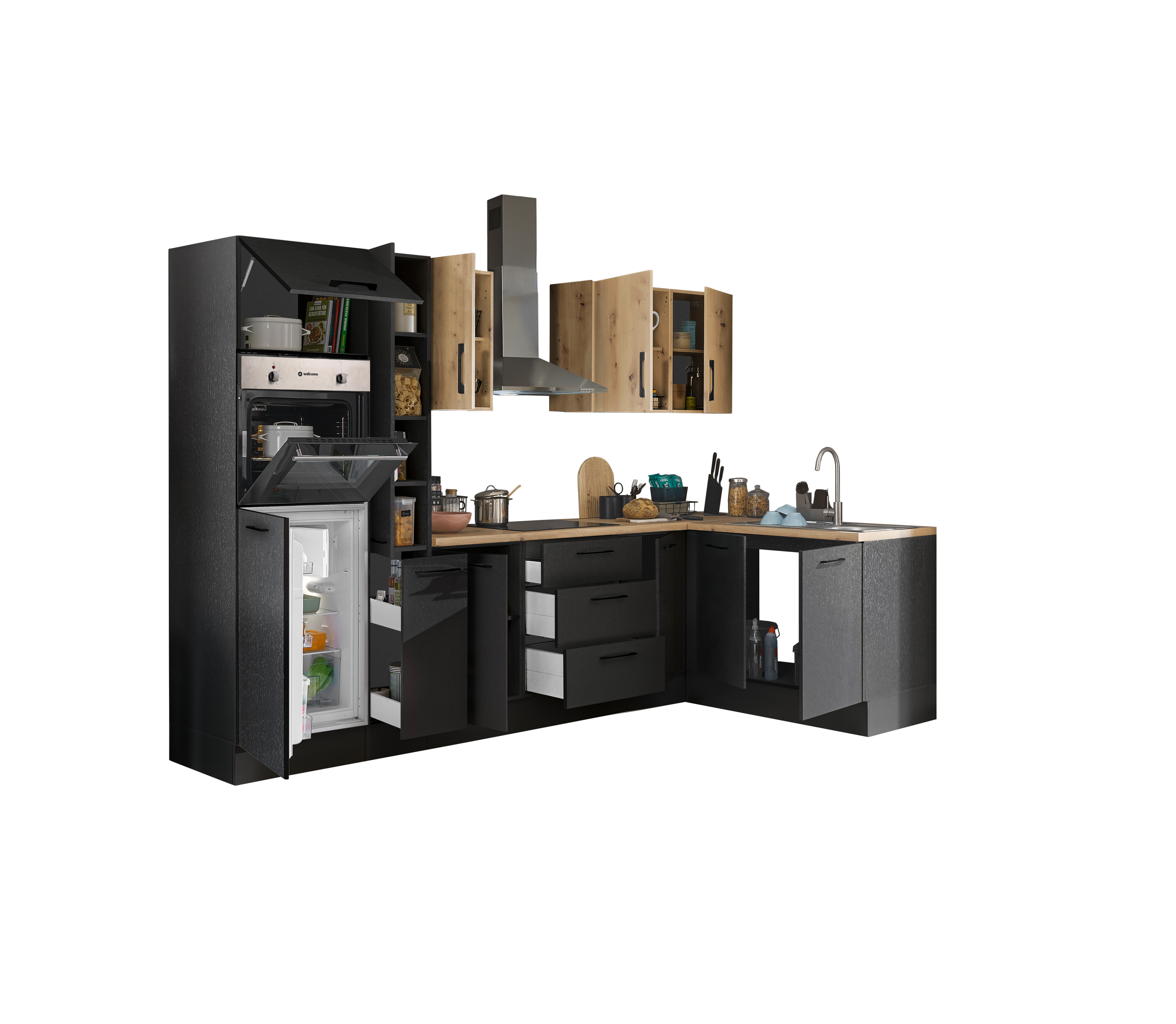 Bloc cuisine avec électroménager CORNWALL (cuisine d'angle-four-réfrigérateur-armoire coulissante) V