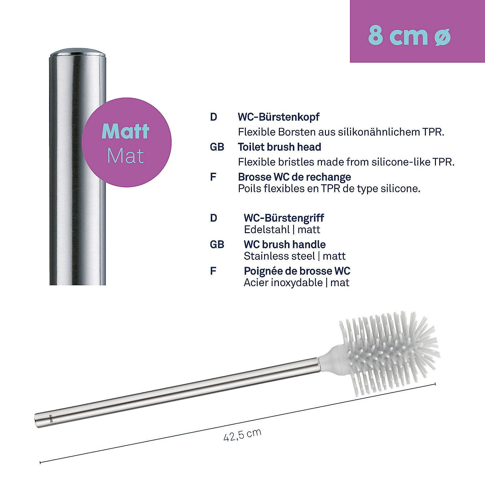 Composition : tête en polypropylène, poils en TPR, poignée en inox