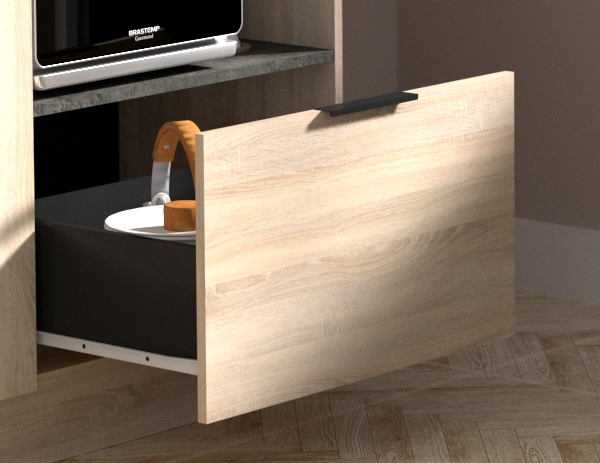 En bas à droite : 1 casier ouvert avec, en dessous, 1 grand tiroir