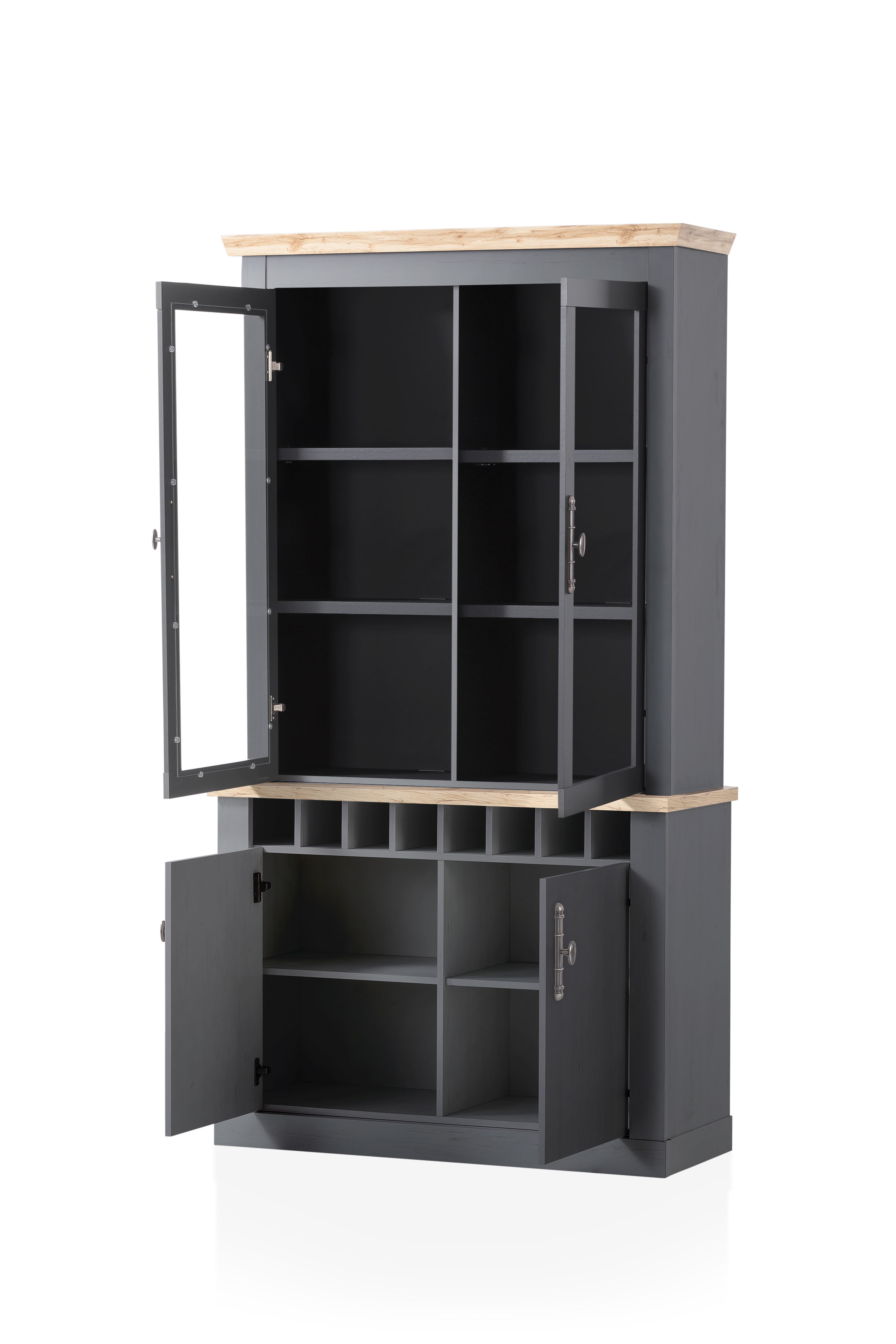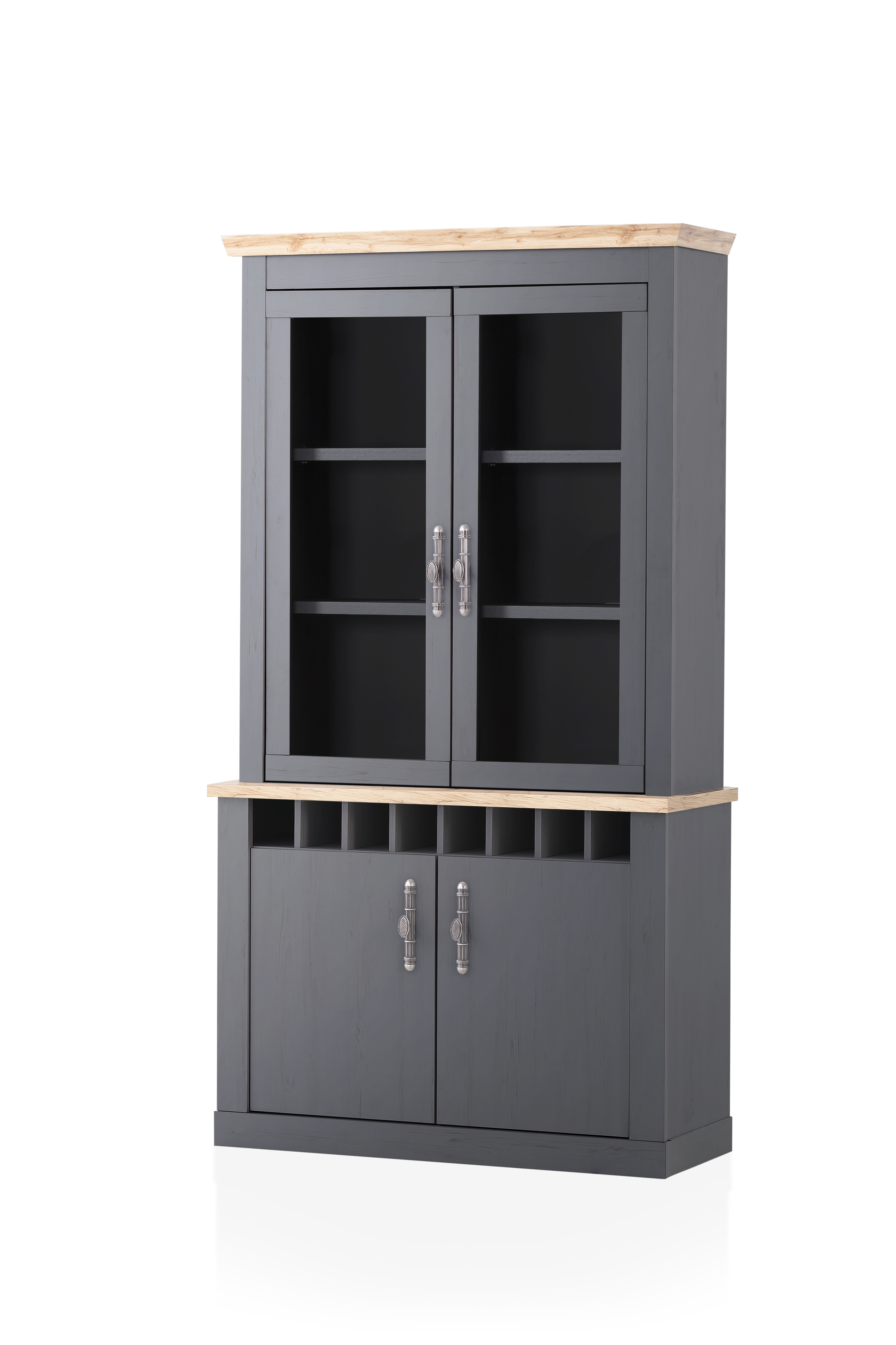 Partie supérieure avec 2 portes vitrées et, derrière chacune d’elles, 2 tablettes