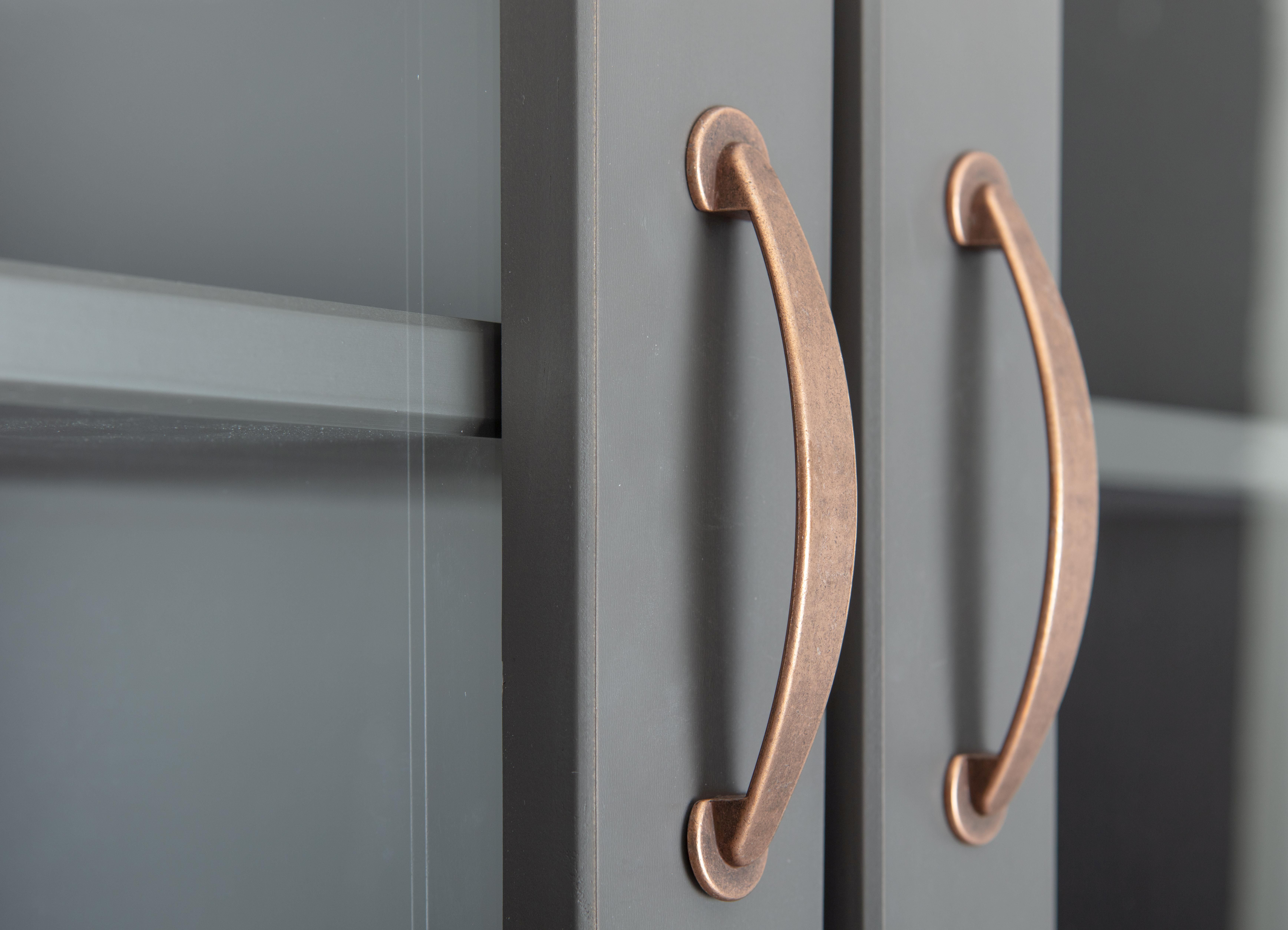 Avec deux tiroirs pratiques et plusieurs espaces de rangement dissimulés derrière deux grandes portes, il dispose de suffisamment de place pour la vaisselle, les ustensiles et autres objets. Deux portes vitrées ainsi qu’une casier ouvert au centre permettent de mettre en valeur des éléments décoratifs tels qu’un vase, de petits objets ou un vide-poche. Les poignées en métal couleur cuivre apporteront une touche élégante et moderne au buffet tout en attirant tous les regards.