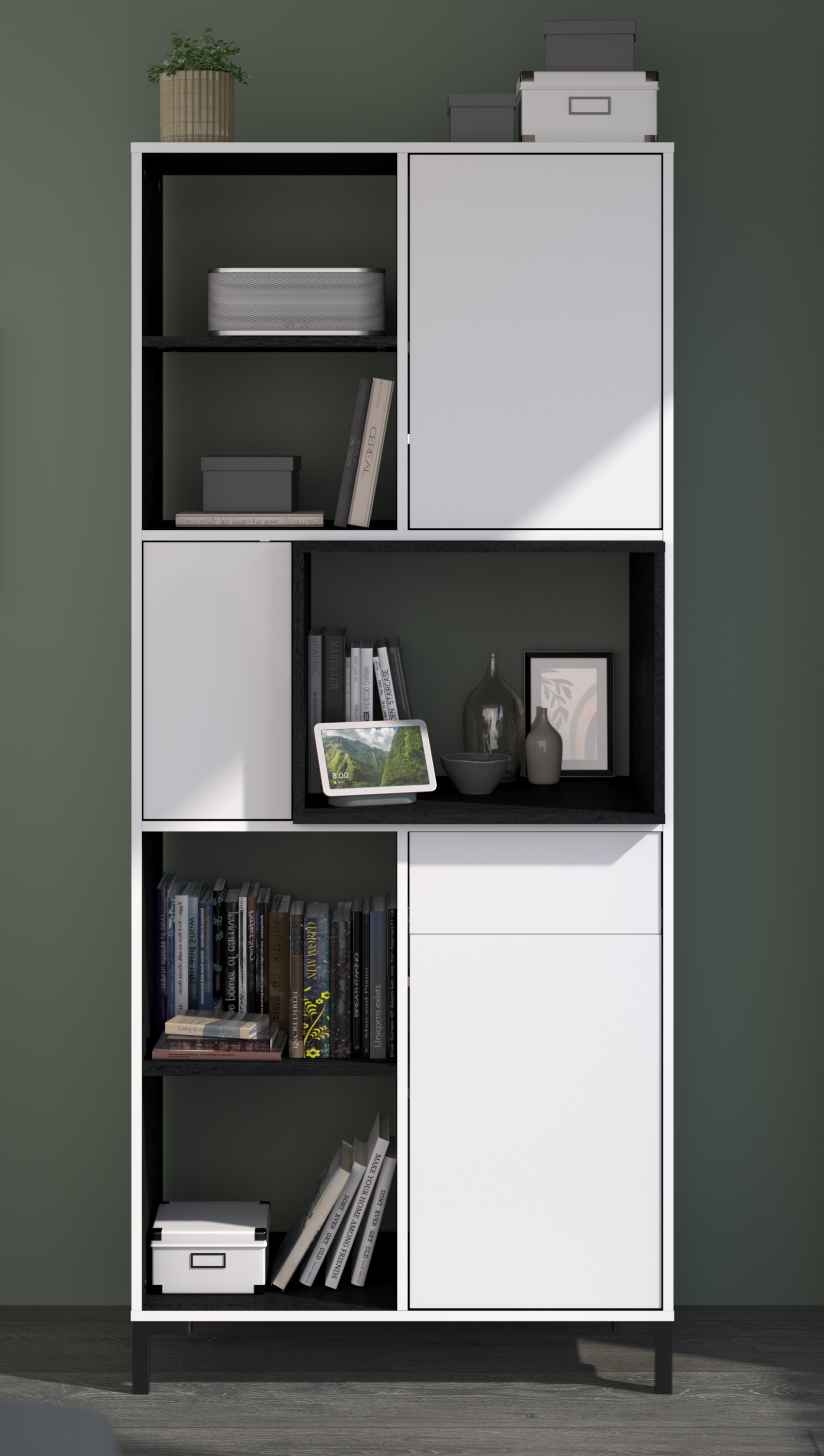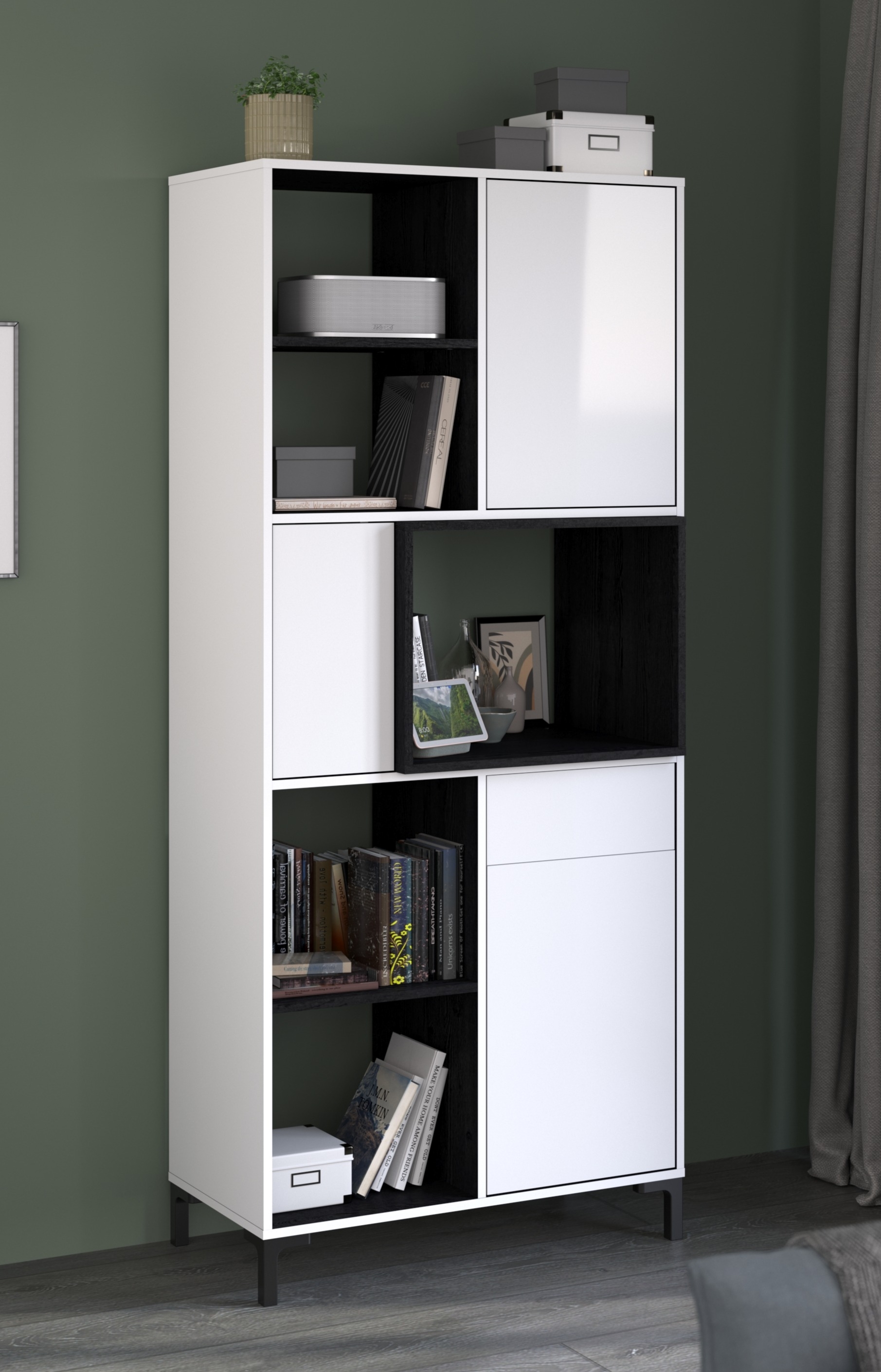 En bas : 2 casiers, 1 tiroir, 1 porte (derrière elle, 2 casiers)