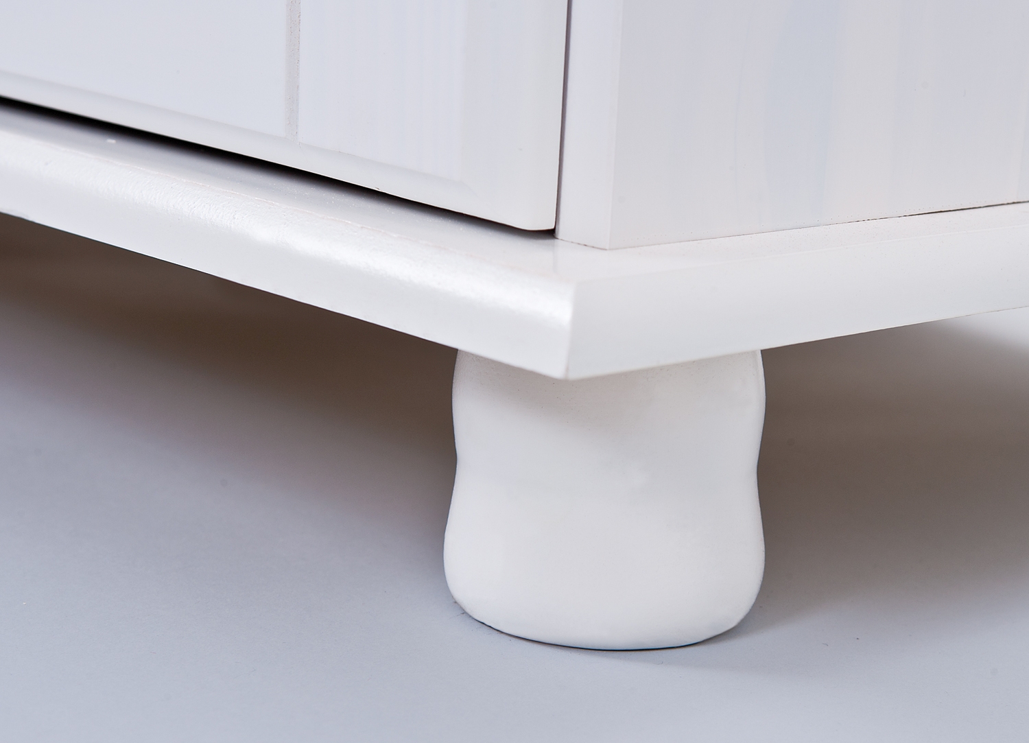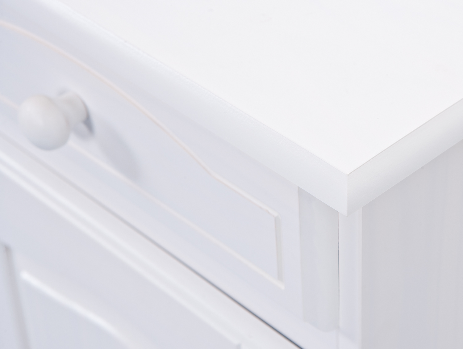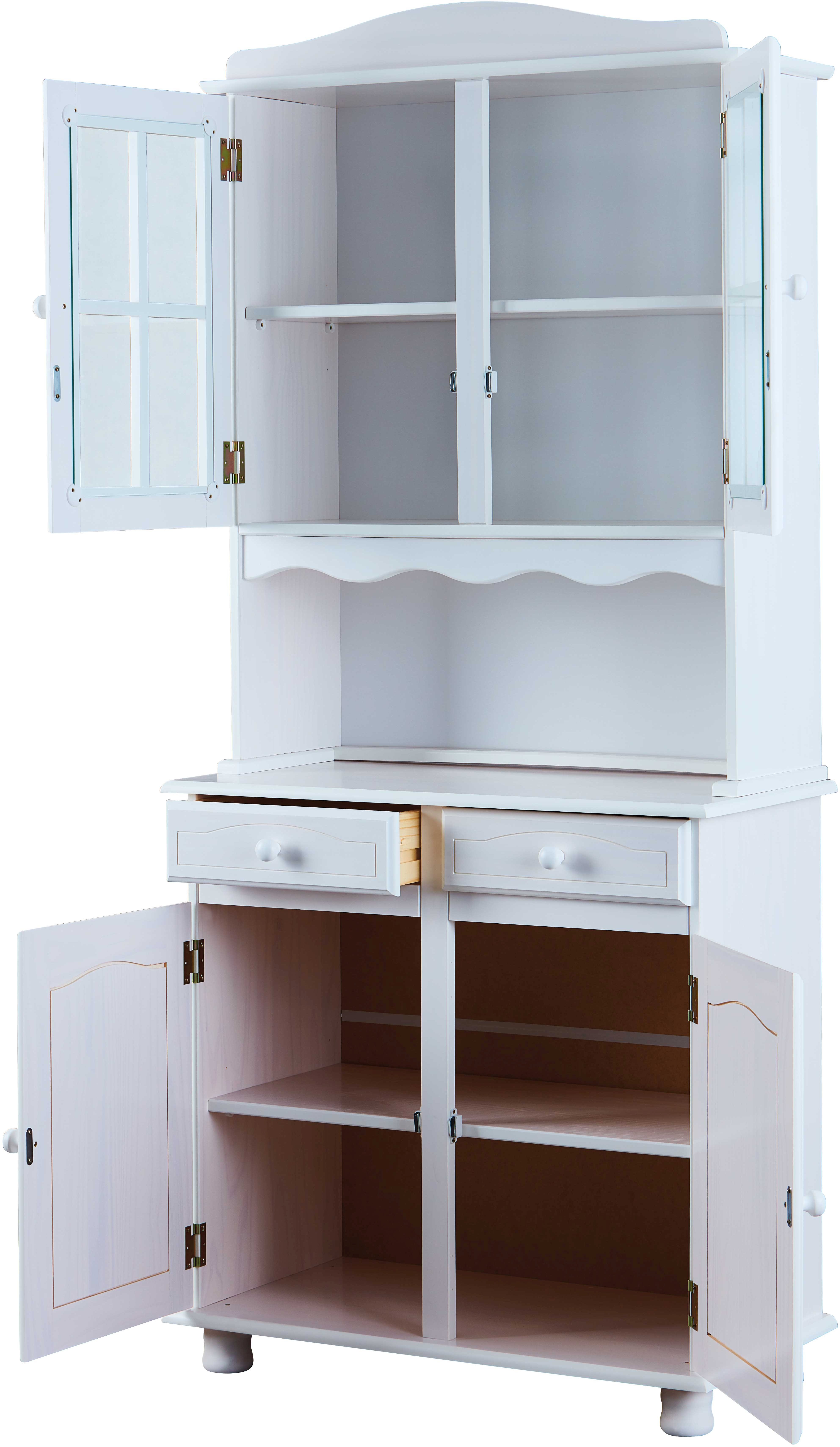 Le meuble est équipé de 2 tiroirs, 4 tablettes et 4 portes. Le bois massif de pin est légèrement laqué en blanc, ce qui permet de conserver les veines naturelles et chaleureuses du bois. Le vernis utilisé est à la fois protecteur, facile d’entretien et hydrofuge.