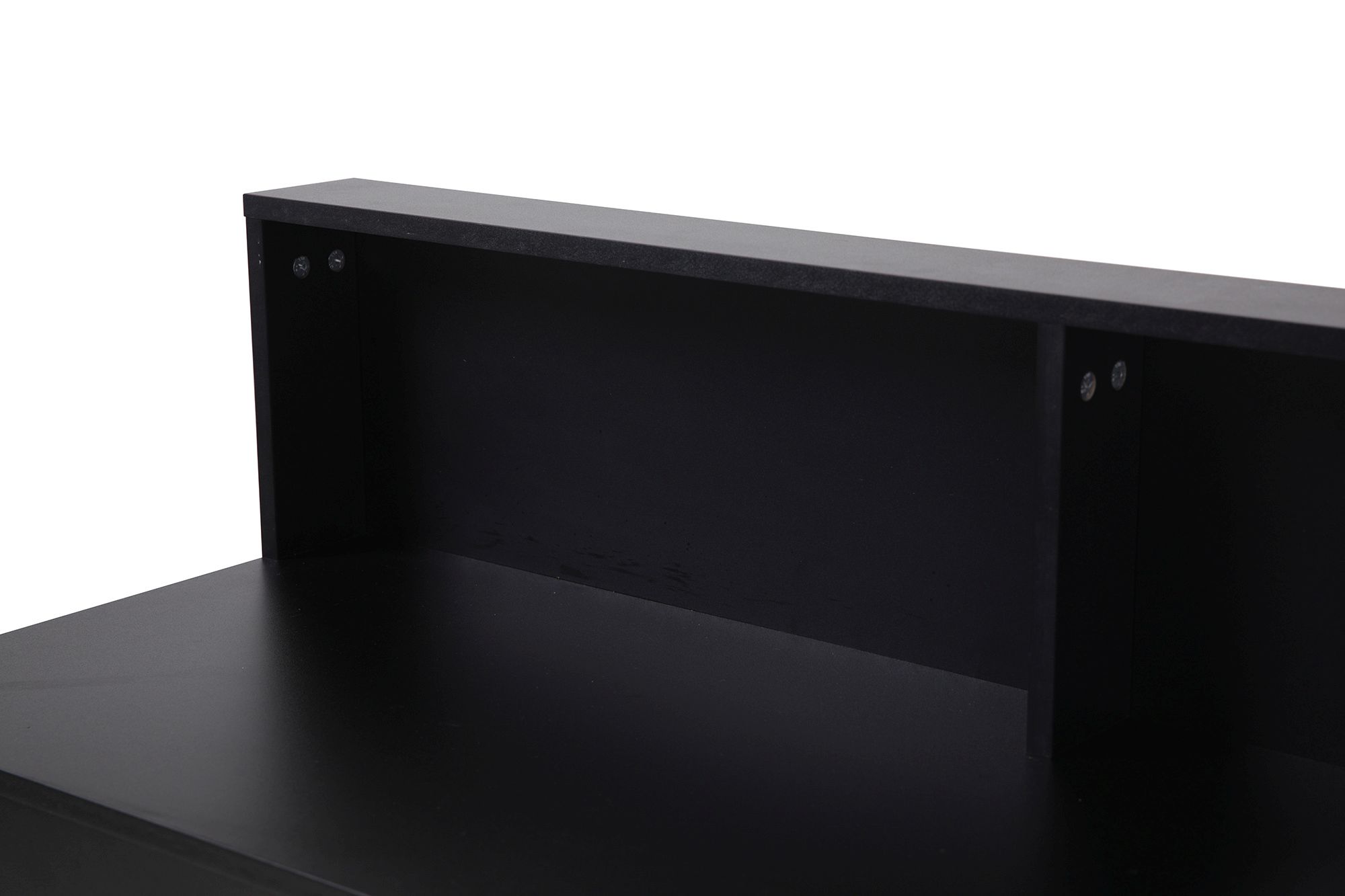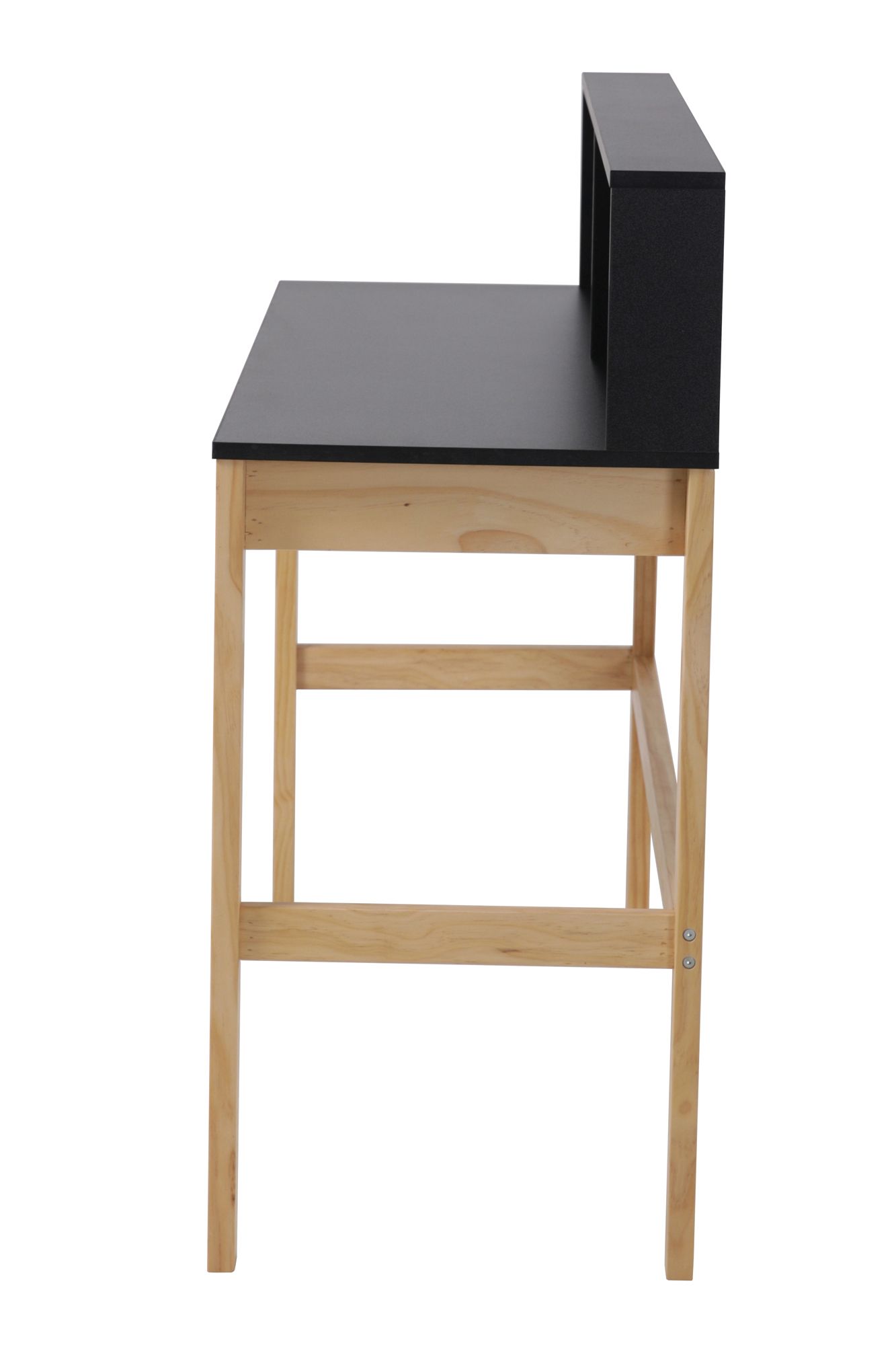 Ce bureau noir attirera tous les regards grâce au joli contraste formé par les pieds en bois clair. Une rehausse pratique permet d'empêcher les objets de tomber à l'arrière.