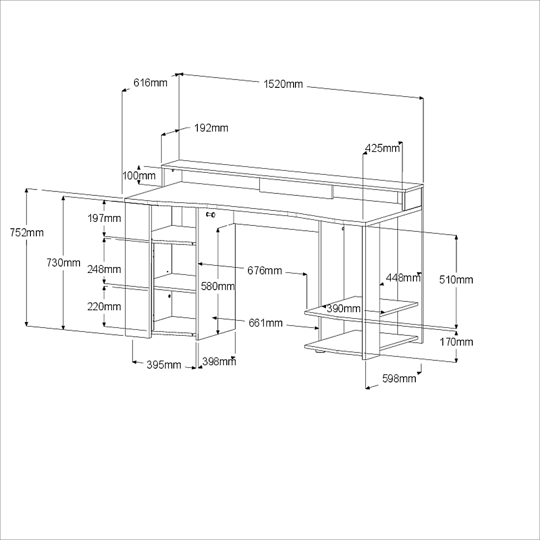 À gauche : 1 porte avec, derrière elle, 2 compartiments, au-dessus : 1 casier ouvert, avec support pour casque