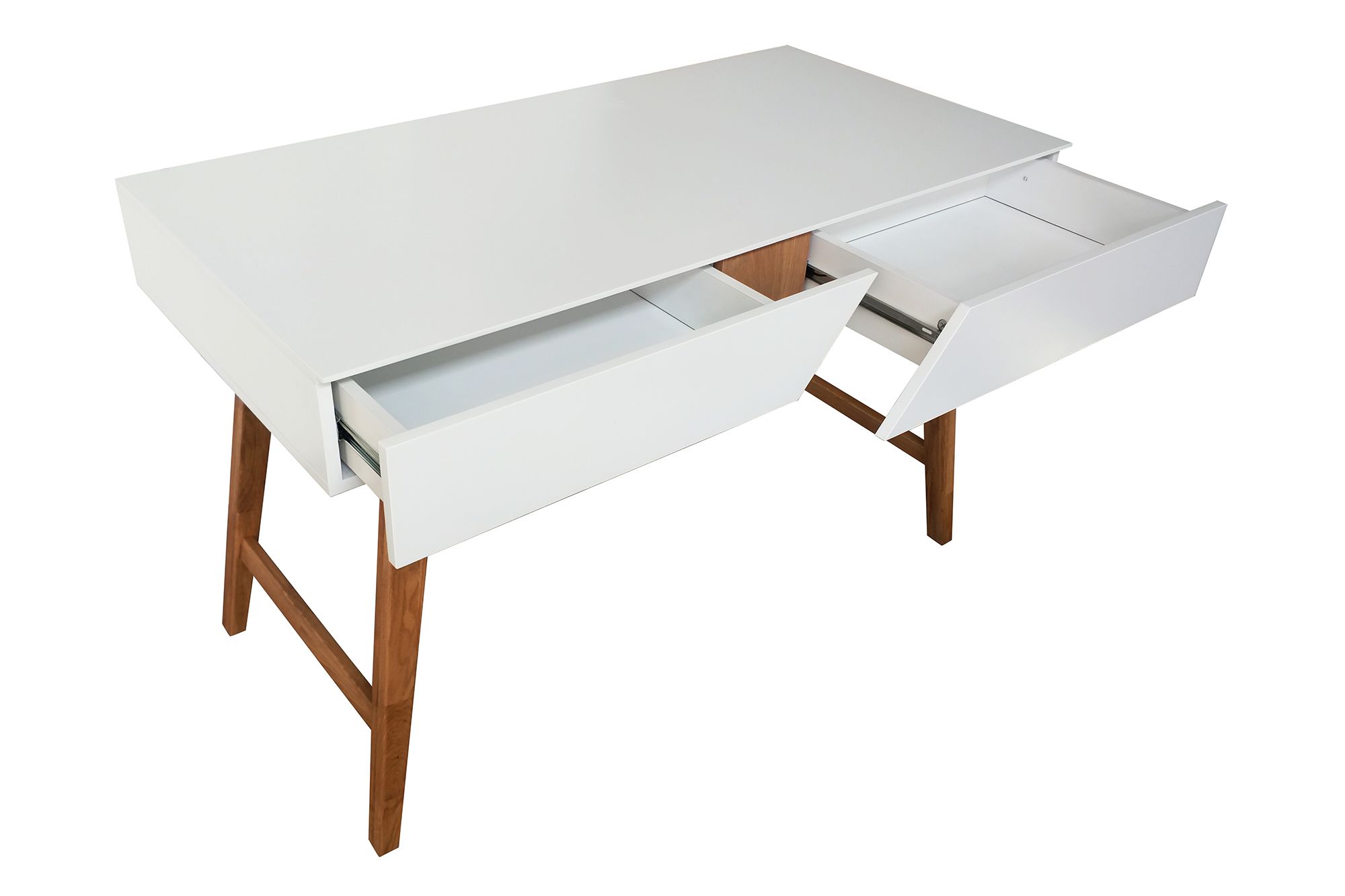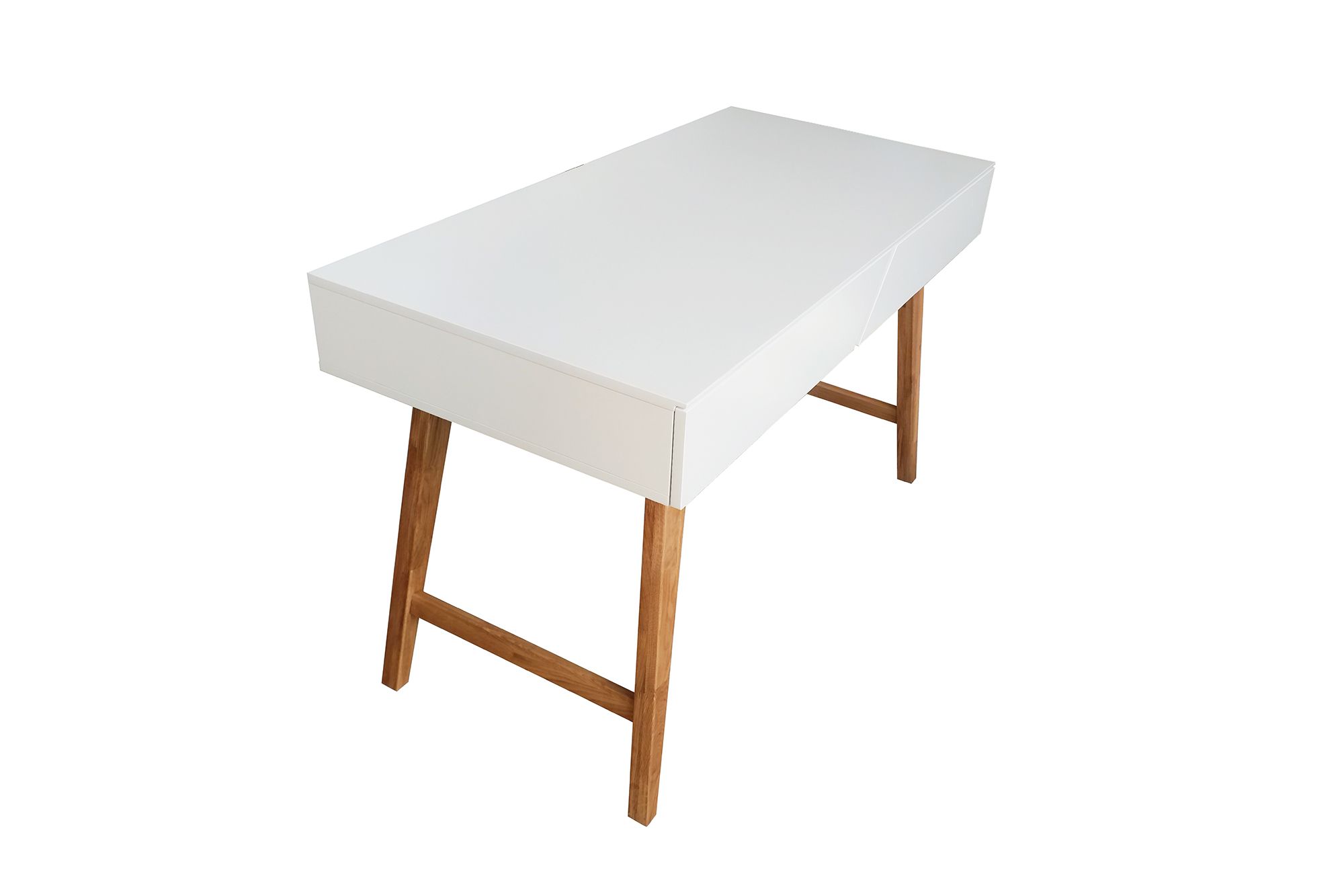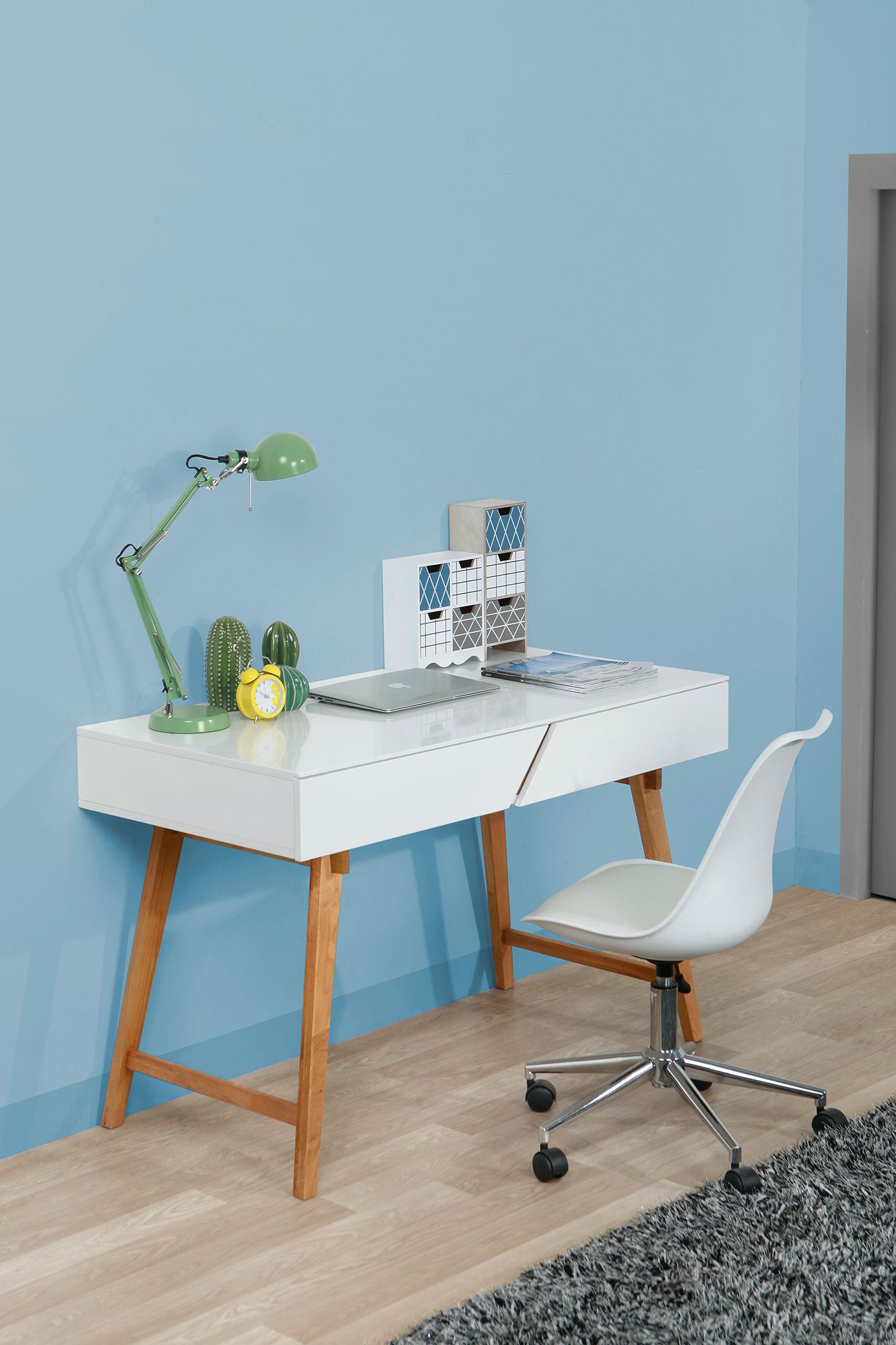 Ce bureau dans un design scandinave classique trouve facilement sa place dans toutes les pièces grâce à son faible encombrement. L'association de teintes dans un design nordique et moderne avec le caisson laqué ton blanc et le bois laissé à l'état naturel confèrent au bureau un charme particulier qui lui permet de ne pas sembler trop imposant, même dans les petites pièces. L'aspect moderne du bureau est également souligné par le design sans poignées des deux tiroirs.