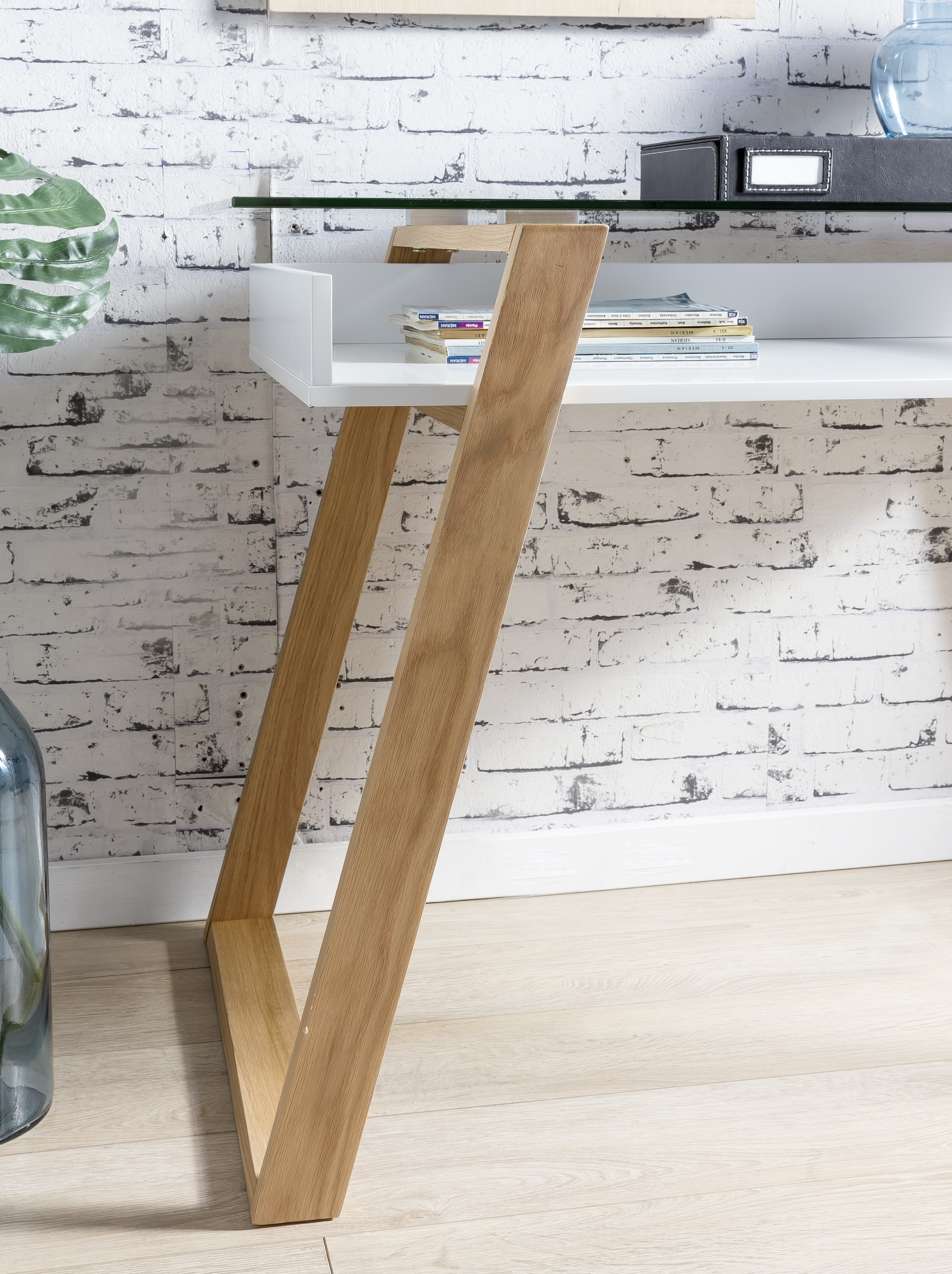 Créez dans votre pièce de travail une atmosphère agréable avec ce bureau de style scandinave. Sous le plateau en verre se trouve un casier ouvert dans lequel vous pourrez ranger divers accessoires de bureau et de travail. Ce casier est laqué ton blanc mat et s'harmonise parfaitement avec les pieds en biais plaqués en bois de chêne qui garantissent une excellente stabilité. Ce bureau n'est pas seulement chic : il est aussi pratique. Les meubles dans un design scandinave ont de plus en plus la cote. Faites entrer une touche scandinave dans votre intérieur.