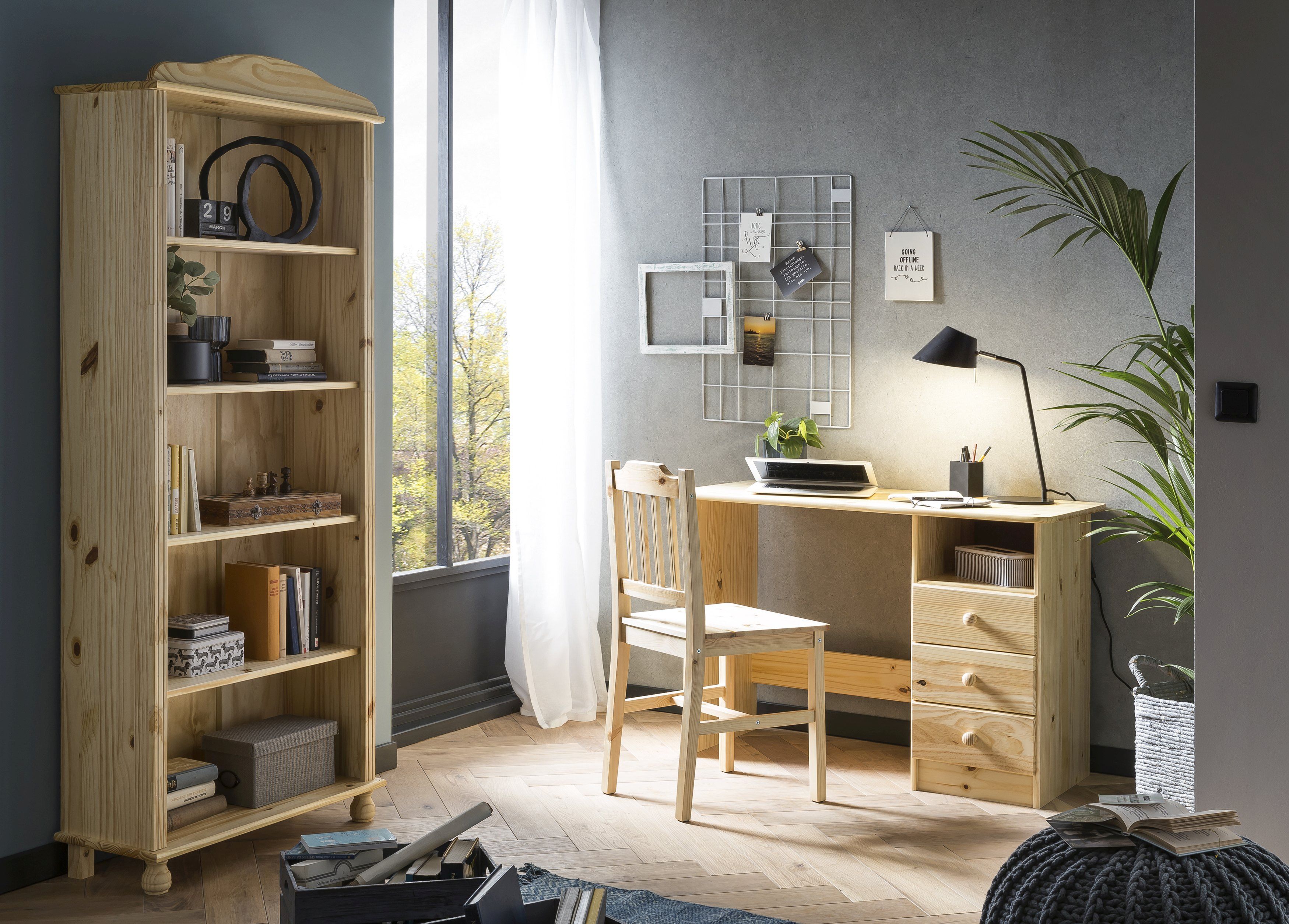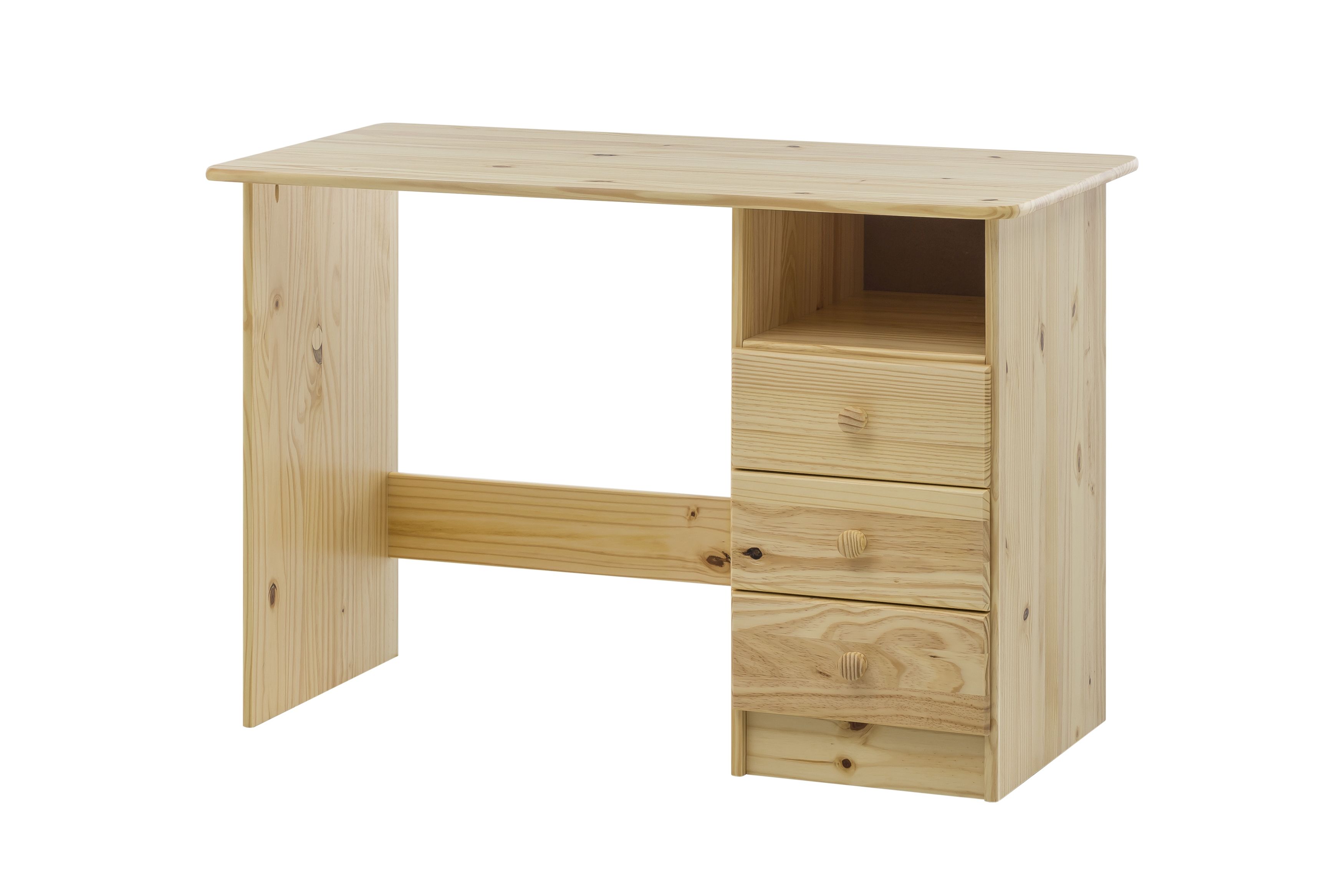Malgré son faible encombrement, ce bureau doté de trois tiroirs et d'un casier ouvert dispose d'un grand espace de rangement et d'une belle surface pour poser des objets. Le pin massif est résistant à l'usage quotidien et à l'usure qui y est liée. Le bureau séduit en outre par son design sobre et sa taille compacte.