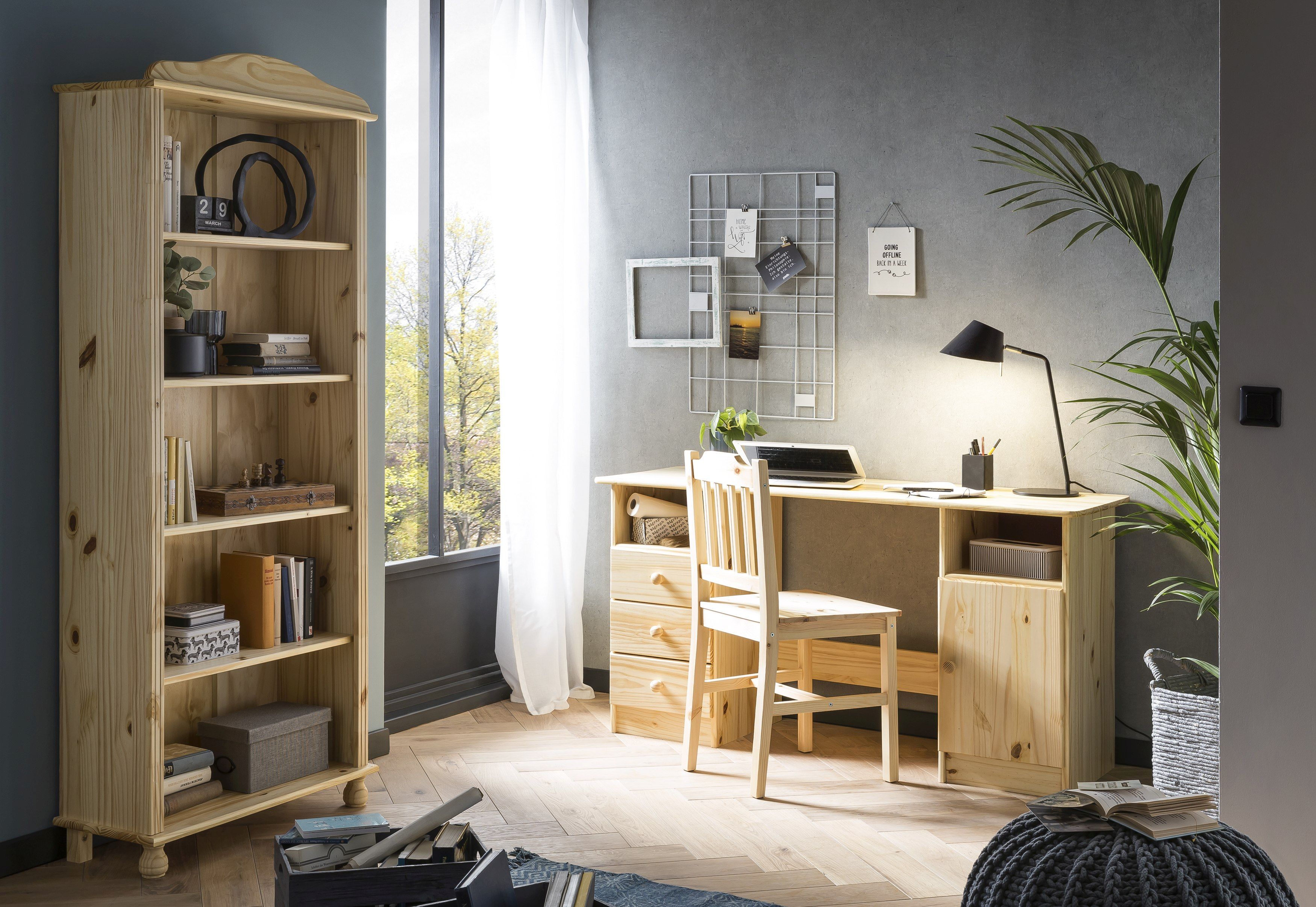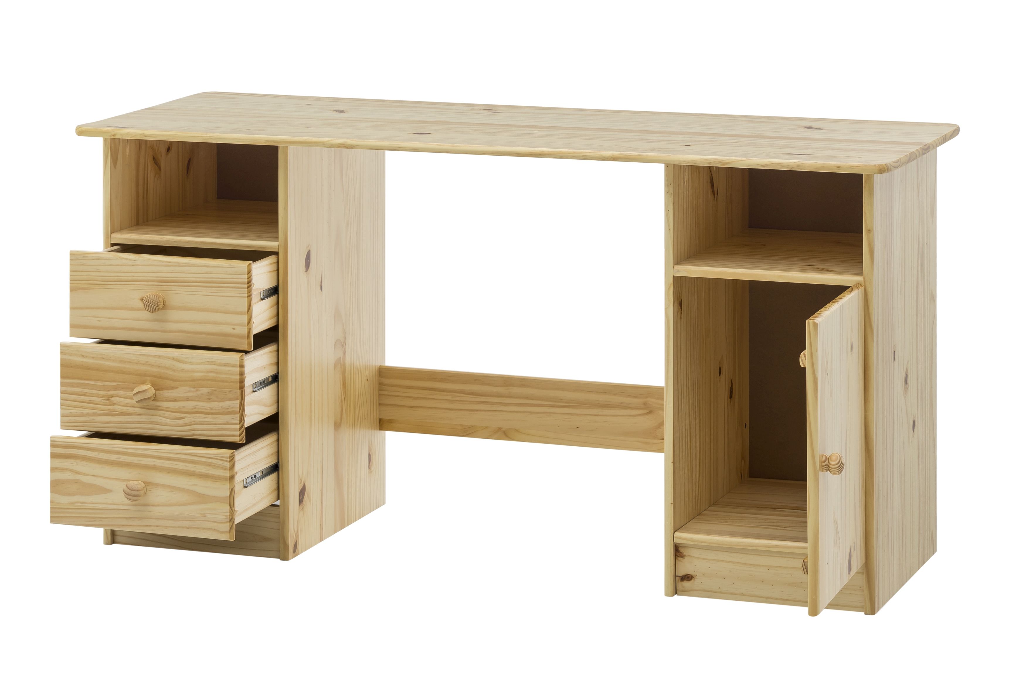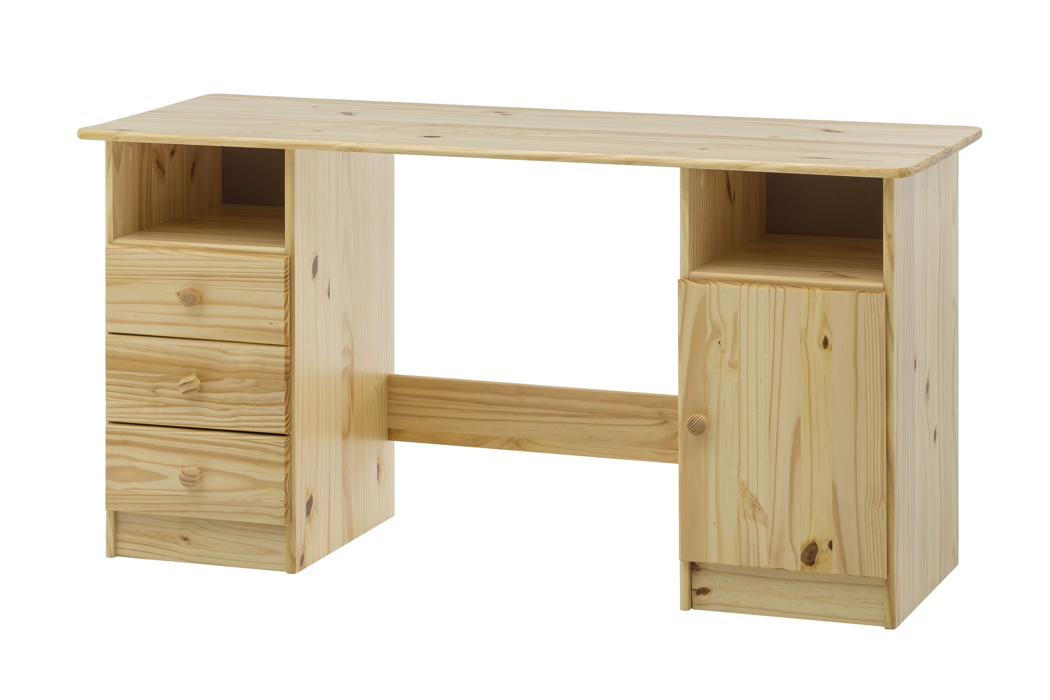 Ce bureau doté de trois tiroirs, d'un compartiment avec porte et de deux casiers ouverts dispose d'un grand espace de rangement. Le pin massif est résistant à l'usage quotidien et à l'usure qui y est liée. Le bureau séduit en outre par son design sobre et sa taille compacte.