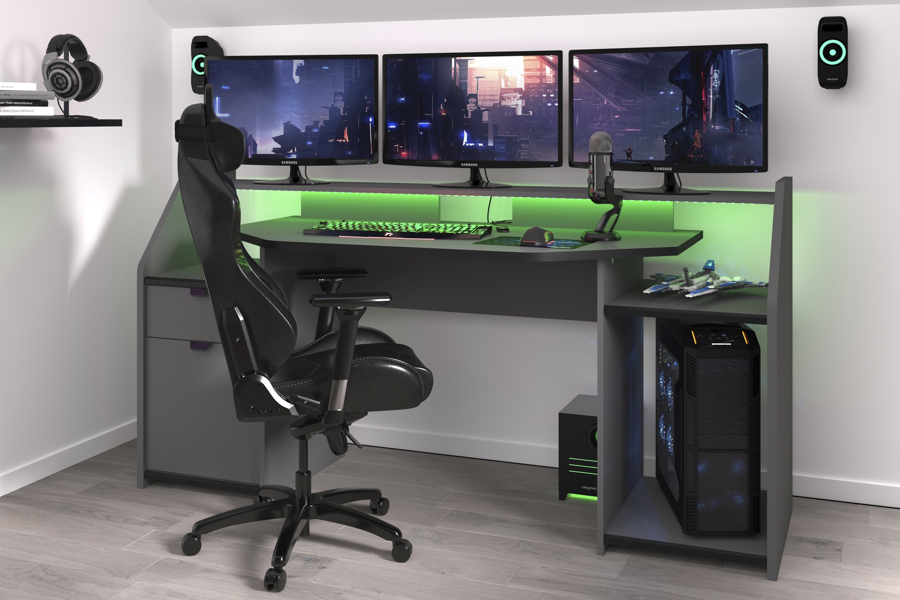 en haut : grande surface pour 2 - 3 écrans et accessoires ; en -dessous : grand plan de travail, par ex. pour le clavier