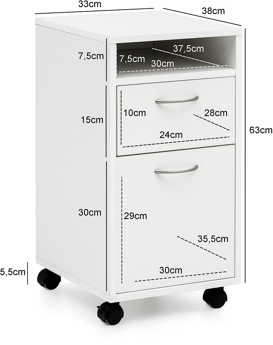 • Deux roulettes pour sols durs garantissent une excellente stabilité une fois le caisson de rangement positionné