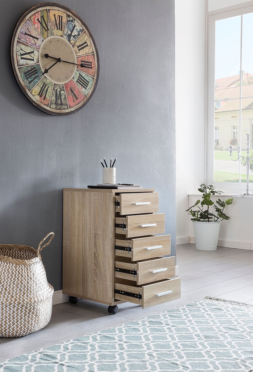 - ASSISTANCE DE BUREAU ✔ Stylos, perforatrice, agrafeuse, etc. sont omniprésents au bureau. Mais pour que ces outils indispensables ne traînent pas sur le bureau, cet élément de rangement à roulettes chic dispose de cinq tiroirs et donc de suffisamment d’espace pour accueillir ces accessoires de bureau.