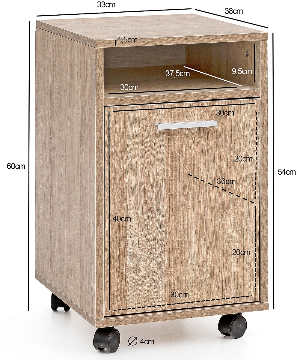- ASSISTANCE DE BUREAU ✔ Stylos, perforatrice, agrafeuse, etc. sont omniprésents au bureau. Pour que ces outils indispensables ne traînent pas sur le bureau, cet élément de rangement à roulettes ultra chic dispose de deux casiers derrière la porte et d'un plateau spacieux. Il offre ainsi une place suffisante pour ranger les fournitures de bureau. Les blocs A4 tiennent également dans les casiers derrière la porte ou au niveau du casier ouvert. Tout est donc bien rangé.