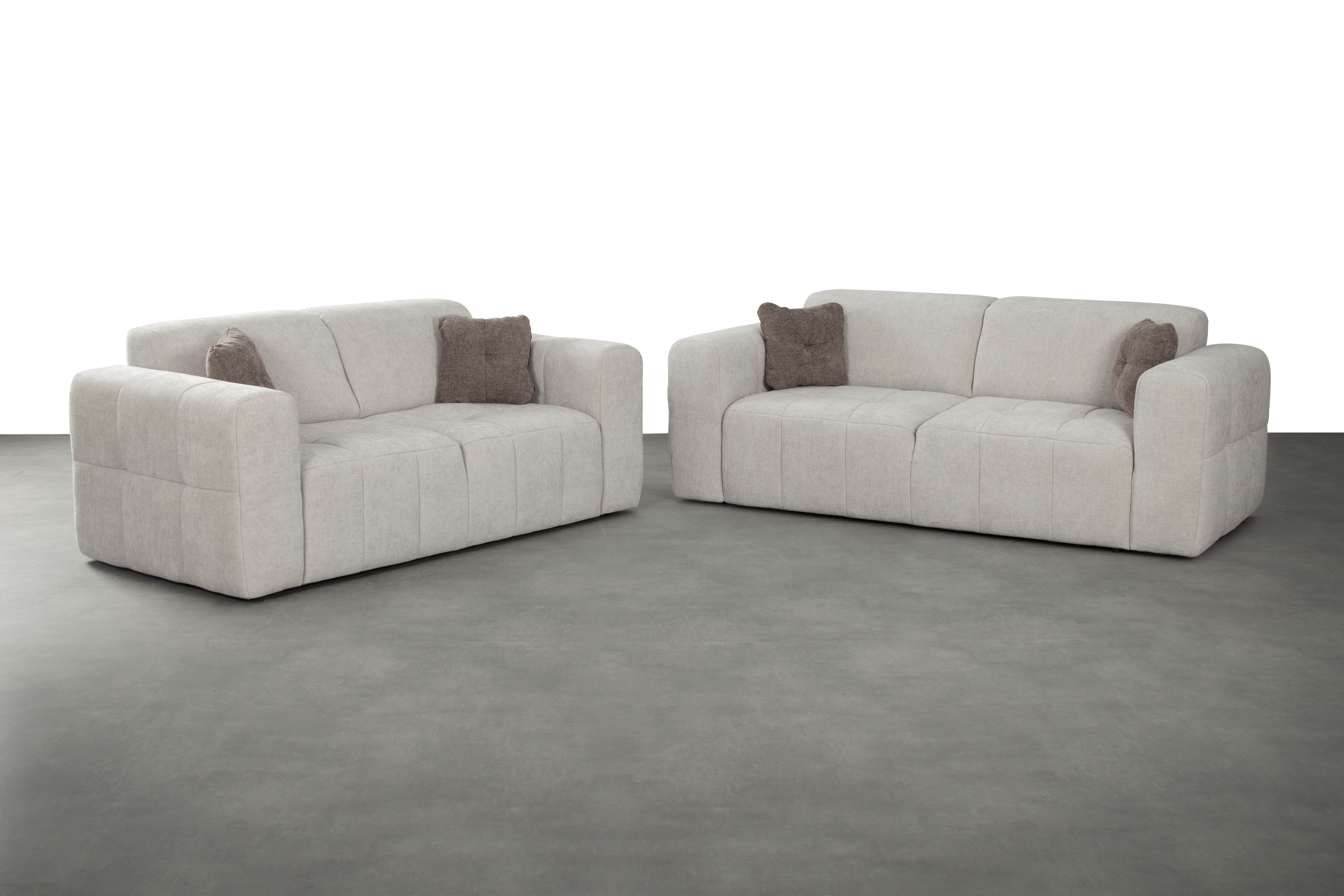 Revêtement : canapé 2 places en tissu ton Dove 6174 beige-argent 100% polyester, coussins décoratifs en tissu Stone 6170 ton moka 100% polyester