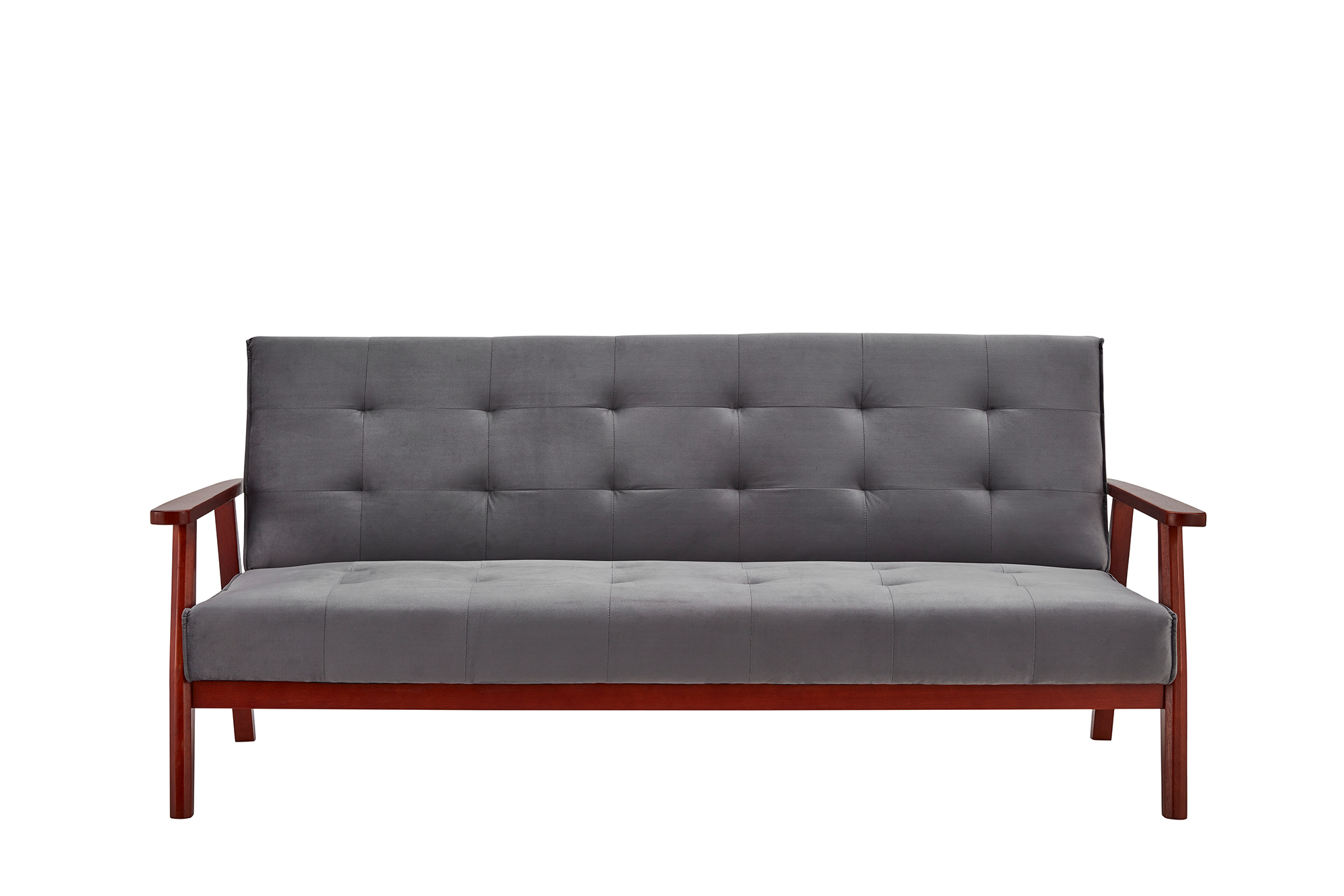 Le canapé convertible à accoudoirs de style scandinave arbore un revêtement élégant aspect velours et une structure robuste en bois massif d’eucalyptus. Ce modèle séduit particulièrement par ses 3 fonctions différentes permettant de s’asseoir, se relaxer et s’allonger. La fonction de rabattement du dossier à 60° permet de placer le canapé en position relax, tandis que la fonction à 180° permet d’utiliser la position allongée. Deux supports au niveau du dossier assurent une bonne stabilité lorsque le canapé est entièrement déplié. La structure en bois massif d’eucalyptus ton merisier garantit non seulement une bonne stabilité, mais offre également un superbe contraste avec le tissu velours. Grâce aux fonctions assise, relax et couchage, ainsi qu'aux accoudoirs, vous bénéficierez d’un niveau de détente optimal. Ce petit bijou en matière de design sera non seulement un élément phare dans votre intérieur, mais également votre nouvel espace de bien-être.