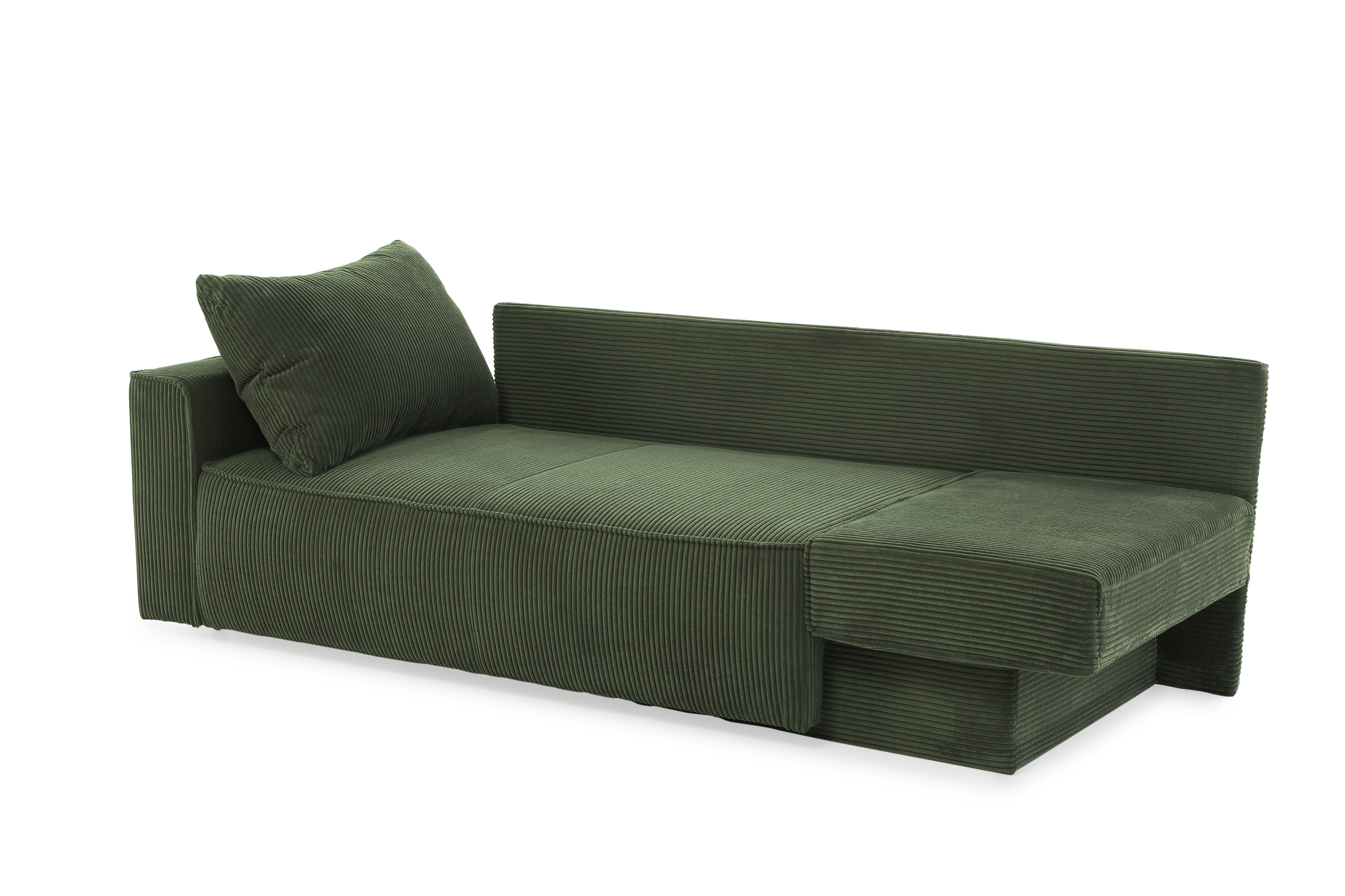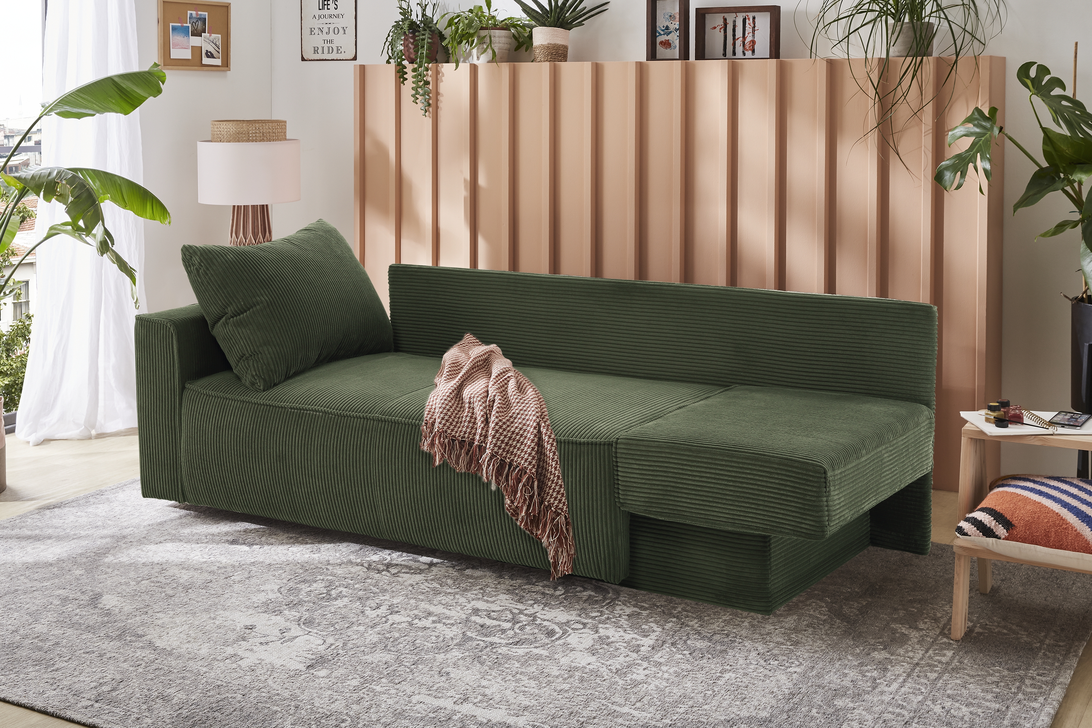 Le canapé se transforme facilement en lit en faisant coulisser l’assise latéralement à l’aide de la dragonne et en basculant l’accoudoir.